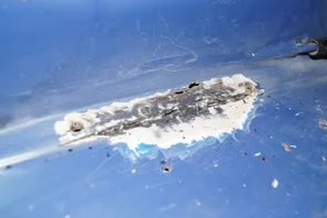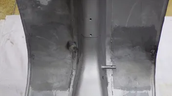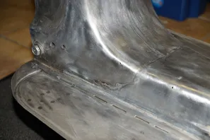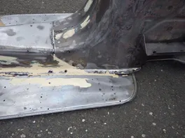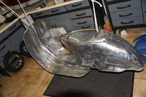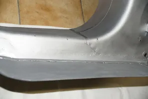 Da durch das Ansetzten des Bodenblechs eine Naht entstanden war überzog ich diese mit drei Lagen Glasfasermatten und Epoxydharz. Ich hoffe dies wird halten - die restliche Verpa spachtelte ich dann mit einer pulverbeschichtungsfähigen spachtelmasse von Rotil.