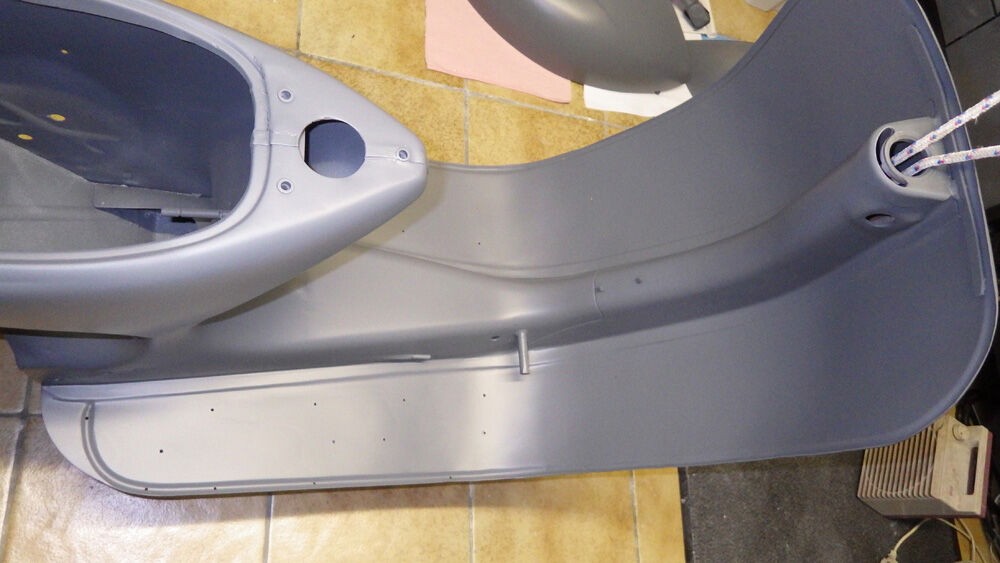 ...die Vespa ist größtenteils abgeschliffen und spiegelglatt geworden, bis auf ein paar kleine Stellen, die nochmals oberflächlich gespachtelt werden müssen.