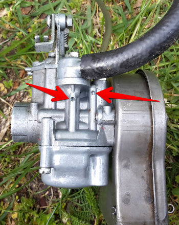 zum Frühlingsbeginn wollte ich wieder meine Vespa V50 Special starten und habe dabei festgestellt, dass sie massiv Benzin verliert (läuft unten richtig heraus). Im Herbst hatte sie noch problemlos funktioniert. Nach einigem Herumgeschraube habe ich nun die undichte Stelle festgestellt. Es ist der Vergaser und zwar läuft das Benzin aus den beiden Löchern heraus, die ich auf dem Foto markiert habe. Kann mir jemand sagen, warum das Benzin hier herausläuft und wie ich sie wieder dicht bekomme?