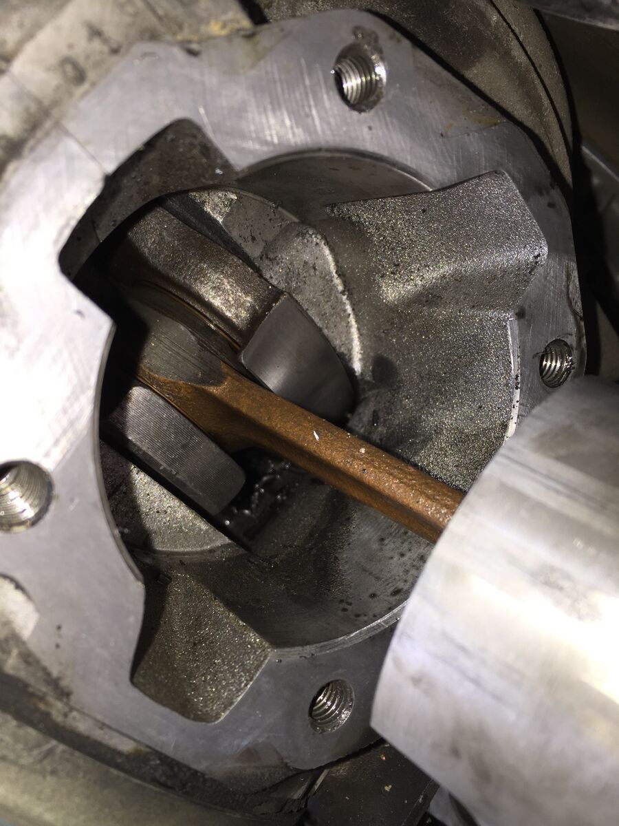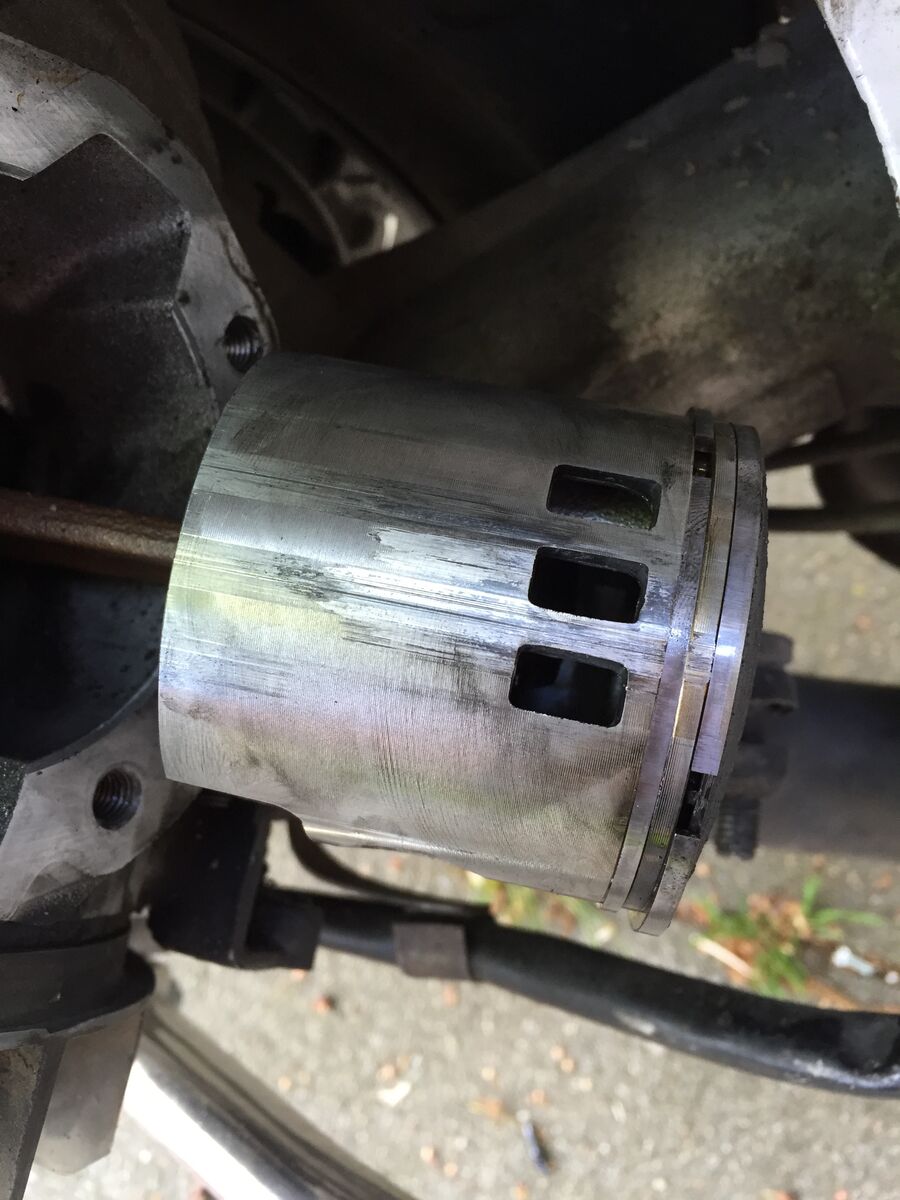 Der Kolben (siehe Fotos) sieht zwar komisch aus und hat auch einen Macke oder aber klemmt nicht. Der Kolben steht am OT und ich kann den Zylinder an den Stehbolzen bewegen, klemmt also meiner Meinung nach nichts.