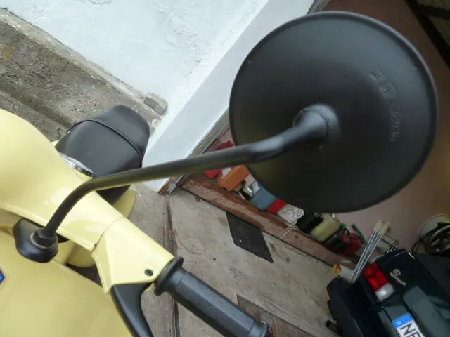 Zunächst der Rückspiegel..war ein gebrauchter der in Ebay kleinanzeigen gefunden wurde,Chrom war im A... :+1 ..aber wohlte ich auch nicht hautsache Spiegelglas war ok,und mit dem RICHTIGEN Halter am Lenker..DENN ich fand NEU keinen der RICHTIG passte auch der von dedm Gebrauchten Spiegel muste ich etwas modifizieren!!Vieleicht hat ja einer von euch mal BILD wo RICHTIGER halter zu sehn ist..--bräuchte ja noch einen für andere Vespa..