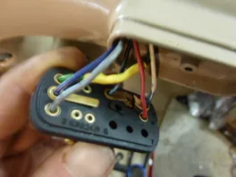 Rotes Kabel (Kill) an Steckplatz M ,Weisses Kabel(Hupe) an 8 (gleich daneben sieht man etwas schlecht das es Weis ist mit farbklecks), Schwarzes Kabel an Masse (Mittig da wo Hupenkontakt hochgebogen), Da ich 2!! Grüne Kabel raus hatte hab ich die beiden zusammengemacht in 1 kabel verlötet(geht schöner in die schmalen Steckerbuchsen rein!) und das dann auf 1 gemacht daneben dann Violettes (Frontlicht) und Graues (Rücklicht)...fertig!!
