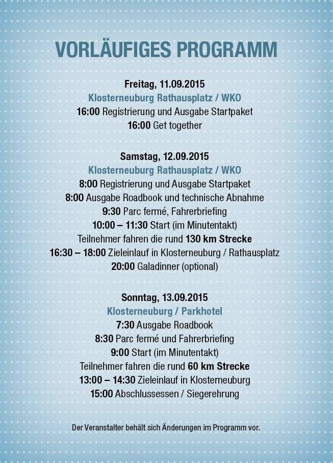 Ihr könnt den Start live miterleben und zwar am Sa. den 12. September ab 9:30 - Rathausplatz Klosterneuburg und am So. den 13. September ab 9:30 am Gelände des Park Inn Hotels in Klosterneuburg (Neben dem Happy Land Parkplatz).Ihr könnt ja den Tag bei Schönwetter für eine kleine Ausfahrt nutzen und den Start nach Klosterneuburg verlegen.