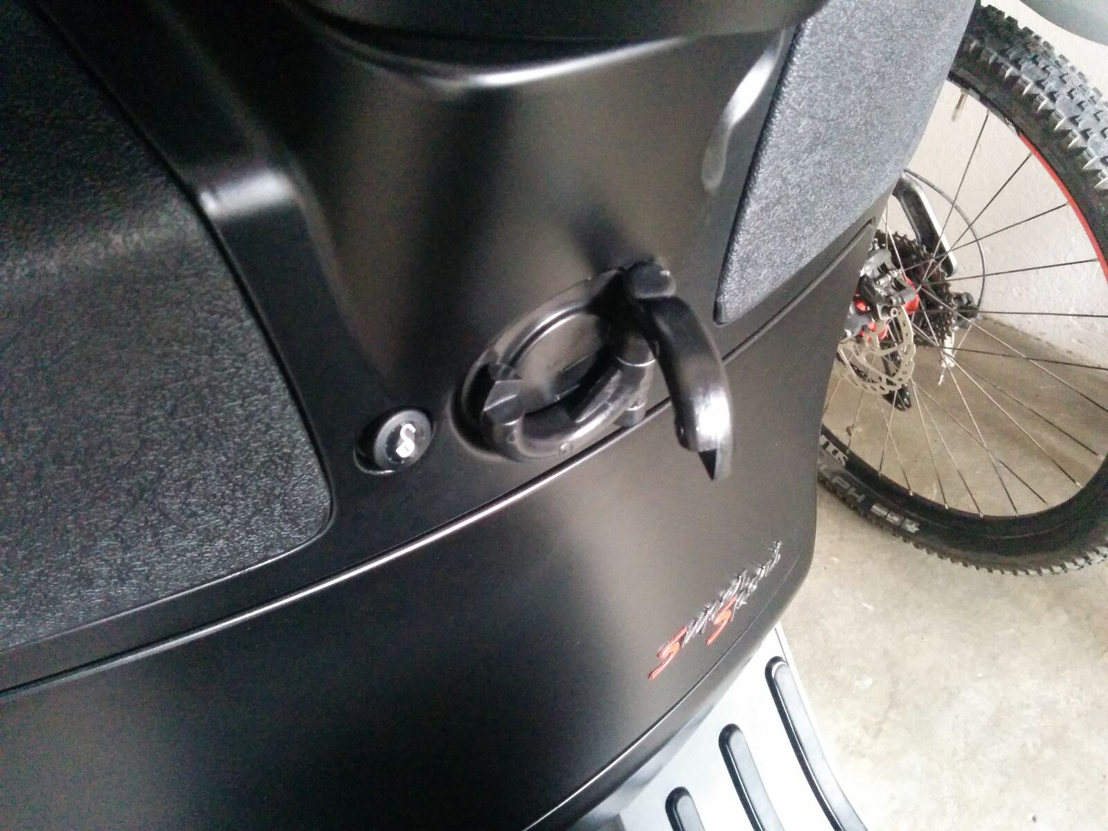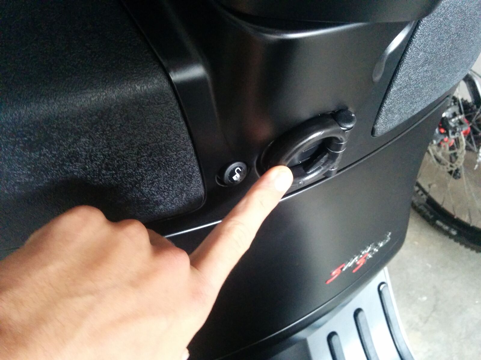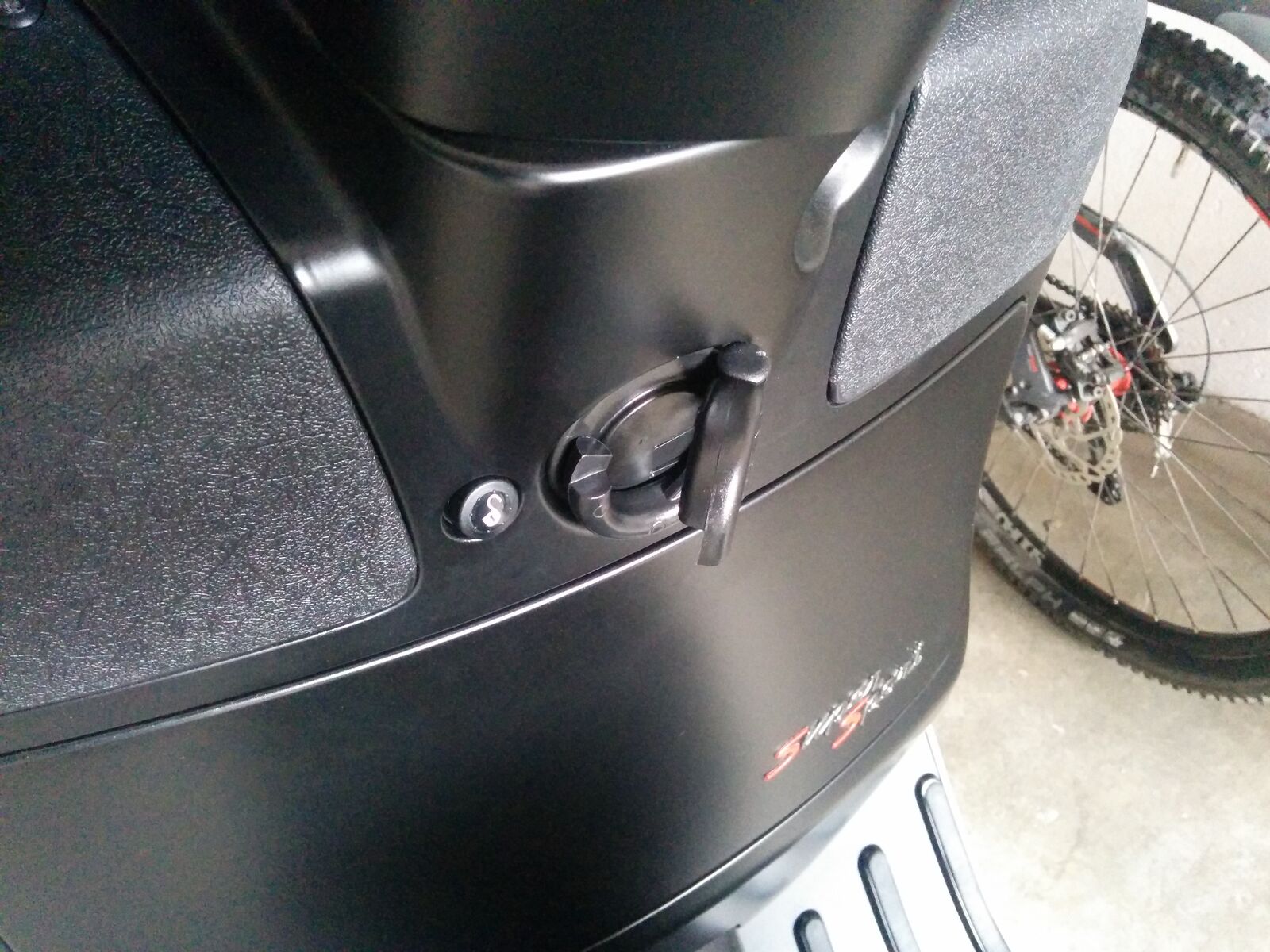 Jedoch hat meine Vespa einen kleinen Schönheitsfehler, und zwar ist der Gepäckhacken vorne beim Zündschloss verdreht. Ich habe das Gefühl die Feder ist falsch herum eingebaut, denn er klappt immer nach außen anstatt zur Vespa hin. Ich bin leider nicht wirklich ein Schrauber