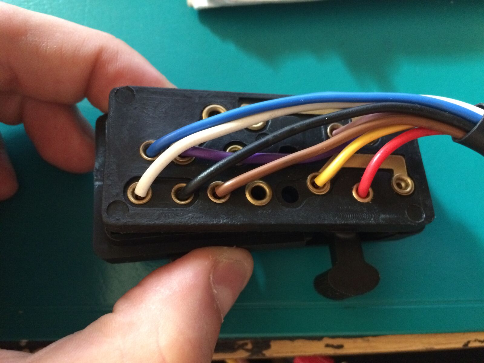 In die beiden Anschlüsse oben, die von dem federbelasteten Kontakt berührt werden. Eine Seite braun, die andere Seite blau. Wenn deine Blinker wie im [lexicon='Schaltplan',''][/lexicon] verkabelt sind dann in den zugelöteten Kontakt braun.