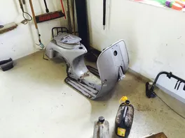 Ein wahrer Schrauber - das Bett in der Werkstatt oder die Vespa im Schlafzimmer?Allerdings sah sie auch vor dem Neuaufbau echt übel aus.