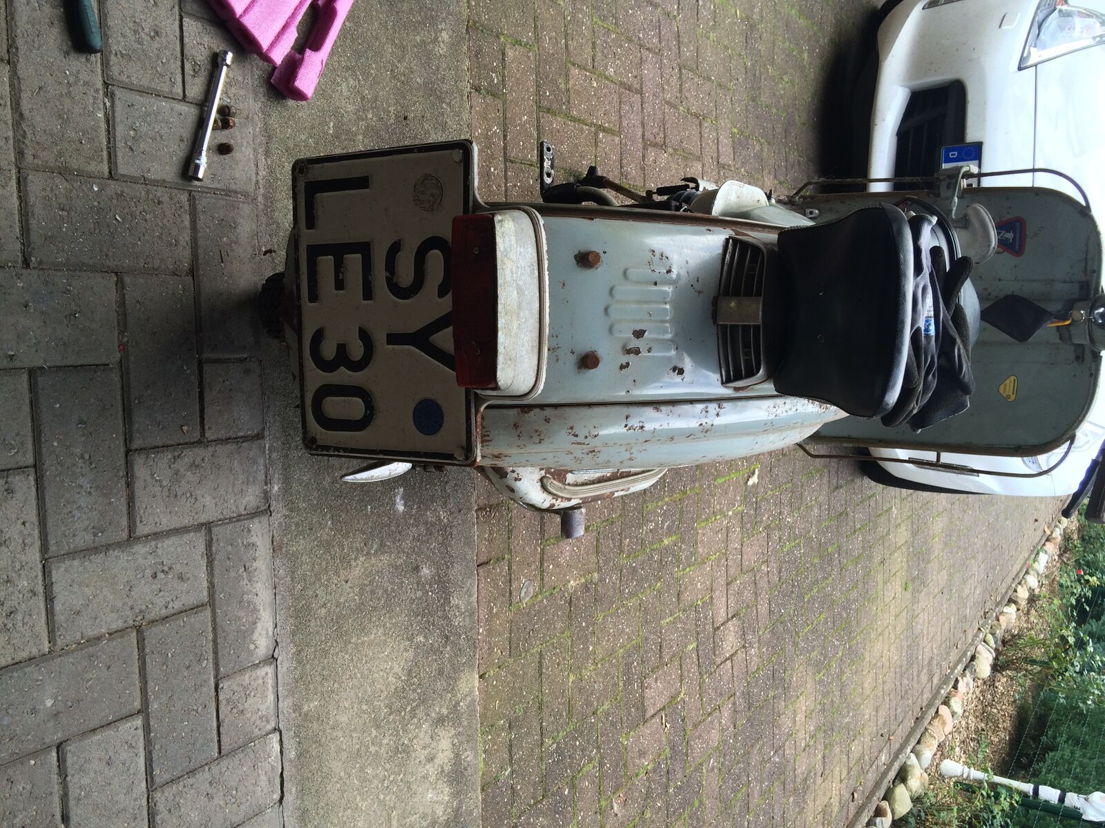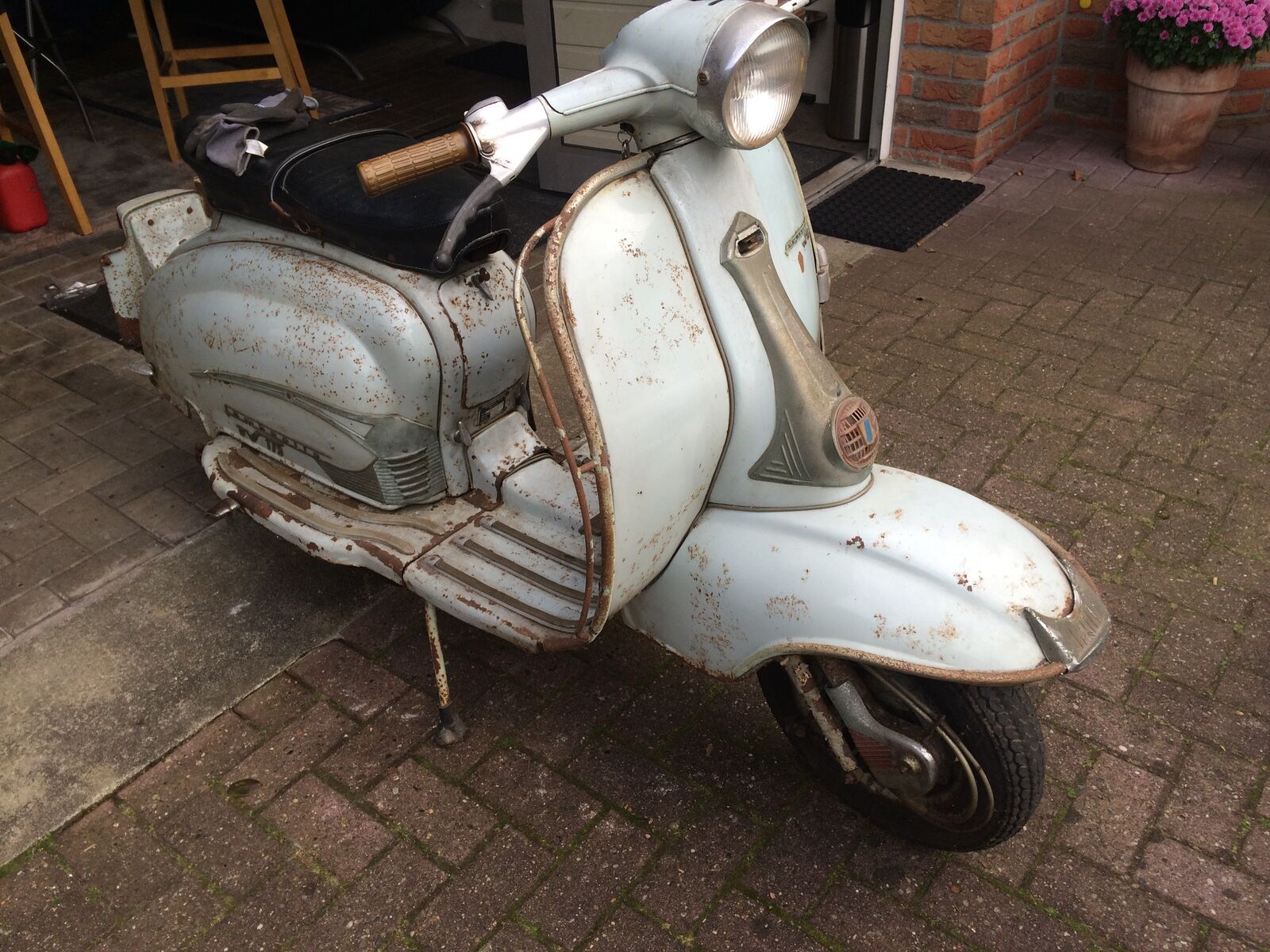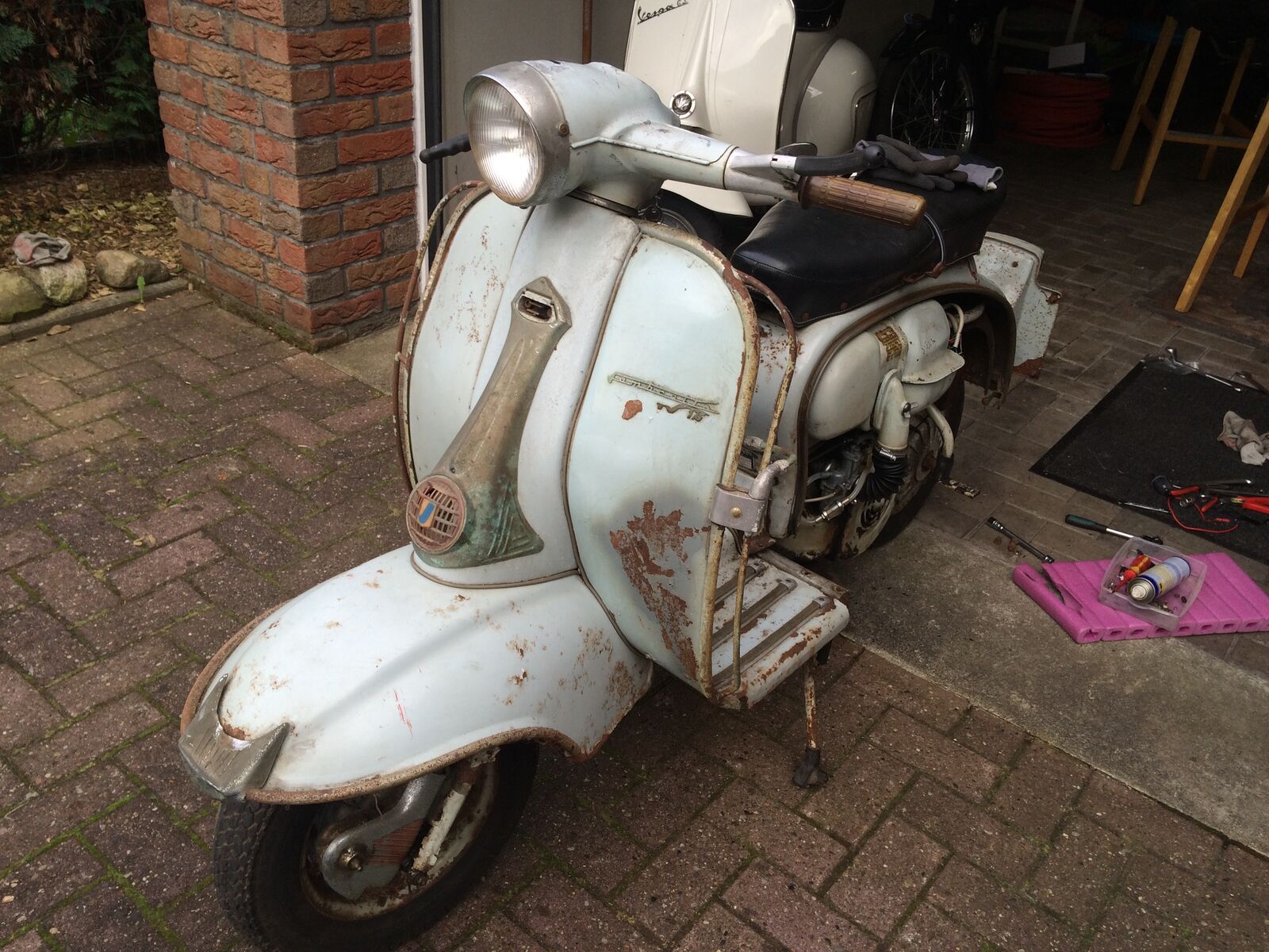 Hallo Leutz, meine Ratte hat seit gestern Konkurenz bekommen! Hab von nem guten Kumpel ne Lambretta TV 175 SS Serie 2 bekommen, das Teil ist aus Erstbesitz und hat ne echt geile Pattina! Sie wurde von einem jungen Mädchen gekauft und dann nur sehr wenig gefahren! Ist dann 1985 kaputt gegangen, der Fehler wurde nie gefunden! Das Schätzchen wurde abgemeldet und seit damals nicht mehr bewegt! Nun hab ich ein Wochenende mit dem Teil verbracht und Dornröschen aus ihrem langen Schlaf geweckt! Es waren ne Menge Sachen zu machen durch die lange Standzeit, aber der eigentliche Fehler