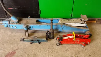 Der blau/weiße ist ca 50-60jahre alt.für lkws. Nen mähdrescher schafft er auch problemlos. Ist rein mechanisch. Der kleine scherenwagenheber ist ok aber kipplig. Nimm nen rangierwagenheber mit 2 t. Damit biste am besten bedient.