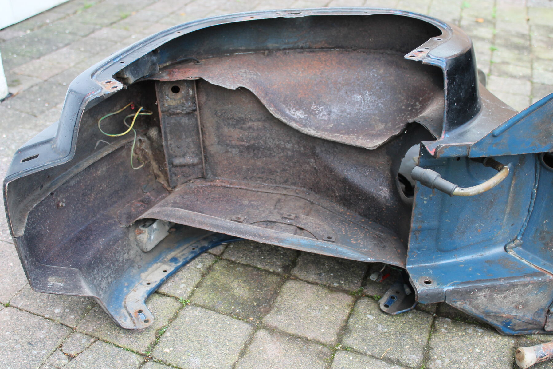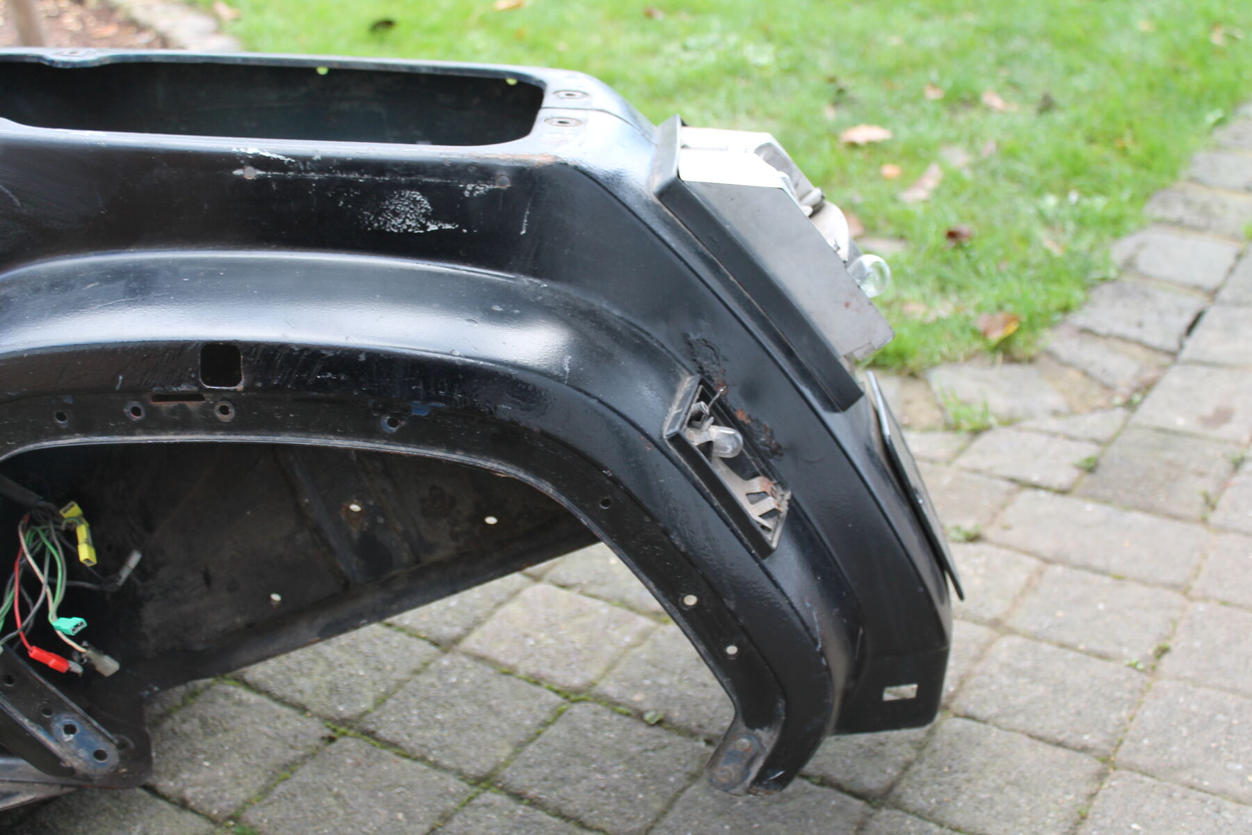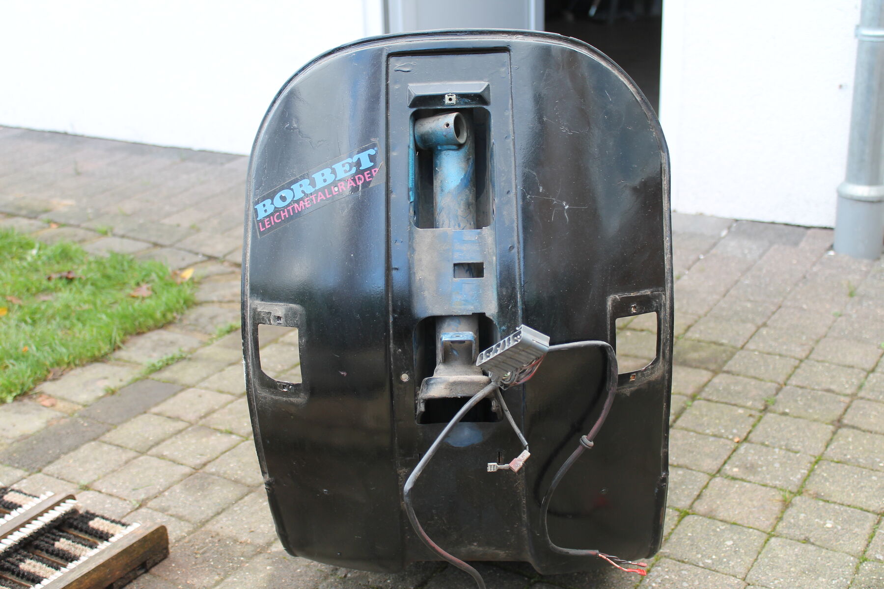 Er ist von Bj 84. Keine Welle, zwei Dinge müßten geschweißt werden, die obligatorische Spritzwasserdurchrostung neben der Federbeinaufnahme und es sollte eine neue Strebe unters Trittblech. Das Trittblech ist sonst ok und erhaltenswert.