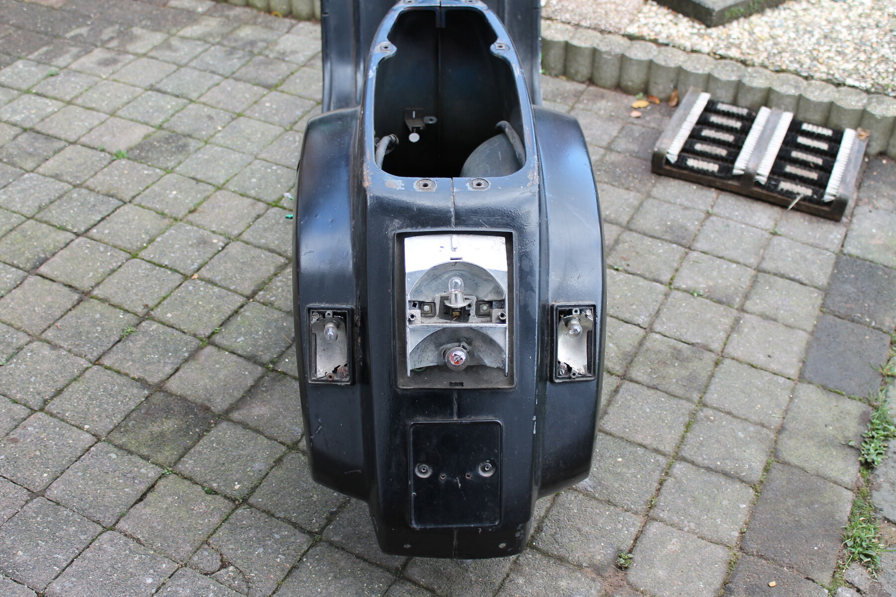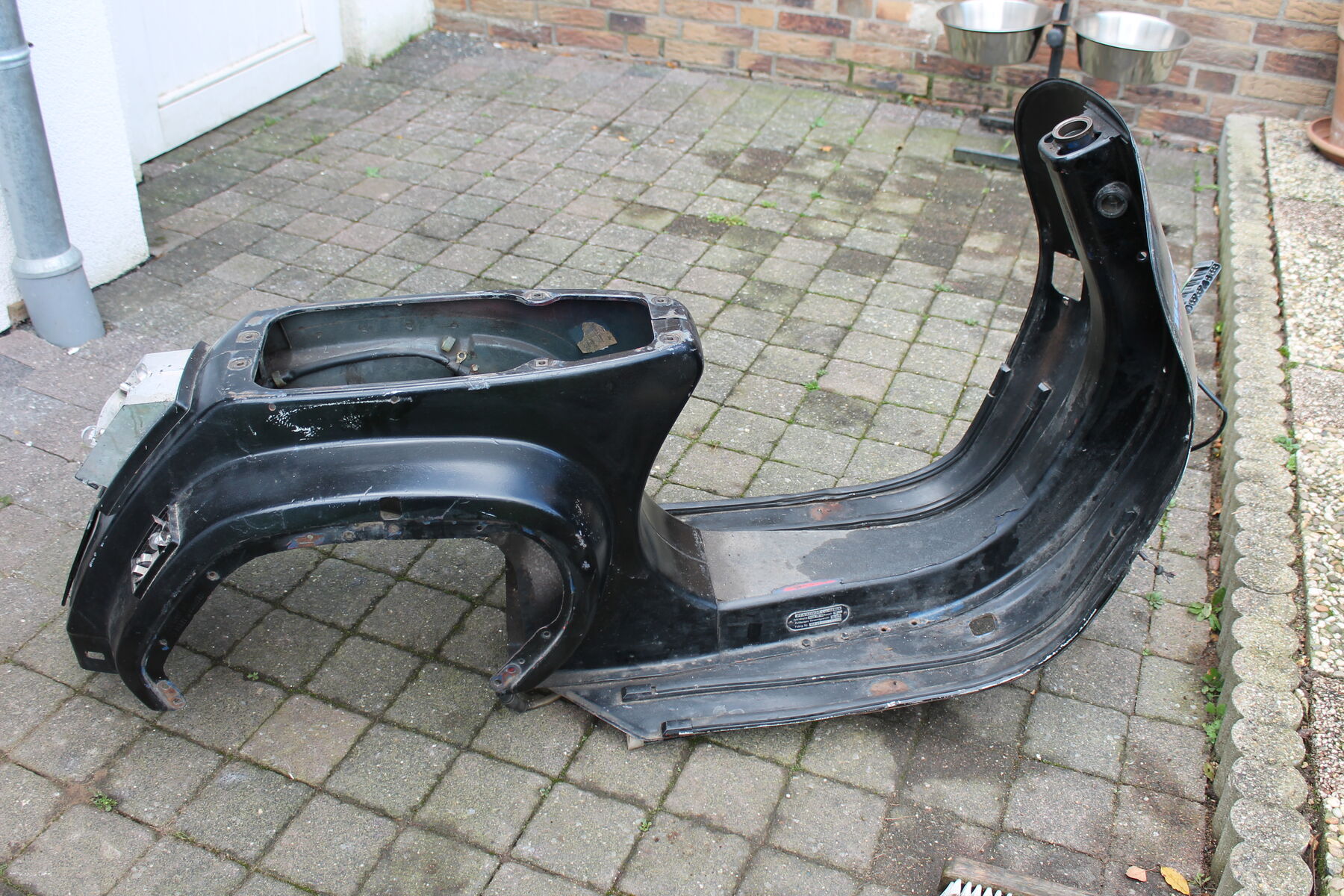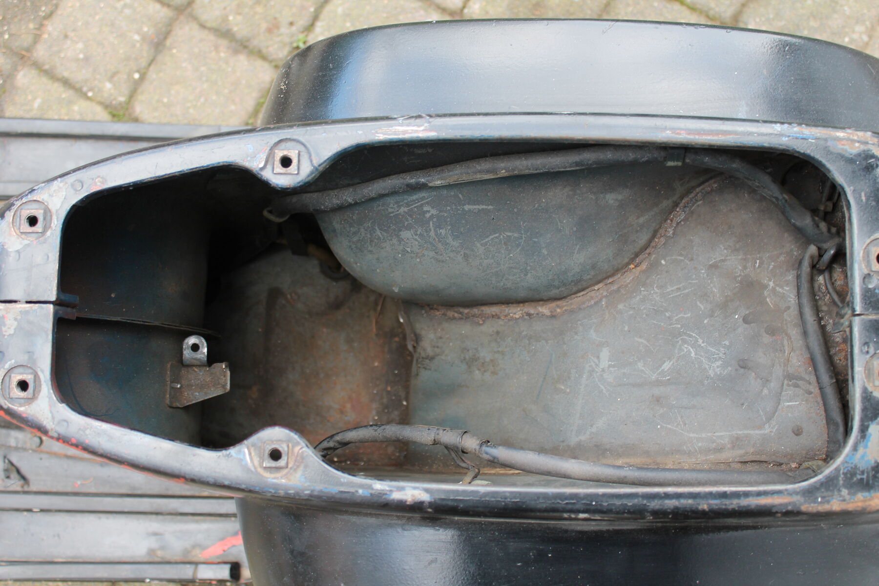 Er ist von Bj 84. Keine Welle, zwei Dinge müßten geschweißt werden, die obligatorische Spritzwasserdurchrostung neben der Federbeinaufnahme und es sollte eine neue Strebe unters Trittblech. Das Trittblech ist sonst ok und erhaltenswert.