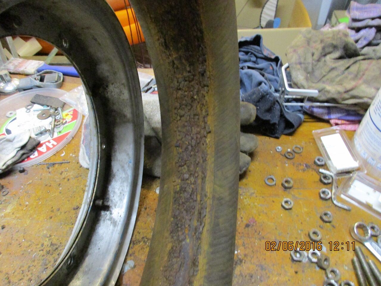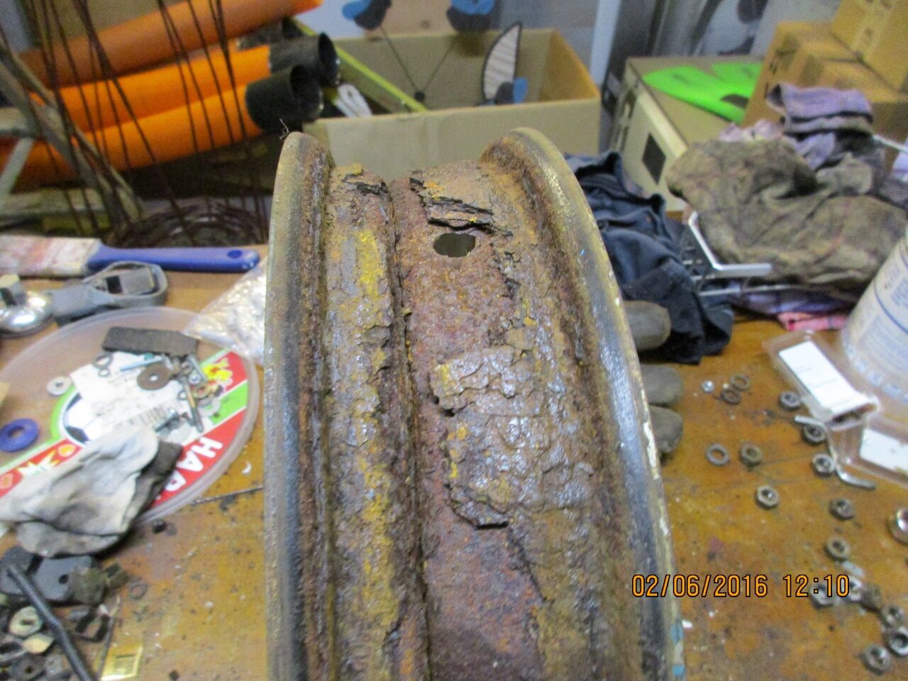 Oder hat jemand Bedarf an einer leicht angerosteten Felge?Letztendlich Muss ich noch die Rostreste vom Schlauch kratzen. Nach zehn Jahren Standzeit hält der Schlauch die Luft immer noch problemfrei: