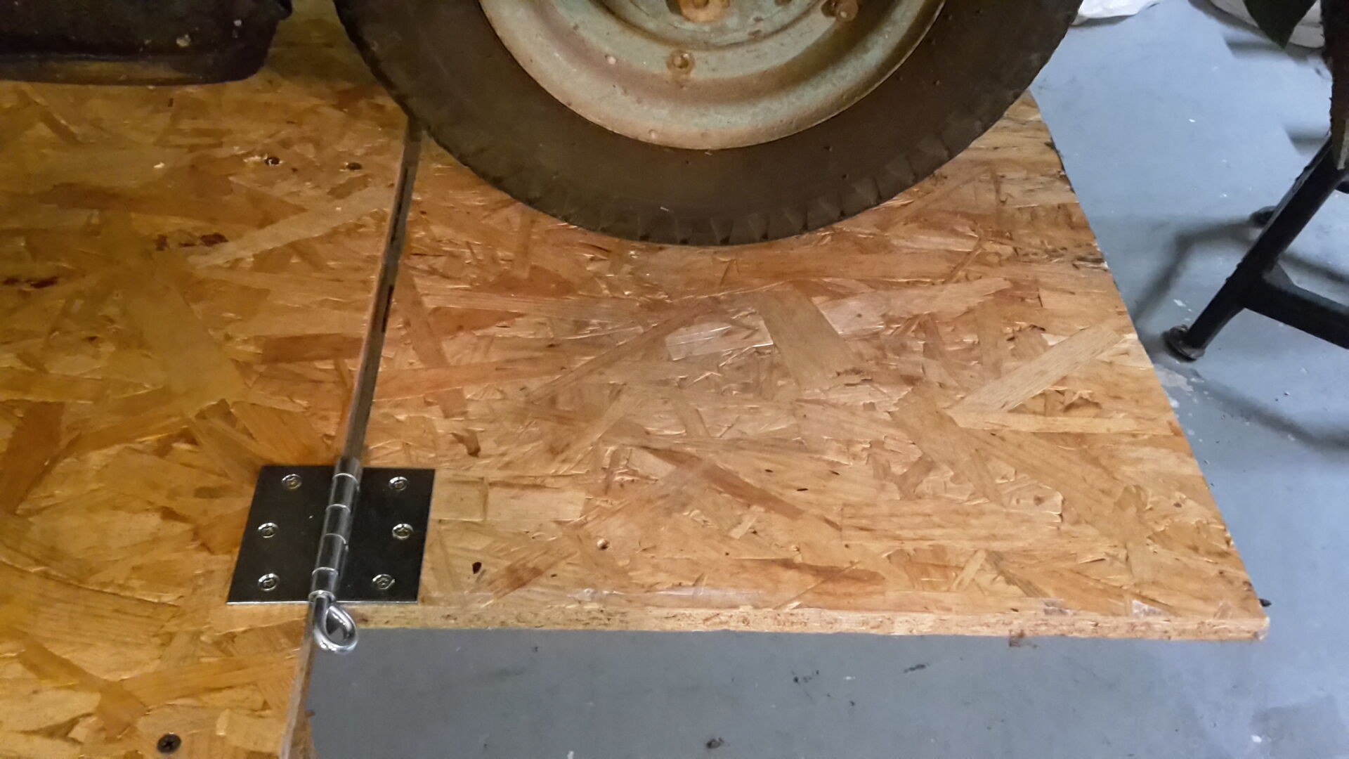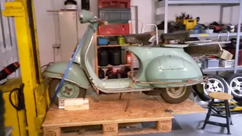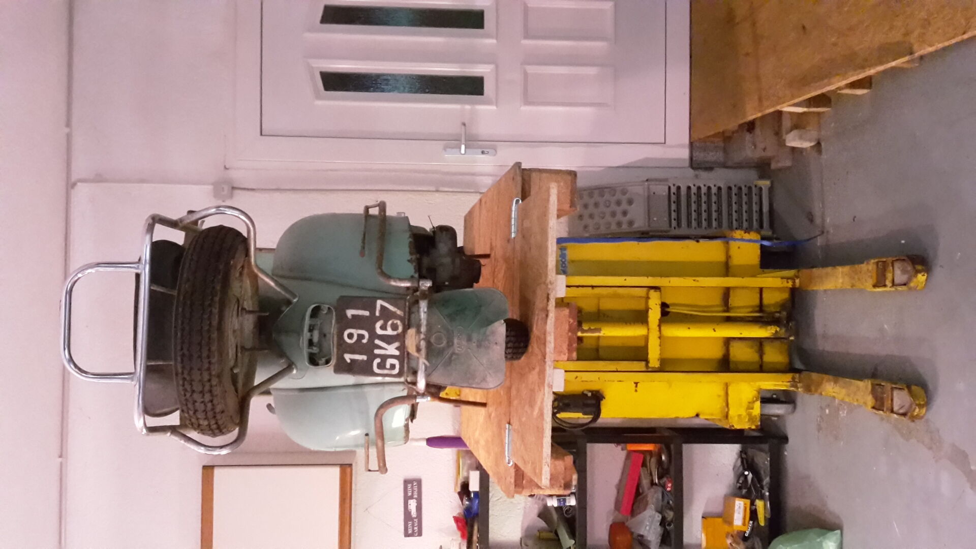 Also Palette genommen, Brett drauf gespaxt und gemerkt das die Palette je viel zu kurz für nen Roller ist. Also Palette noch um 40cm verlängert. Die Verlängerung ist abnehmbar so das man auf der Bühne auch den Motor aushängen lassen kann. Hält locker 100kg aus. Des Weiteren lässt sich die Klappe auch als Auffahrrampe runter kippen, aber die palettenhöhe kann man auch so den roller drauf heben.