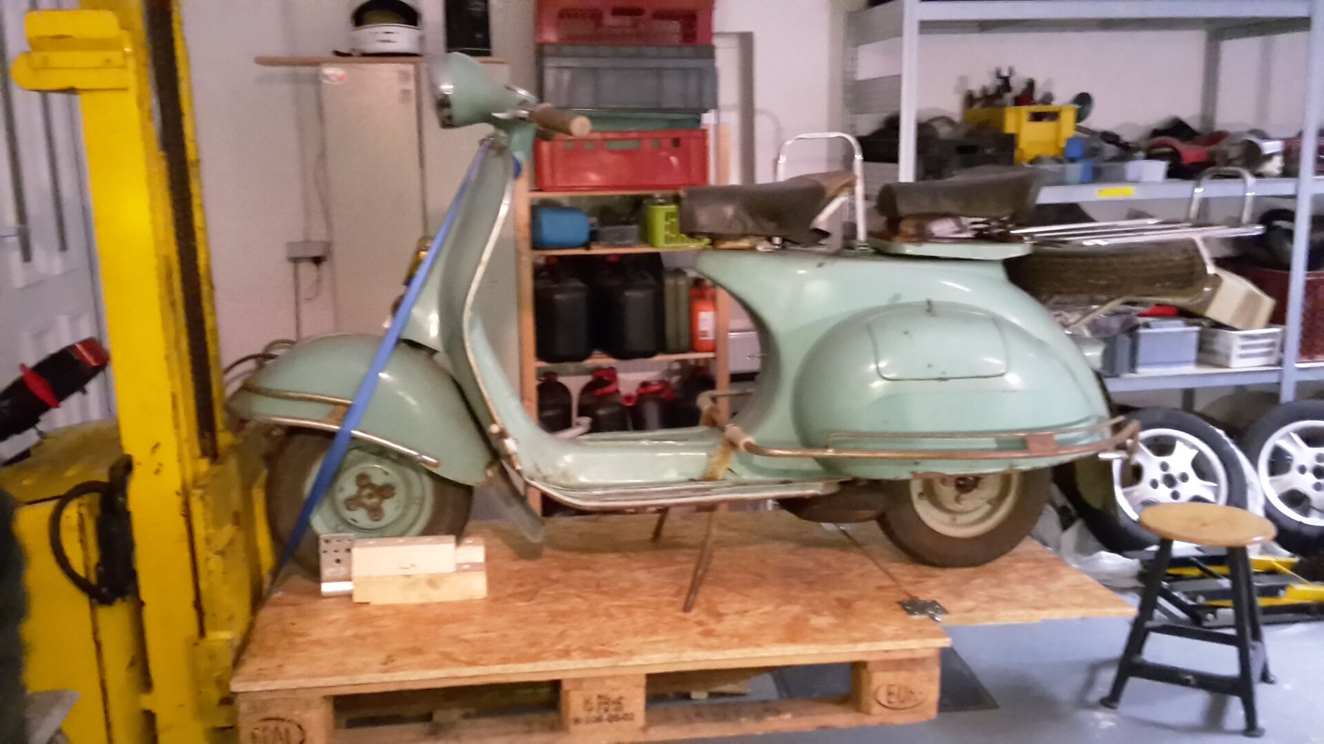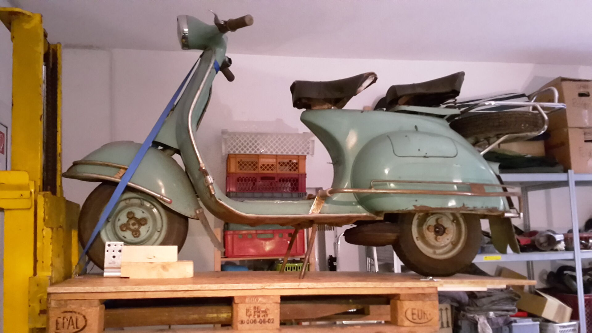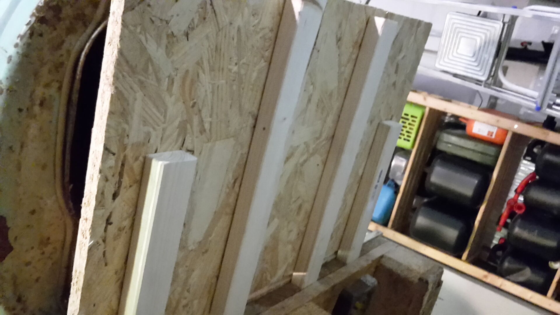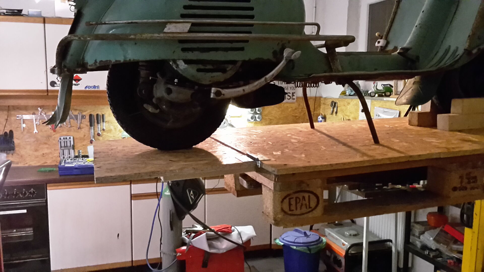 Dann noch einen Radfänger gebaut damit das Vorderrad stabil steht und der Roller ein bisschen arretiert ist. Passt auch für das Hinterrad damit man den Roller umgekehrt drauf bekommt um gabeln einzubauen. Mit Spanngurten wird der Roller dann gehalten.