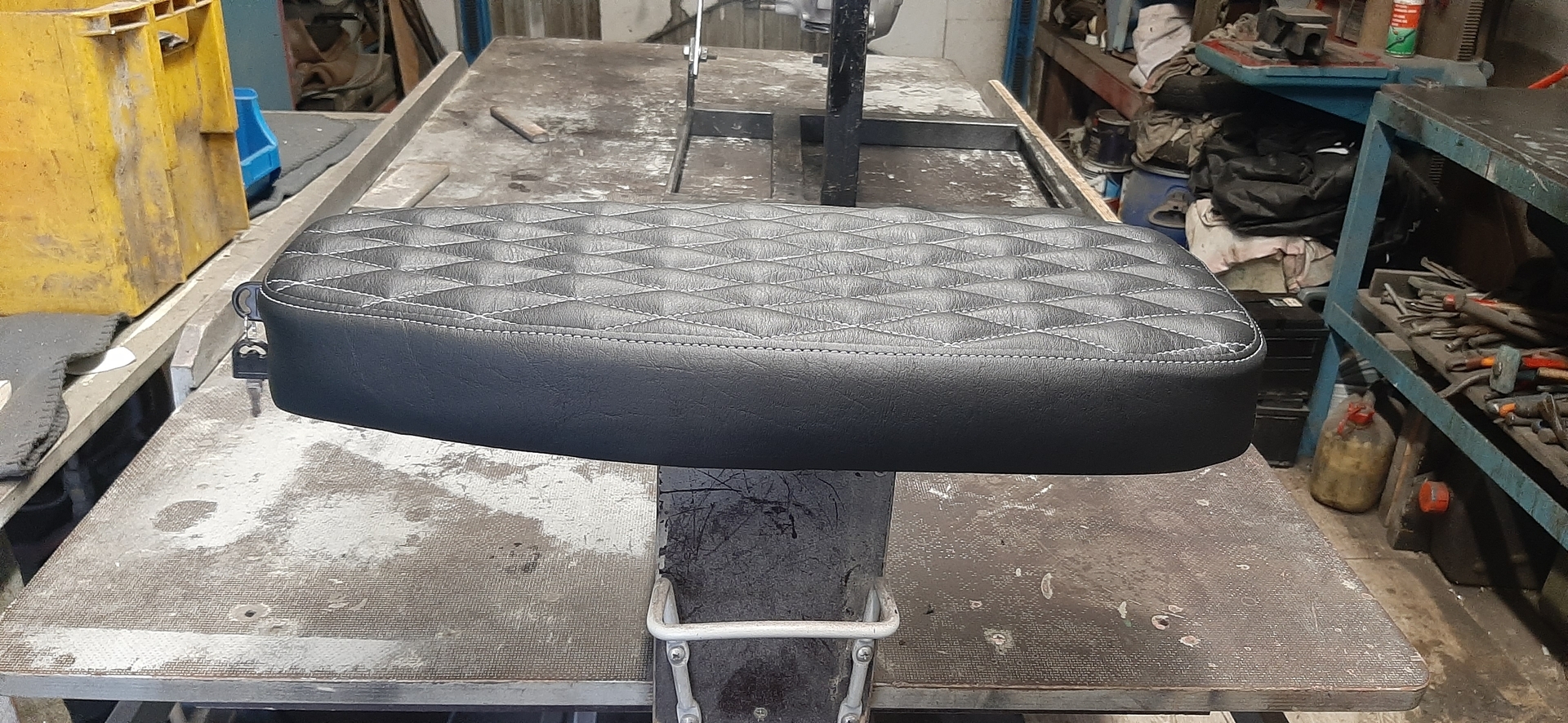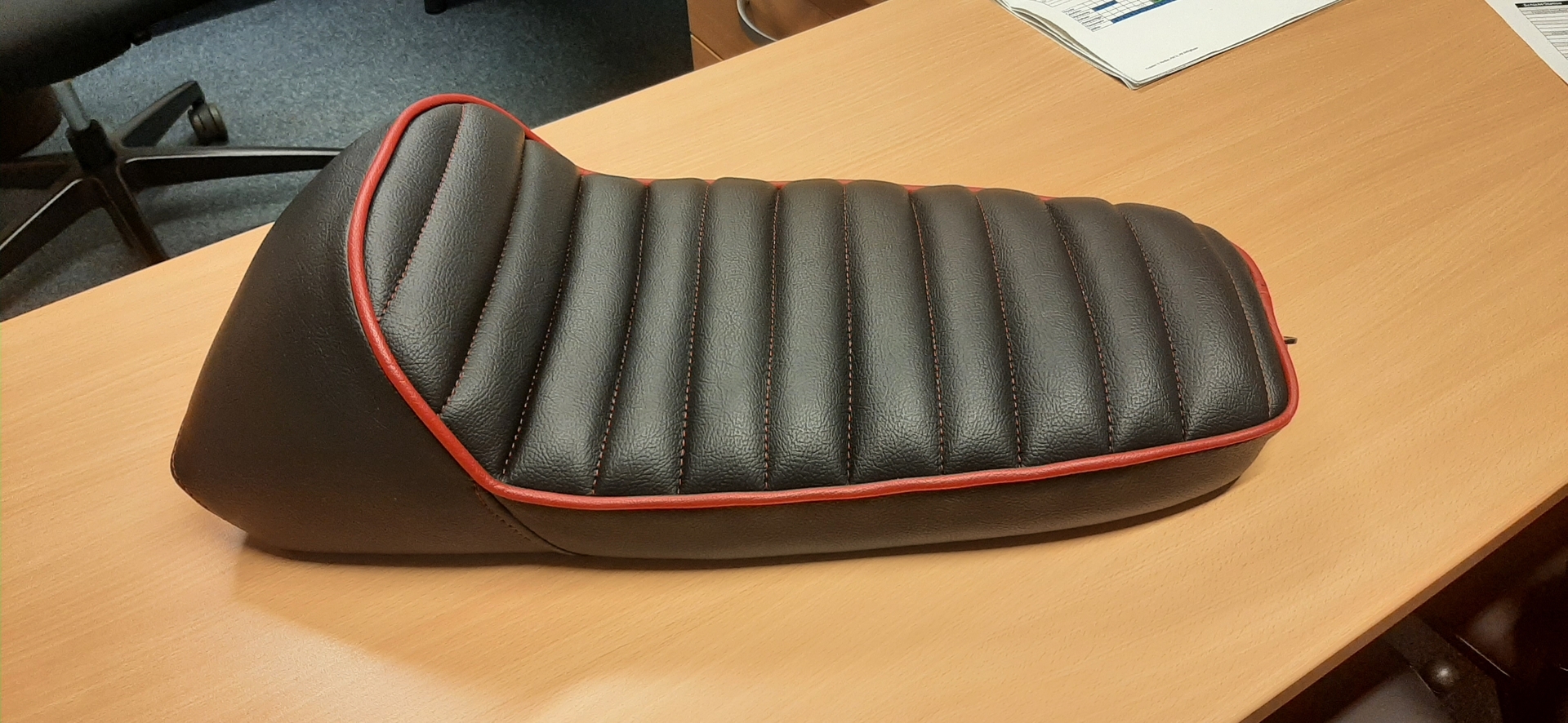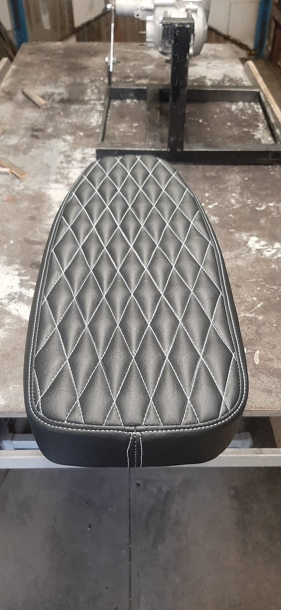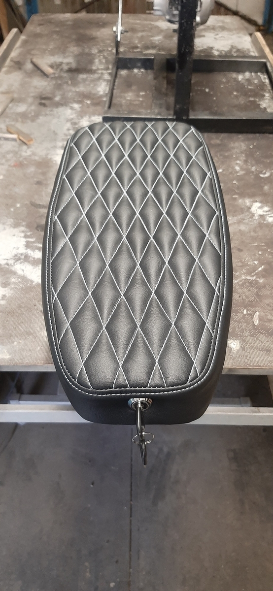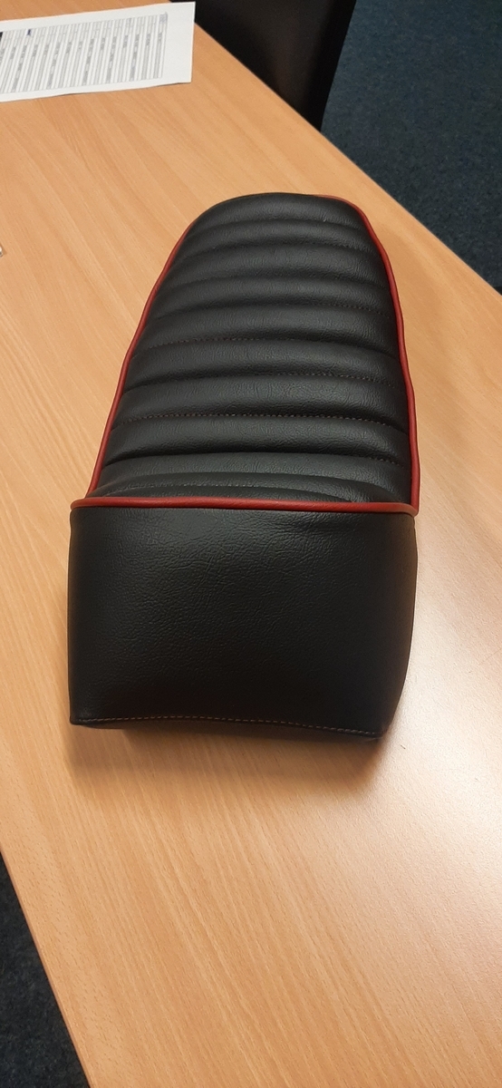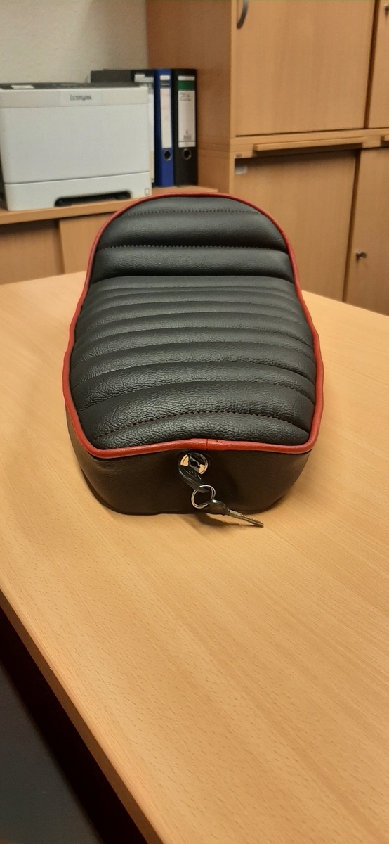 Nun habe ich also eine schwarze Sitzbank mit quer zur Fahrtrichtung gestepptem Muster, weinrotem Keder und weinroten Nähten für eine PK XL 2 im Angebot.