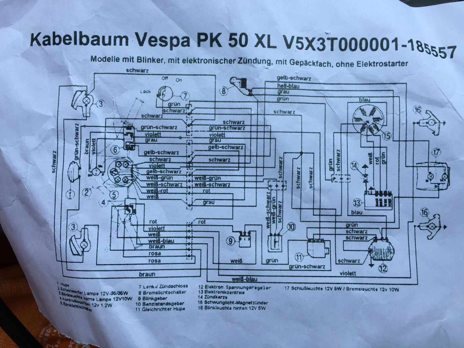 Habe gestern den neuen Kabelbaum eingezogen, soweit so gut. Es ist ein Kabelbaum für PK50XL, ohne Batterie, ohne E-Start, mit Bremslicht, mit Blinker.