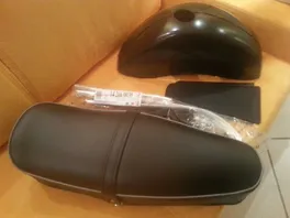 Zudem habe ich einen neuen Sattel geordert, das neue ET3-Zeichen, das Piaggio-Logo vorne, dann auf dem Bodenblech die neuen Zierleisten und die Gummimatte in der Mitte. Und da der alte vordere Kotflügel so etwas von verbeult war, habe ich diesen auch neu bestellt.