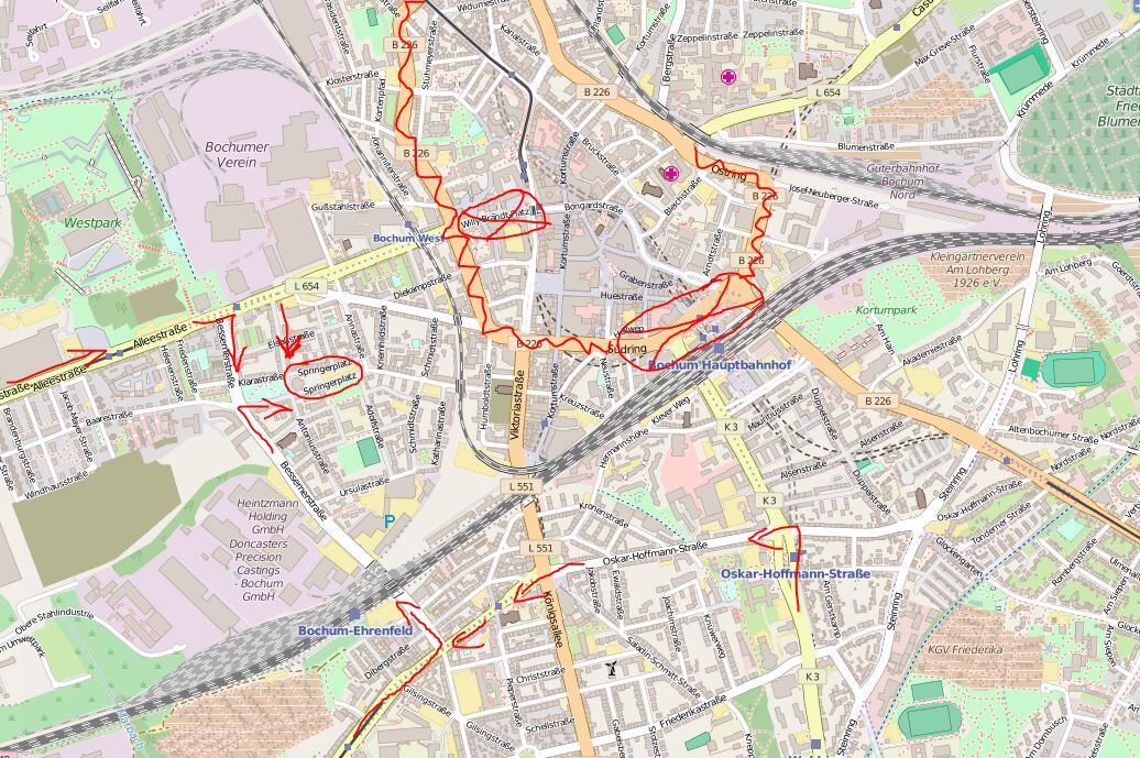Generell wird empfohlen den kompletten Innenstadtring zu meiden. Wir empfehlen eine Anfahrt zum Springerplatz über die Oskar-Hoffmann-Str / Schauspielhaus. Bzw. aus Richtung Bo Westkreuz, Weitmar / Hattinger Str. / All...eestr.