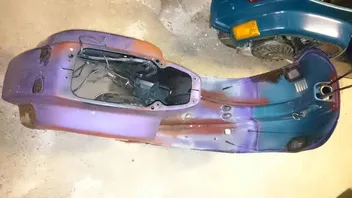 Bei dem 2. Rahmen handelt es sich diesmal aber tatsächlich um eine PK XL 2 in teils übergejauchtem Originallack türkismetallic 646. Reste davon sind an der Innenseite des Beinschilds erkennbar. XL 2 ist erkennbar an dem längeren Rohr für das Zünd-/Lenkschloss, mit dem bei diesem Modell auch der Handschuhfachdeckel durch Drücken auf das Schloss entriegelt wird.
