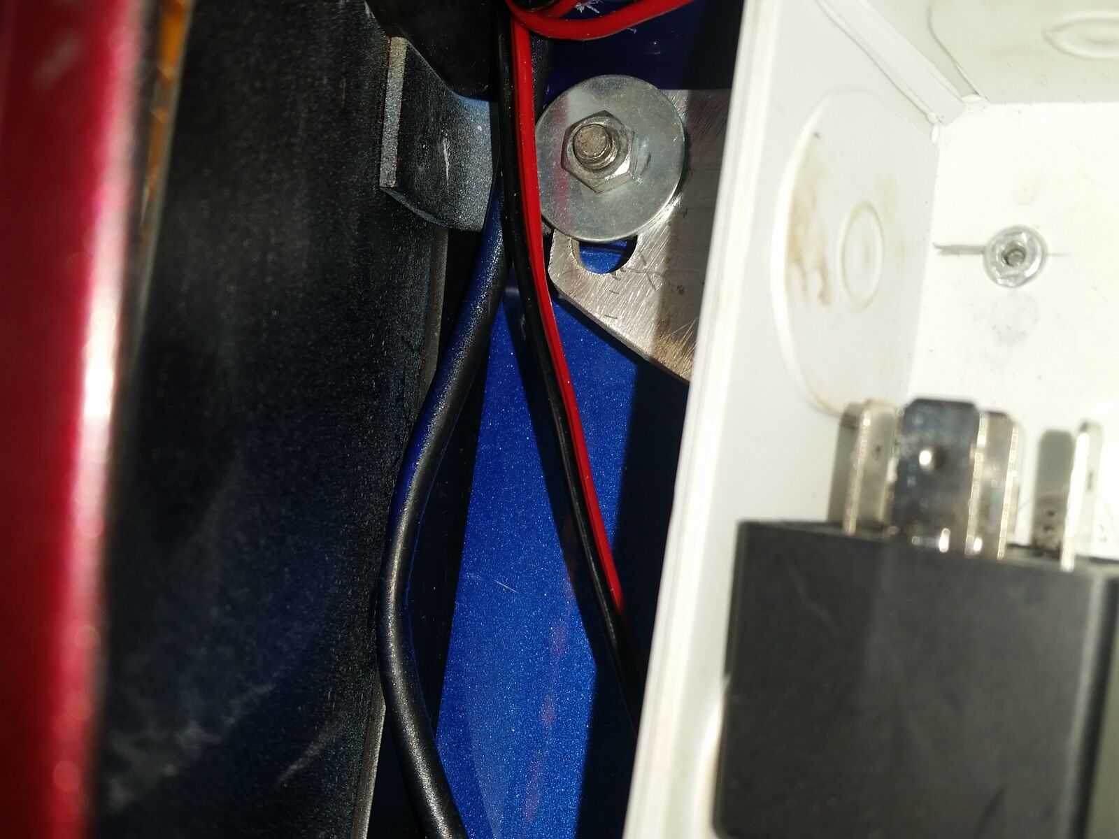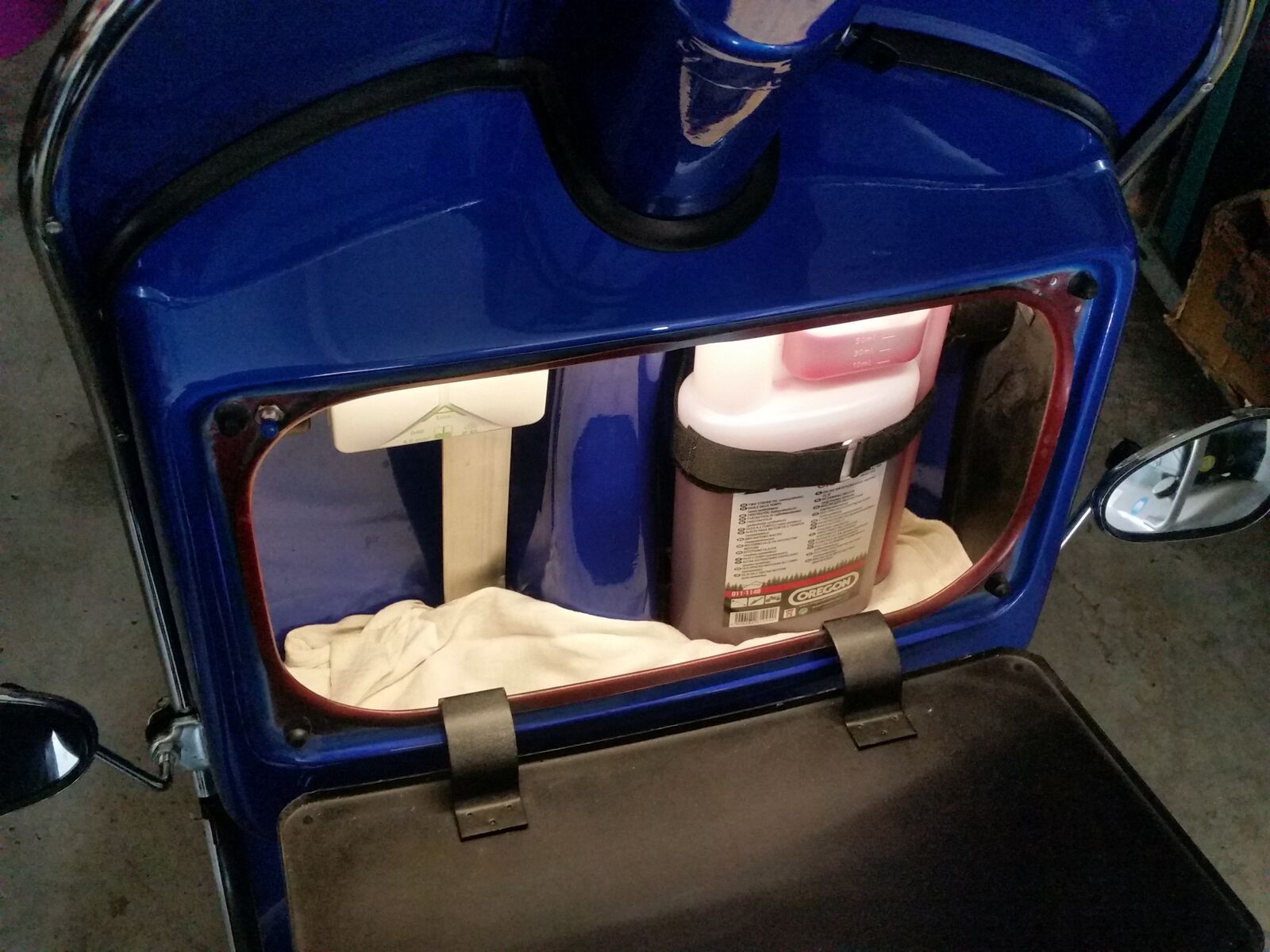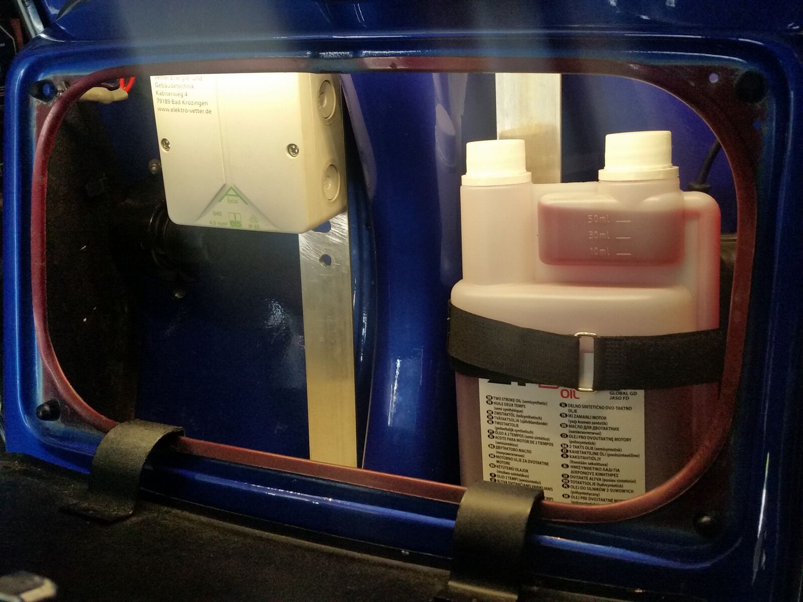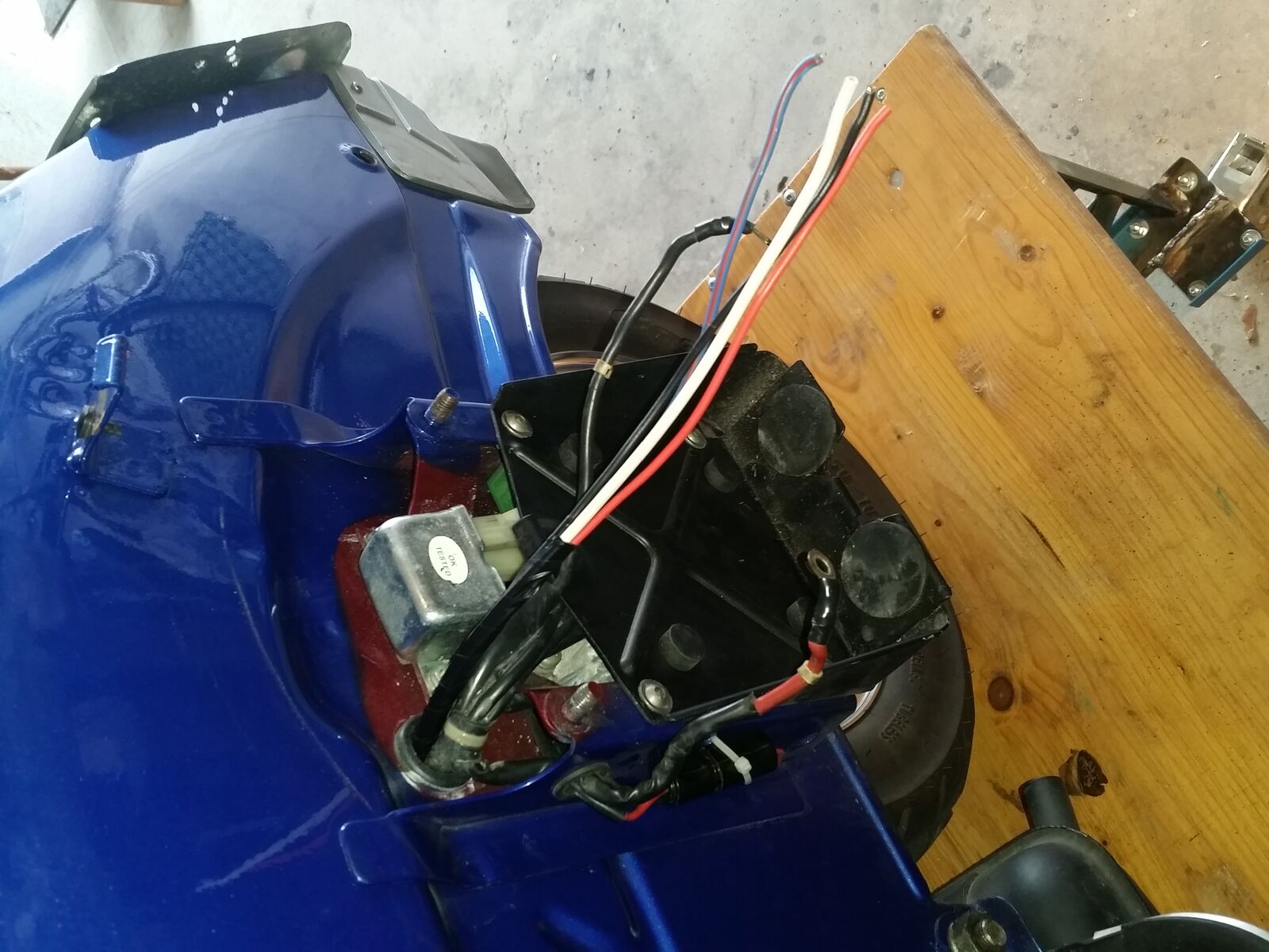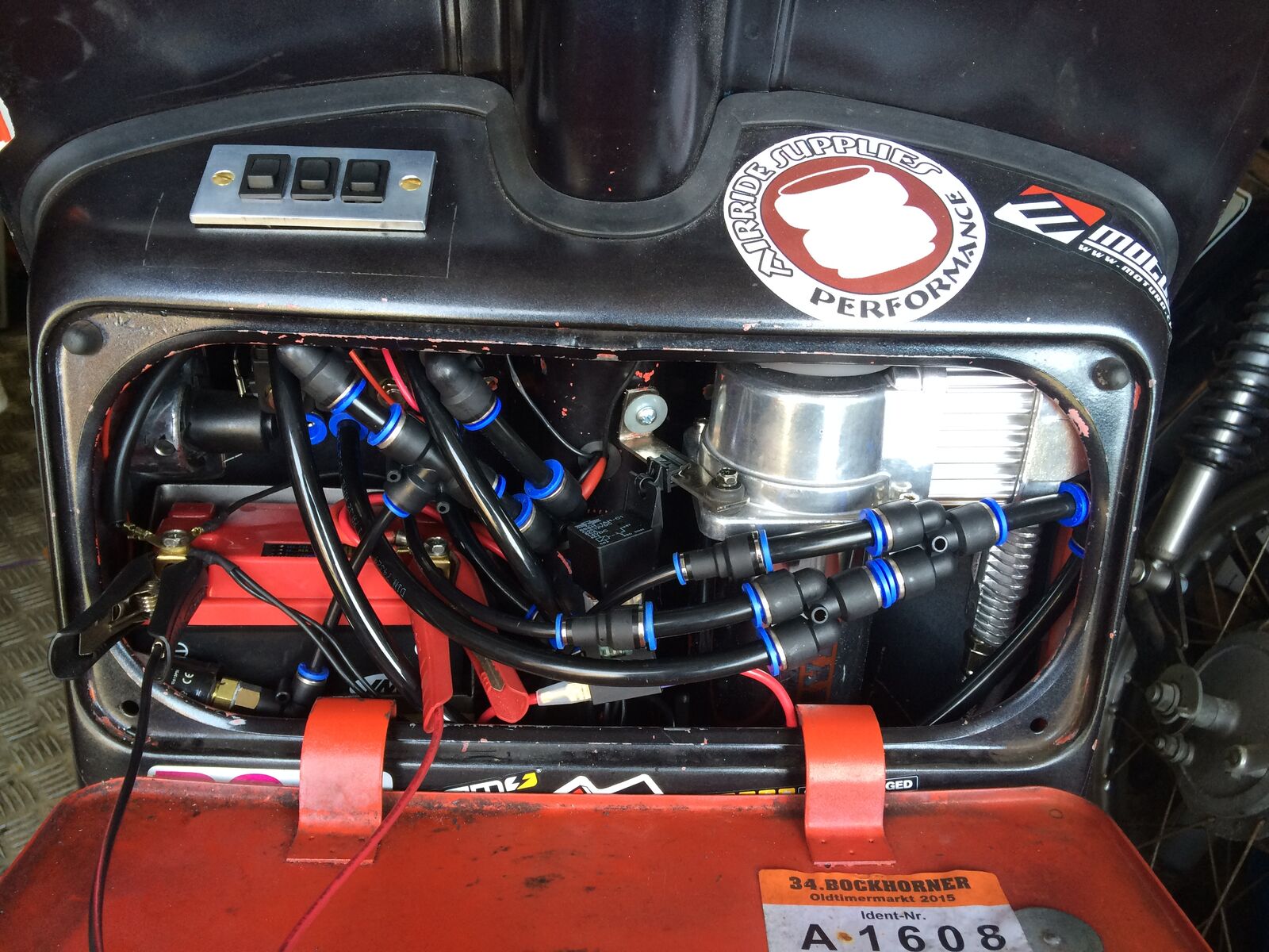 ein paar Fotos wie dieses gelöst wurde unter Zuhilfenahme eines KFZ Relais, eines selbstklebenden 30cm LED-Streifens, eines Gleichrichters, einer Verteilerdose, 3x Sicherungshalter (Nr.3 ersetzt die Originale Vespa Sicherung), 2 Alustangen, div. Schrauben und Kabel. Die 2. Alustange dient als Halterung für Gepäck innerhalb des Handschuhfachs.
