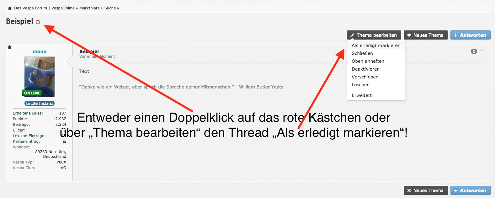 um ein einheitlichen Vorgehen bei erledigten Verkaufsanzeigen bzw. Suchanzeigen zu etablieren haltet Euch bitte an folgende Regeln: