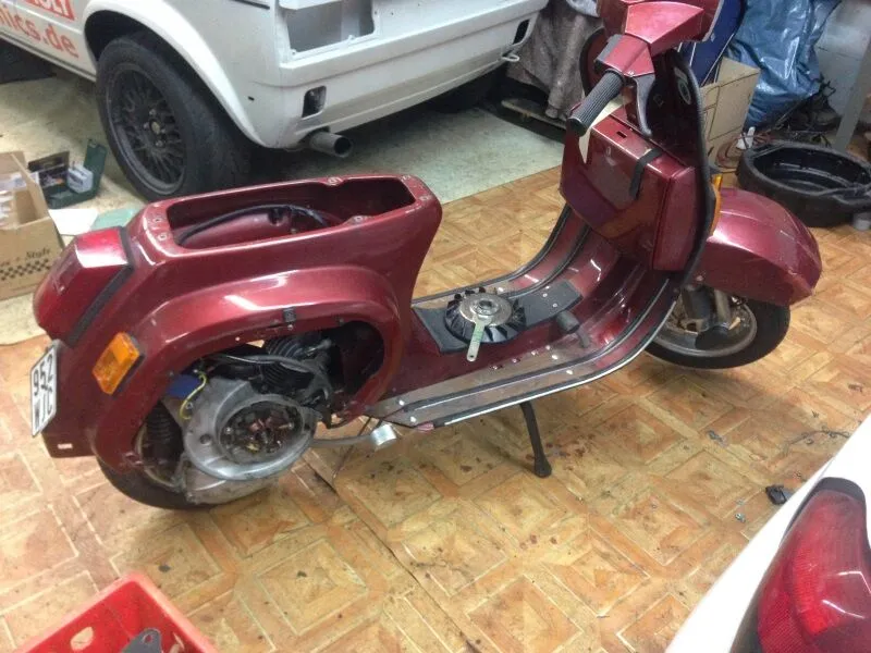 Vor zwei Jahren hab ich aus einer Laune heraus für 400€ eine Vespa PK50S in Österreich gekauft. Hat leider dank dem unzuverlässigen Spediteur noch ein halbes Jahr gedauert bis sie bei mir war. Auf den ersten Blick etwas Verbastelt aber komplett und Fahrbereit und ich wollte ja was zum dran Schrauben.