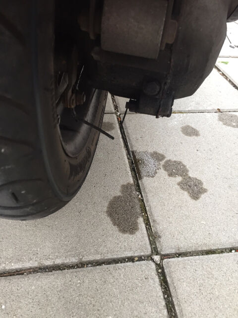 Die Vespa stand jetzt ein bisschen an der gleichen Stelle und es läuft irgendwie/irgendwas aus.