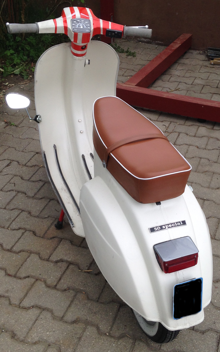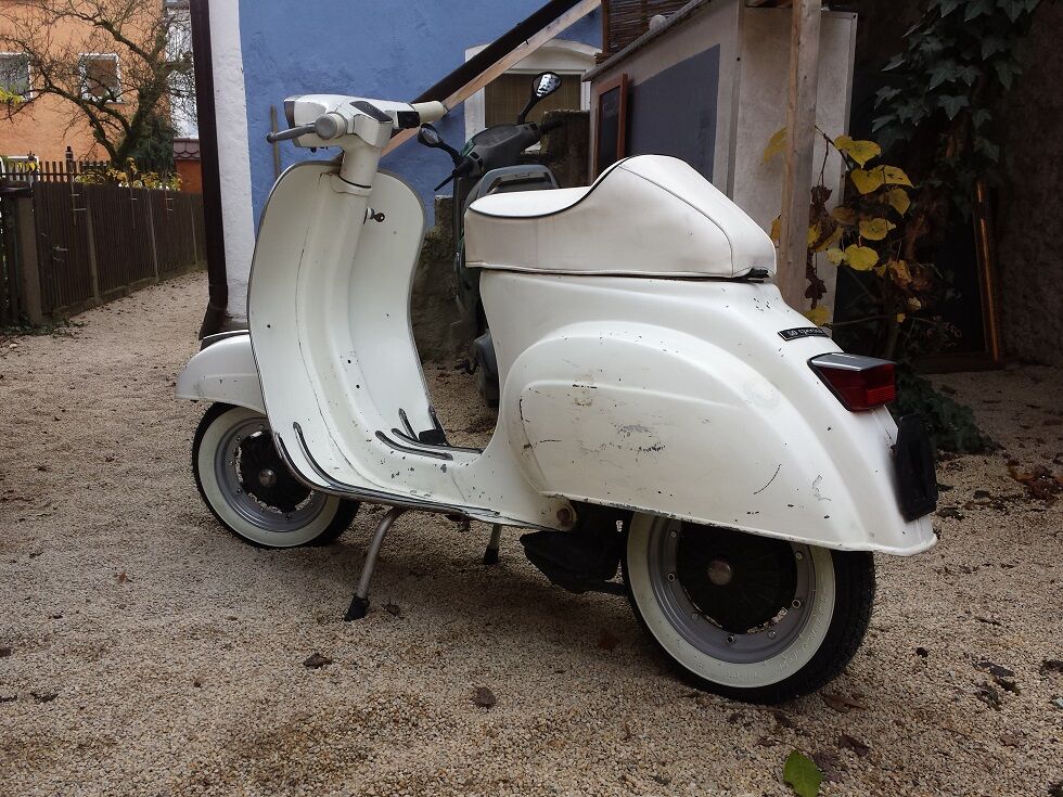 Meine Vespa V50 Spezial ist O-Lack weiß. Die Farbe ist persönlich nicht mein Fall. (Wobei ich grade beim Bilder anschauen wieder ins Schwärmen komm) Da ich aber gern den Wert der Kleinen erhalten wollte hab ich sie foliert.