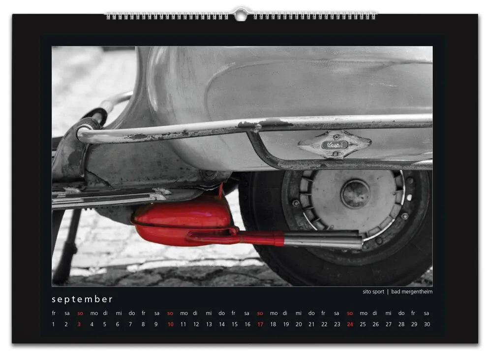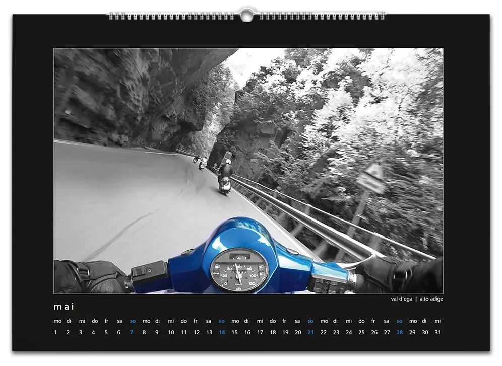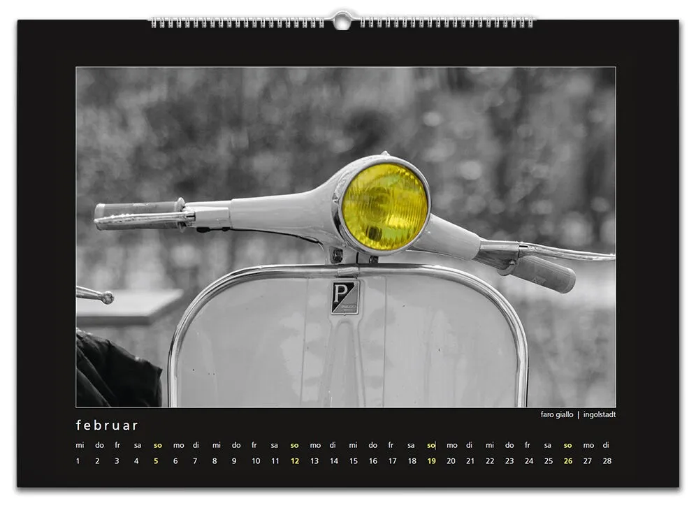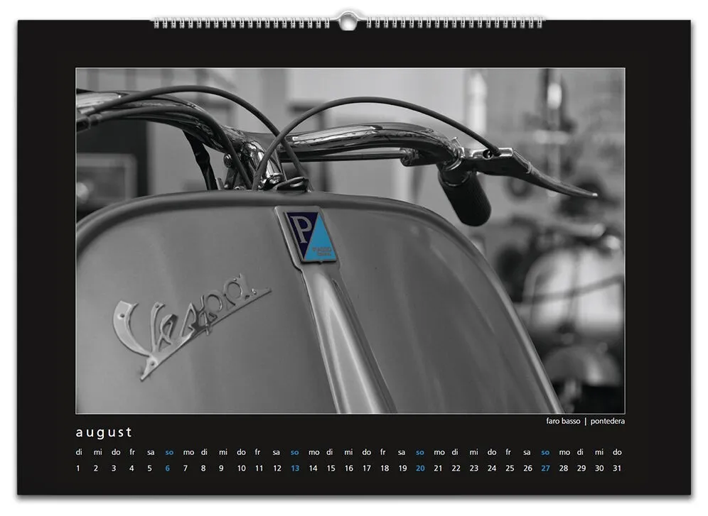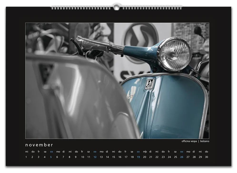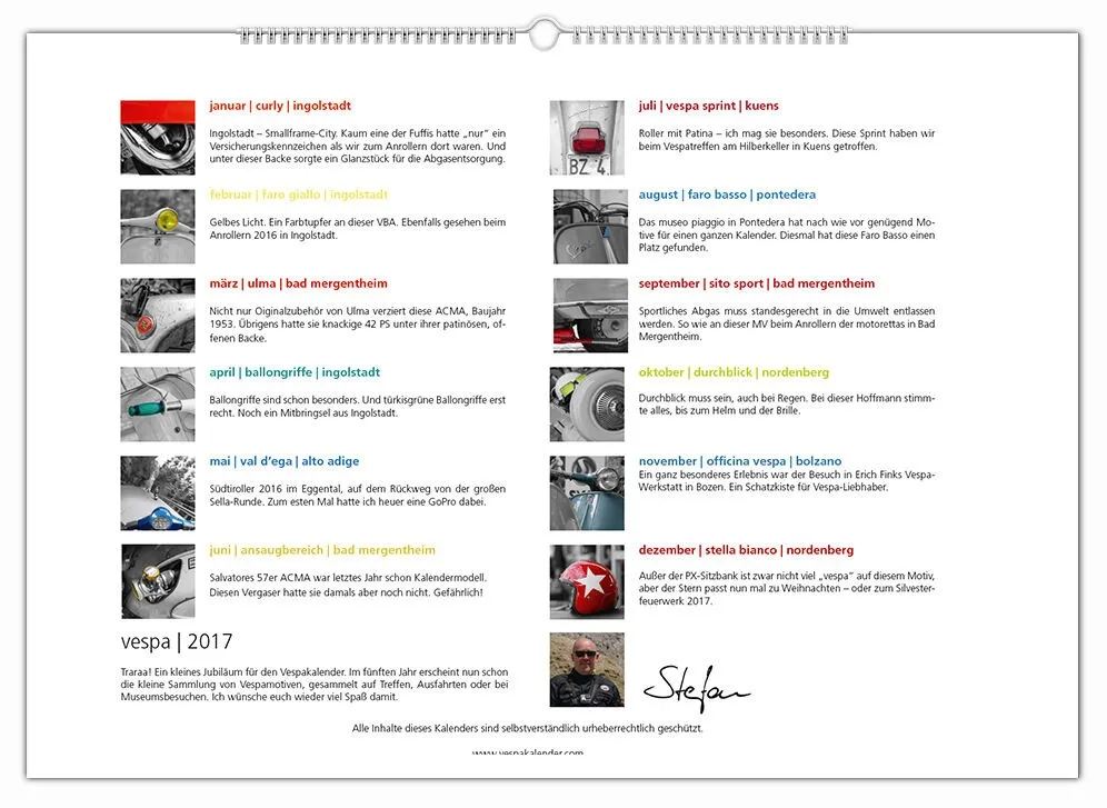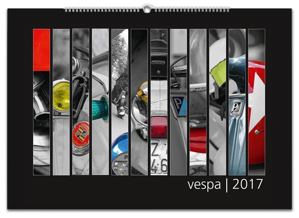 Auch für 2017 gibt es wieder meinen Monatskalender mit 12 Vespamotiven im Format A3. Inzwischen ist es schon der fünfte Kalender und auch heuer wurde er wieder - auch bereits zum fünften Mal - bei SIP in Programm genommen. Die zwölf Motive werde ich nach und nach hier vorstellen, vielleicht erkennt ja der eine oder andere von euch seinen Roller wieder ![]()
