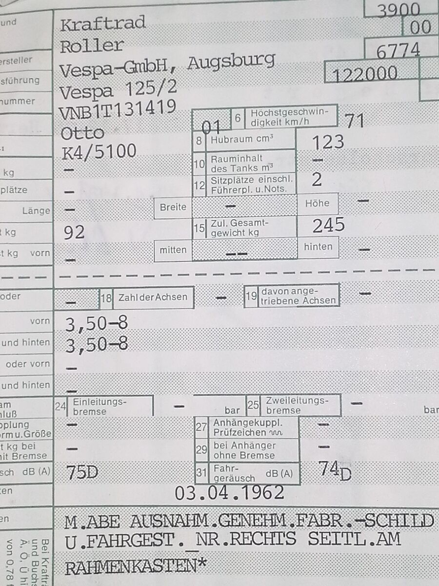 Wie hoch ist eine Vespa 125/2 EZ 1962, blau, TÜV letztmals 2013, eingerissene Sitzbank, Tankdichtigkeit ?????, dt. Papiere, z. Zt. abgemeldet, ansonsten optisch 2-3 preislich zu bewerten?