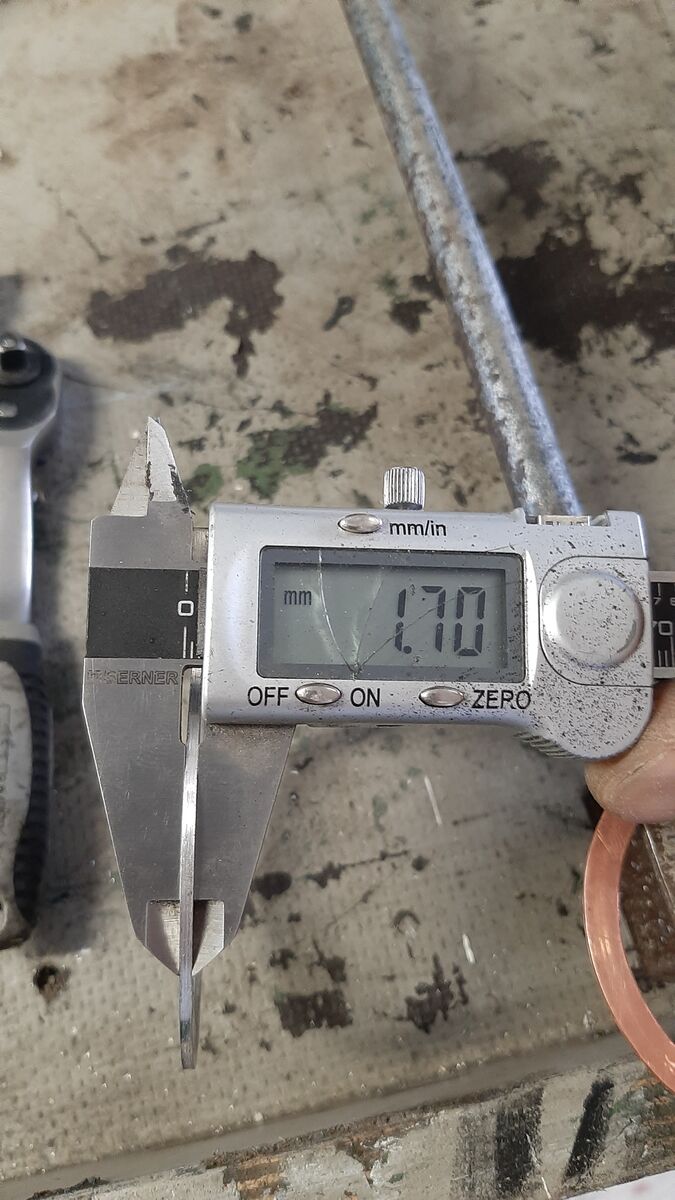 Da eine passende Kopfdichtung in 1,7 mm nicht zu bekommen war, habe ich mir selber eine gedreht, und zwar aus 2,4 mm Alublech ( altes Verkehrsschild