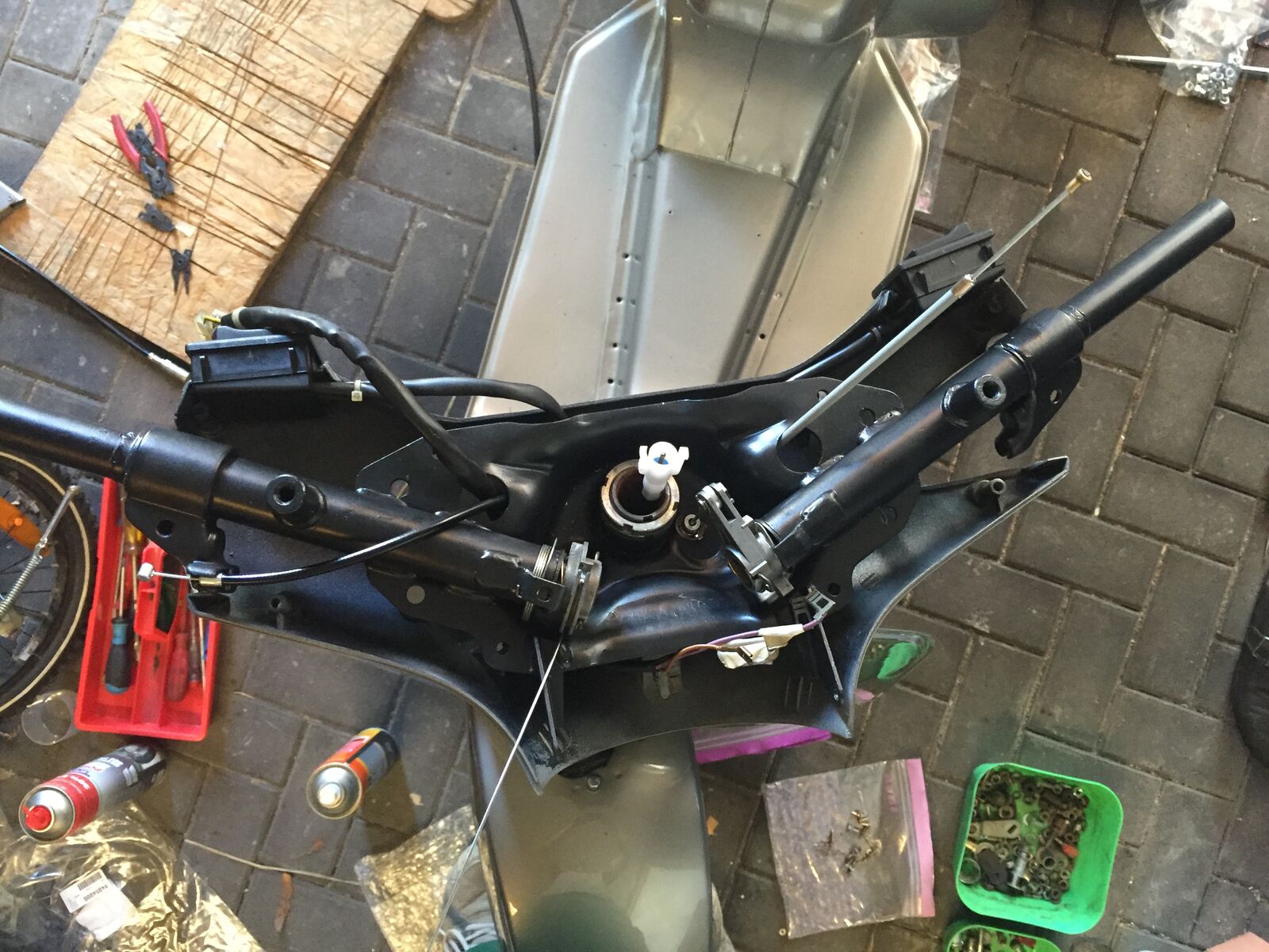 Wenn ich es mit Kraft mache, bekomme ich die Gänge rein, aber einen Aussenzug des Schaltdrahts habe ich damit schon geschrottet. Am Lenkkopf ist die Kunststoffhülle aus dem aufgepressten Endstück gedrückt worden. Wenn ein Gang drin ist, bleibt er auch drin.