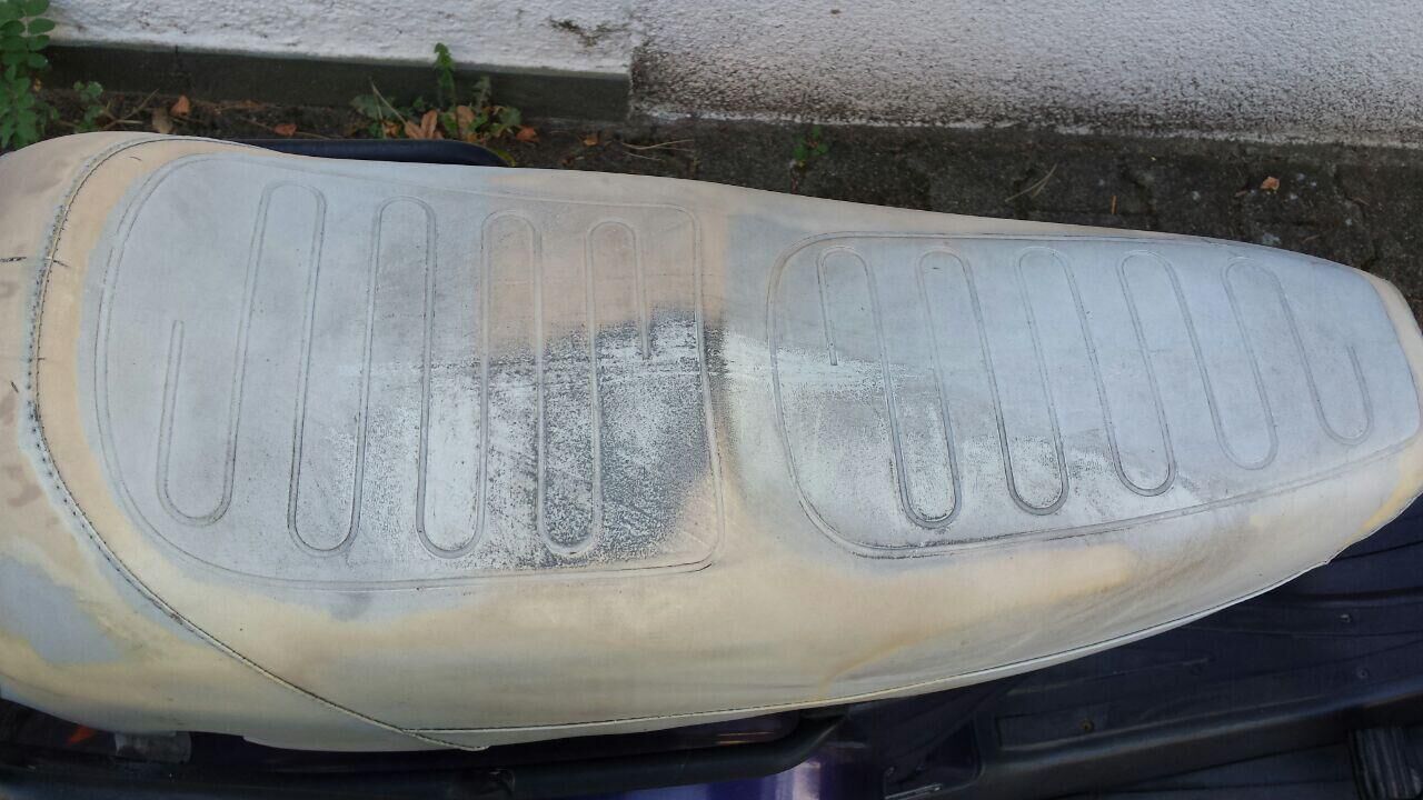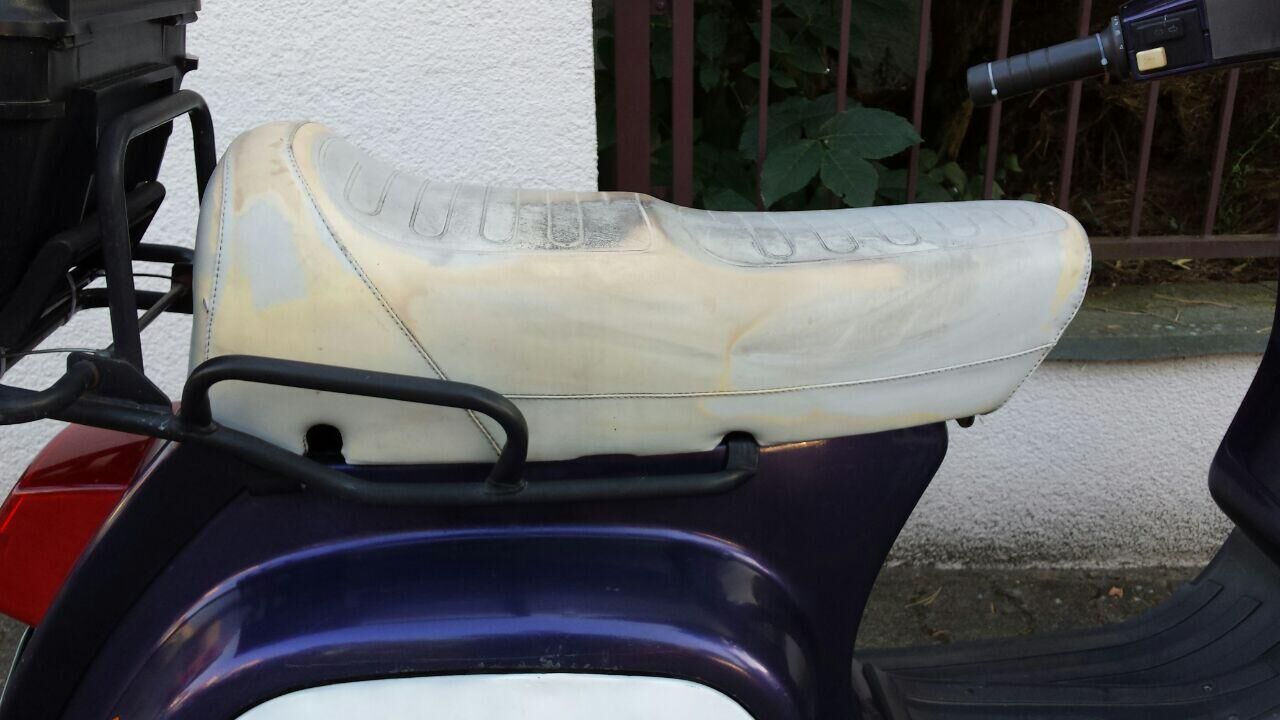 wie auf den Bildern zu sehen, ist der weiße Sitz meiner Vespa durch das Tragen von einer dunkelbraunen Lederhose aufgeraut und verfärbt. Aber auch andere Macken sind dabei.