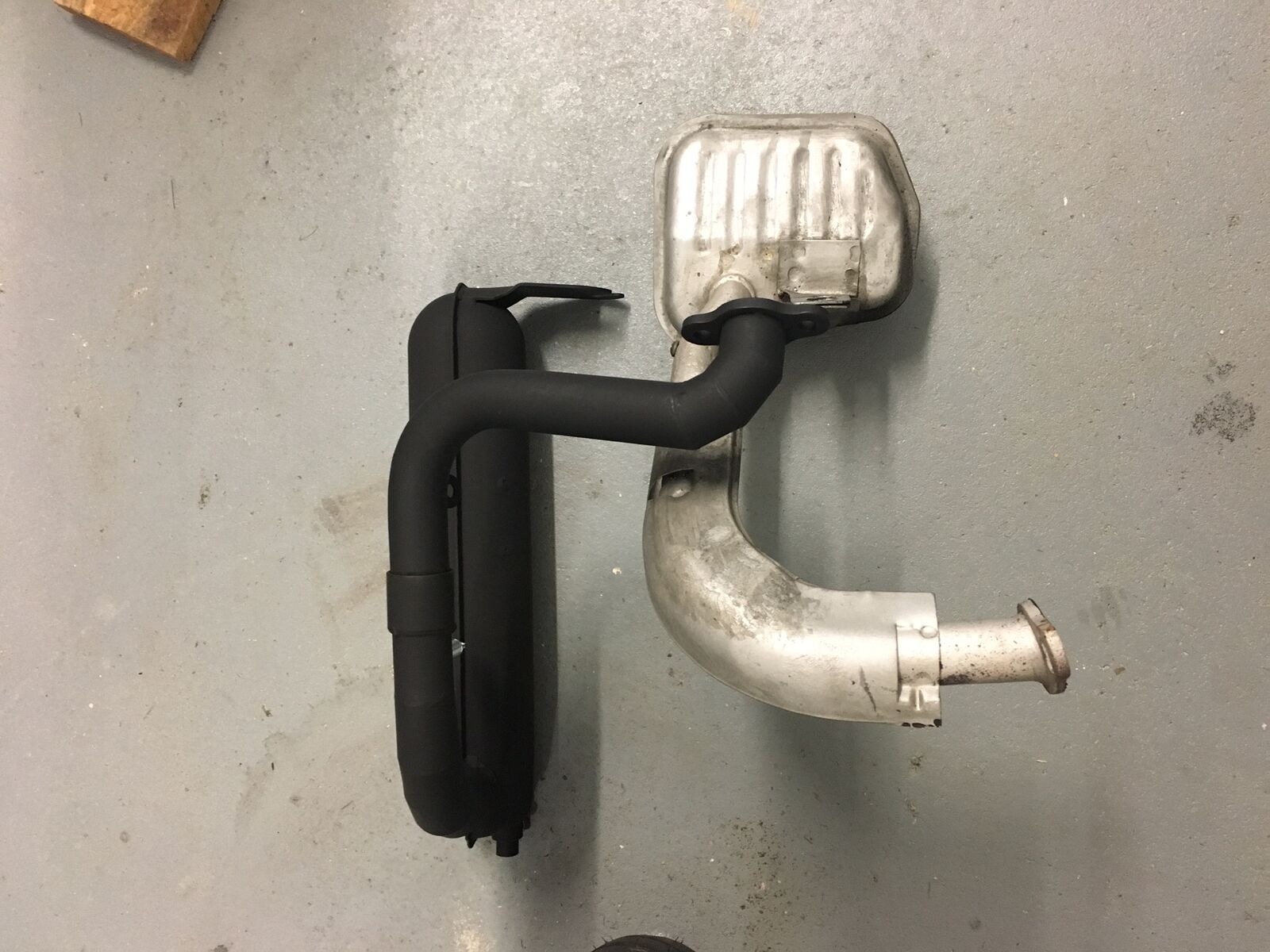 Während des Auspackens kam die ersten Zweifel auf ob das passt. Ich habe mal ein Foto vom Originalen Auspuff und von der Banane angehängt. Die Motorhalterung ist auf der gleichen Höhe. Wenn ich das Teil mit dem Krümmerflansch an die Verschraubung vom Zylinder hinhalte, dann ist hier das Getriebe im Weg (und das nicht nur ein bisschen).
