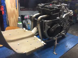 Die letzten Tage lief es eher zäh am Projekt. Auch wenn ich vorher rumgetönt habe, dass die Hauben nun fertig wären, so gab es da doch eine ganz kleine Unwahrheit. Vorne links ist die Wasserpumpe am Motor so dick, dass die Haube anliegt. Ich habe dann alles aufgetrennt, ausgedengelt und neu vernäht. Das sieht so scheisse aus, das ich mich nicht mal traue davon Bilder zu machen. Na, ja. Man soll ja nicht hungern ohne zu frieren. Nach der Aktion war die Haube zu kurz. Es fehlten plötzlich 5mm. Also wieder mit der Flex durch die Haube. Zum Schluss habe ich noch den Ausschinitt für den Kickstarter versetzt. Jetzt sitzt er 3 cm weiter hinten und ich muss die Steckachse nicht peinlich genau gürzen, sondern sie geht beim Einfedern nun frei. Das ist auch ordentlich geworden, deshalb gibt es davon jetzt ein Bild.