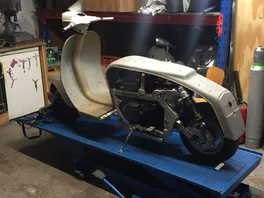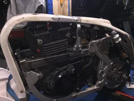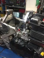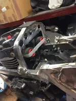 In der Zwischenzeit ist nicht viel passiert. Die hinteren Trittblechhalter sind in Position, die Schwinge ist geputzt und die Schubstrebe der hinteren Bremse gebaut und positioniert. Das vordere Lenkrohr ist um 29mm auf das Maß einer GP gekürzt (es ist ja ein LI Rahmen) und die obere Lenklagerschale abgedreht. Es geht schon voran.