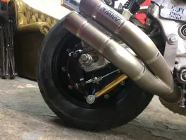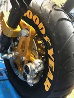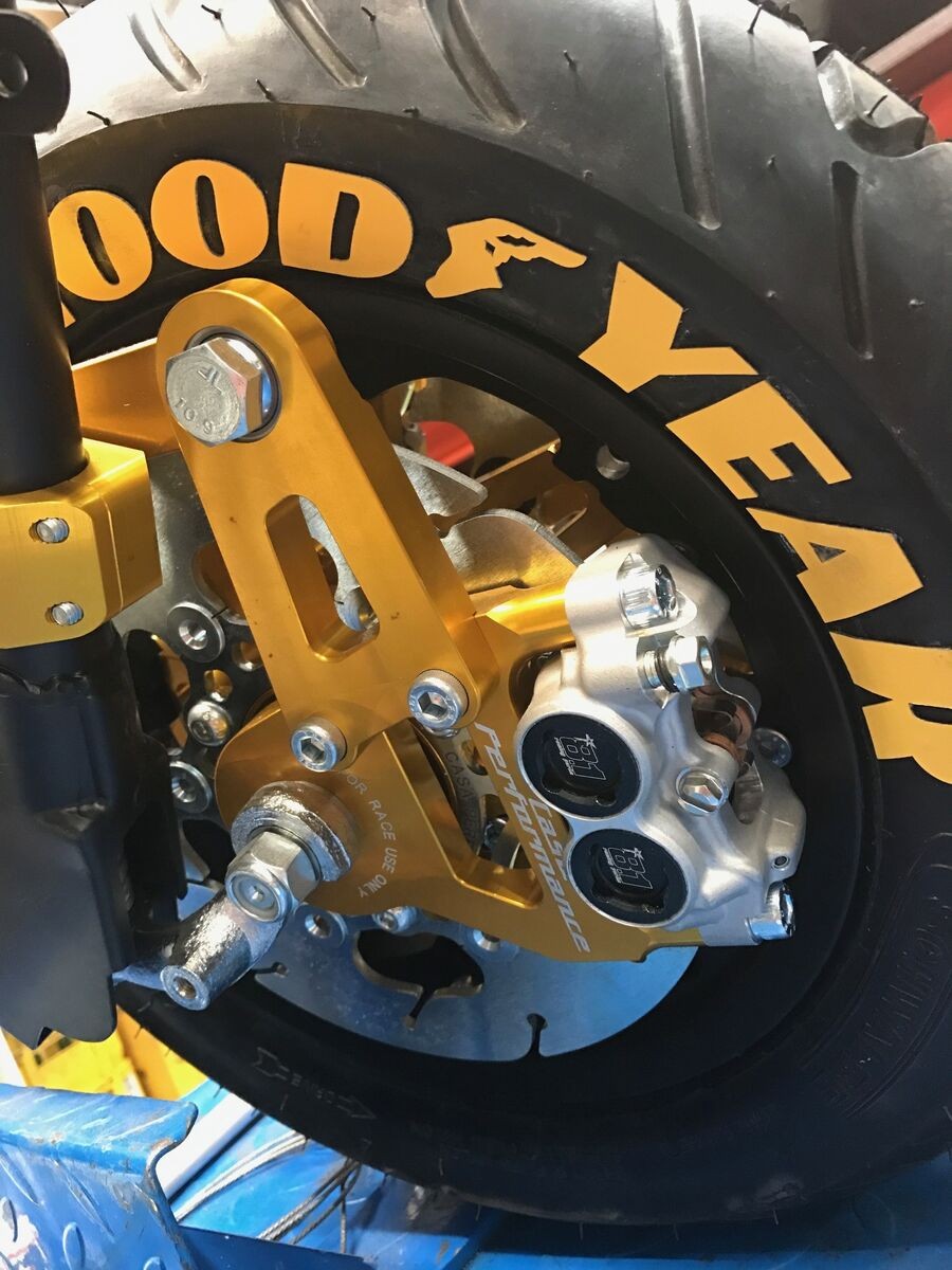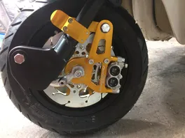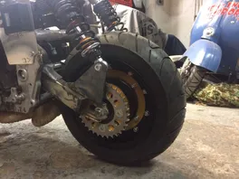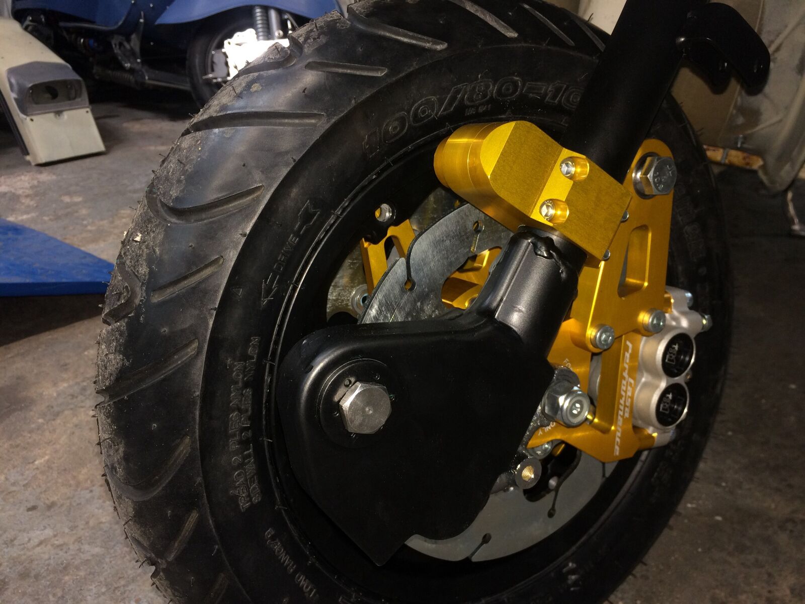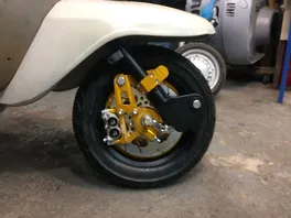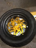 Alles fing damit an, dass ich mir eine Bremsanlage von CasaPerformance zugelegt habe. Bei dem Komplettset war auch eine Schlauchlosfelge dabei, damit das alles passt, wollte ich da auch gleich den Reifen drauf montieren, der auch später gefahren wird. Also habe ich dann die Felge entsprechend pulvern lassen und wenn man schon was weg gibt, dann kann man ja auch gleich den ersten Schwun Teile pulvern lassen. So habe ich mir 3 Wochen Stillstand eingehandelt. Wenigstens war ich so schlau und habe gleich alle anderen Alu-Teile zum eloxieren gegeben, damit es am Ende zur Bremse passt. Jetzt ist das Zeugs zurück und alles montiert. Ich habe noch eine Schwalbe Raceman Bereifung (1x 100/80-10 vorn und 2x 130/70-10 für hinten) aufgetrieben. Meiner Meinung nach einer der besten Rollerreifen, die es gibt -bzw gab, sie werden nicht mehr produziert. Die Reifen haben einen Geschwindigkeitsindex von 150 km/h. Das waren in diesen Dimensionen die einzigen auf dem Markt.