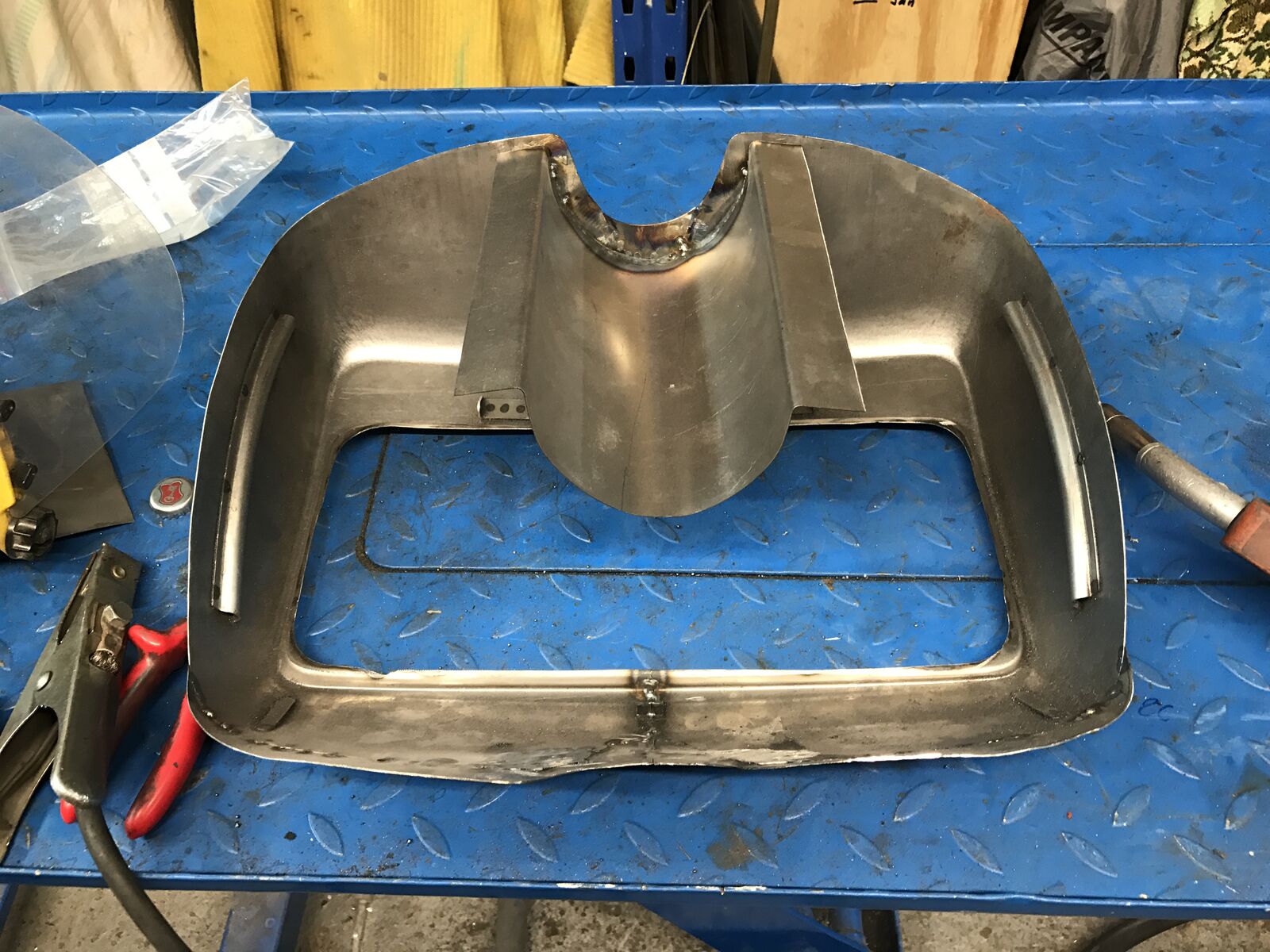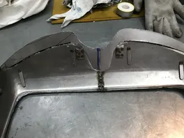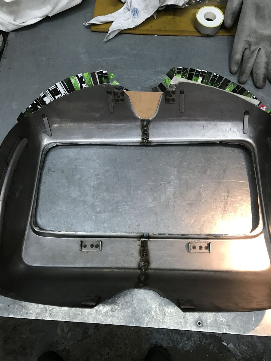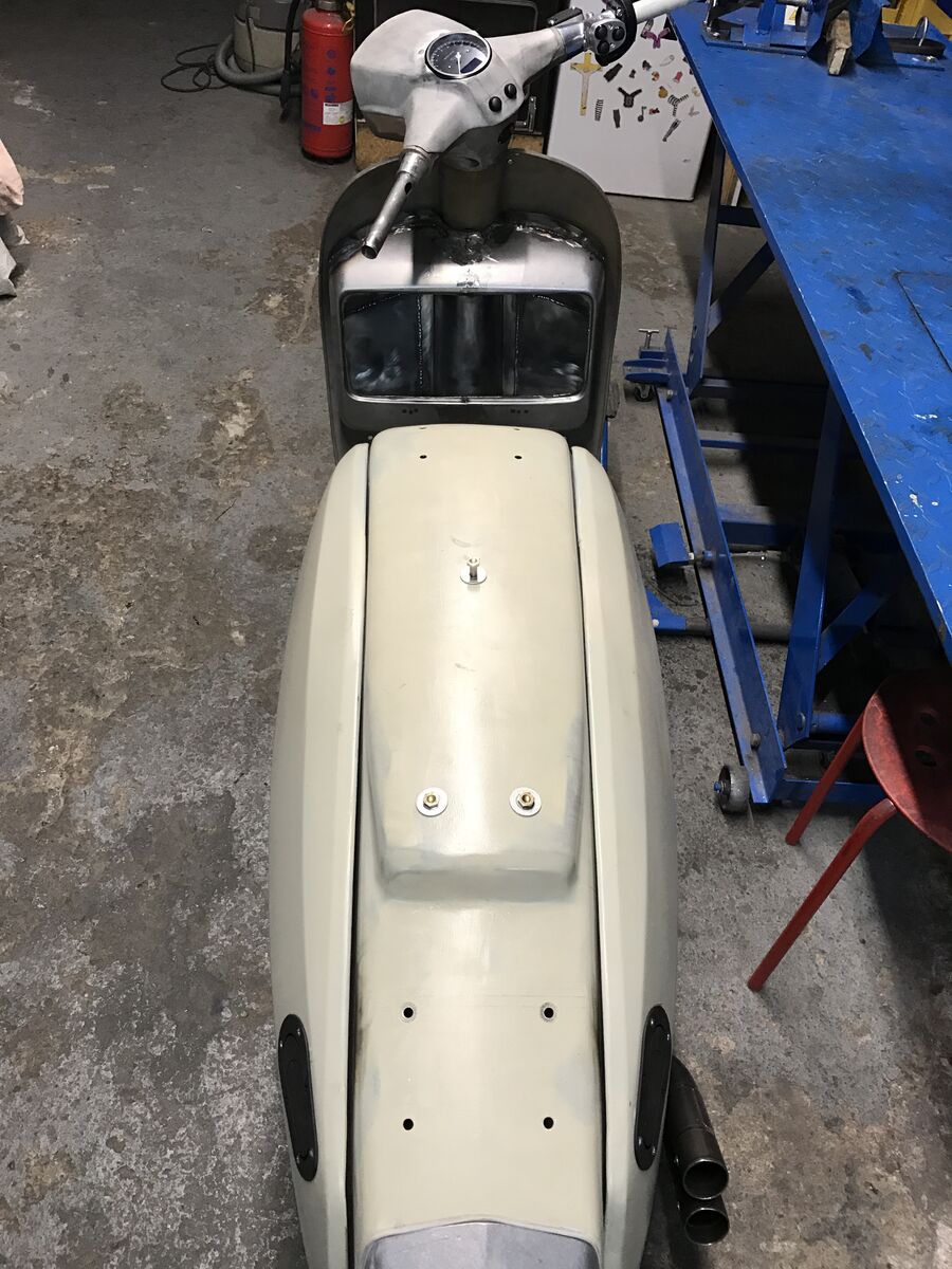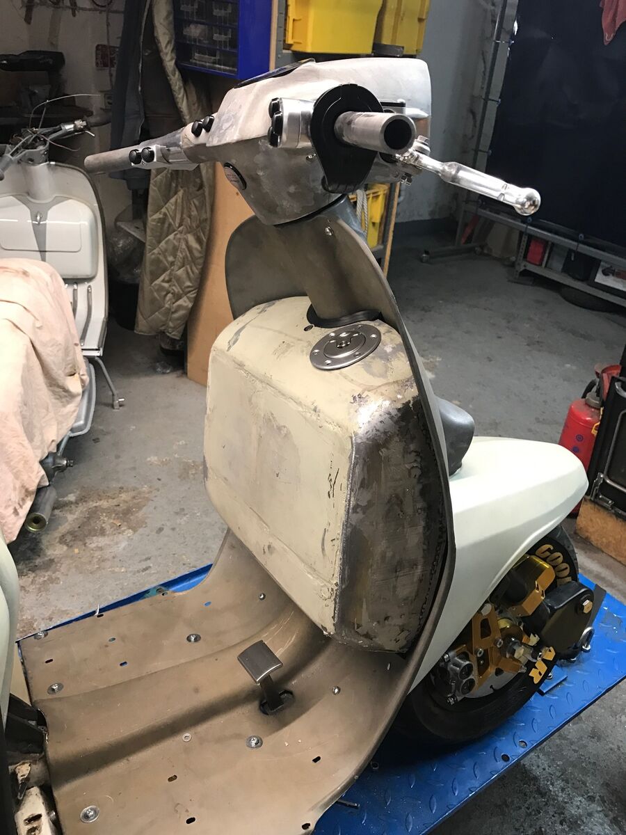 Für Lambrettas gab es nie Handschuhfächer, es wurden immer Vespa Sprint/Rally, oder PX Alt/Neu Fächer angepasst. Zur Form der GP, die ja sehr wenig barock daherkommt habe ich mich für ein PX Alt-Fach entschieden. Ich rechne mit ca. 8-10 Litern Tankinhalt. Damit sich Handschuhfach besser ins Beinschild fügt, habe ich um 15mm aus der Mitte herausgenommen. Für die große Sicke in der Rückwand habe ich das Blech über der Ventilschutzkappe von der Schutzgasflasche gebogen. Die Form der Blechstreifen, die den Spalt füllen, der sich aus den unterschiedlichen Formen des GP und Vespa Beinschildes ergibt, ist mit Doppeltape und kleingeschnittten Sixpack Trägern ermittelt. Unten kommt der gute Benzinhahn mit elektrischem Reservestandschalter rein und oben ein Newton Deckel. Zum Schluss wird von außen noch der Deckel eingeschweißt und am Ende alles mit KSD 2+2 aus dem Korrosionsschutzdepot versiegelt und damit auch abgedichtet. Tolles Zeug! Es verschließt sogar Stecknadelkopf große löcher zuverlässig und dauerhaft.