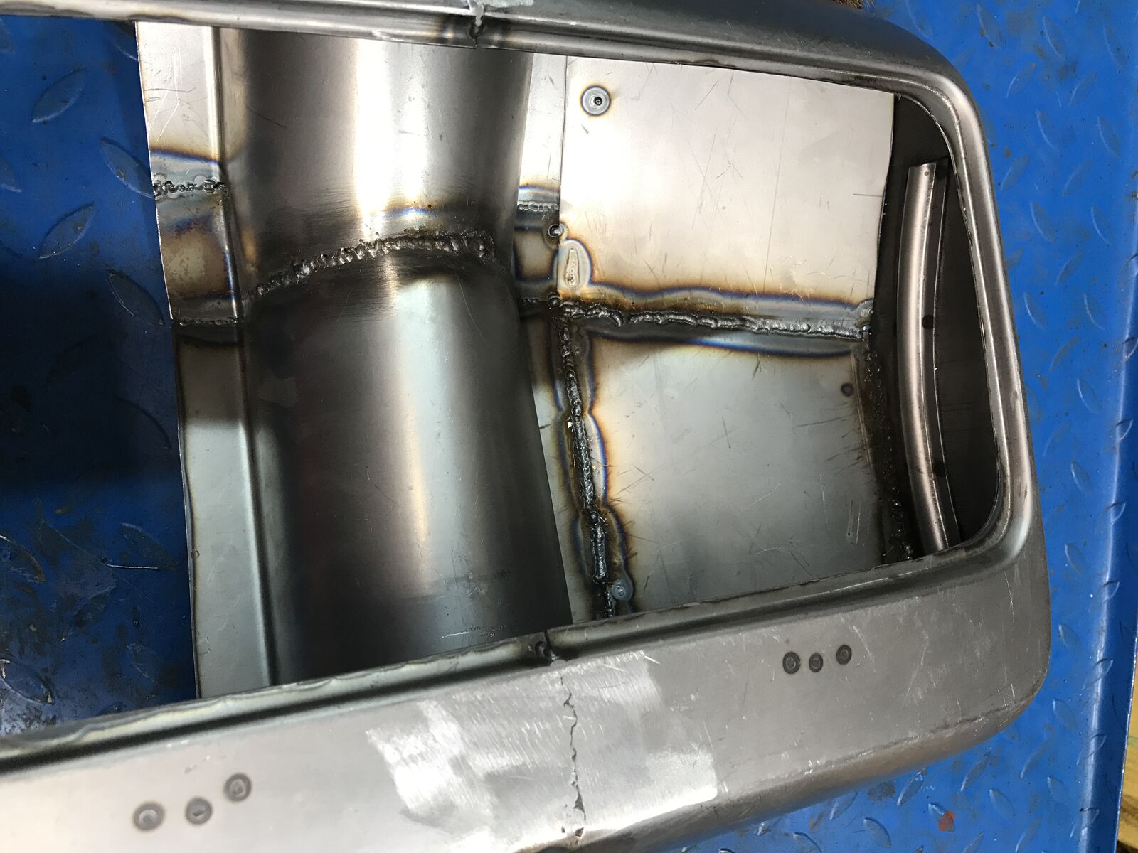 Quält man sich durch den Baubericht der Ten Inch Terror, findet man irgendwo die Stelle an der ich es kategorisch ablehne jemals wieder einen verf****ten Sche**dre***tank selbst zu bauen. Da ich ja für meine Konsequenz bekannt bin (nie wieder Alkohol, Drogen und junge Dinger) war es ja absehbar, dass ich es wieder tun würde. Nun ja - ich habe es getan, bzw ich bin noch nicht ganz fertig... Immerhin, hat man so etwas schon mal hinter sich gebracht und geht es wieder an, kann man sehr schön an sich selbst beobachten, dass man immer noch lernfähig ist. Anstatt mit dem Anspruch druck- und gasdichte Schweißnähte zu produzieren an die Sache heranzugehen, habe ich das von vorne herein gleich aufgegeben und setze auf die wunderbaren chemischen Produkte, die mir an der Terror den Tank am Ende ebenfalls gedichtet haben. Ich möchte nur ungern an meine lausigen WIG Fertigkeiten erinnern und das Massaker, dass ich damals anrichtete, als ich die Schweißnähte dicht Zinnen wollte ist mir auch lebhaft in Erinnerung geblieben. Das säurehaltige Flussmittel hat mir in sehr kurzer zeit das Blech mit einer hübschen Rostschicht überzogen.