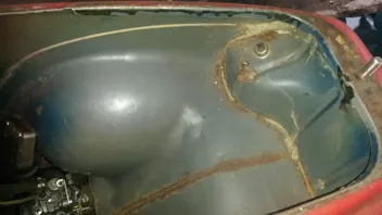 Die Stossdämpferaufnahme ist, wie erwartet, maximal grenzwertig und an einer Stelle schon durchgerostet da das ein tragendes Teil des Rahmens ist bedarf es hier dringend der Reparatur. Außerdem siehst Du, dass, ebenfalls wie erwartet, der Roller nicht original Rot sondern Blau war. Bevor Du jetzt viel Geld in Schrott investierst würde ich den Rahmen mal zum Strahlen bringen, dann kannst Du sehen ob der Rahmen schon Kernschrott ist oder ob er noch aufzuarbeiten ist. Danach würde ich mir Gedanken um die übrigen Sachen machen.