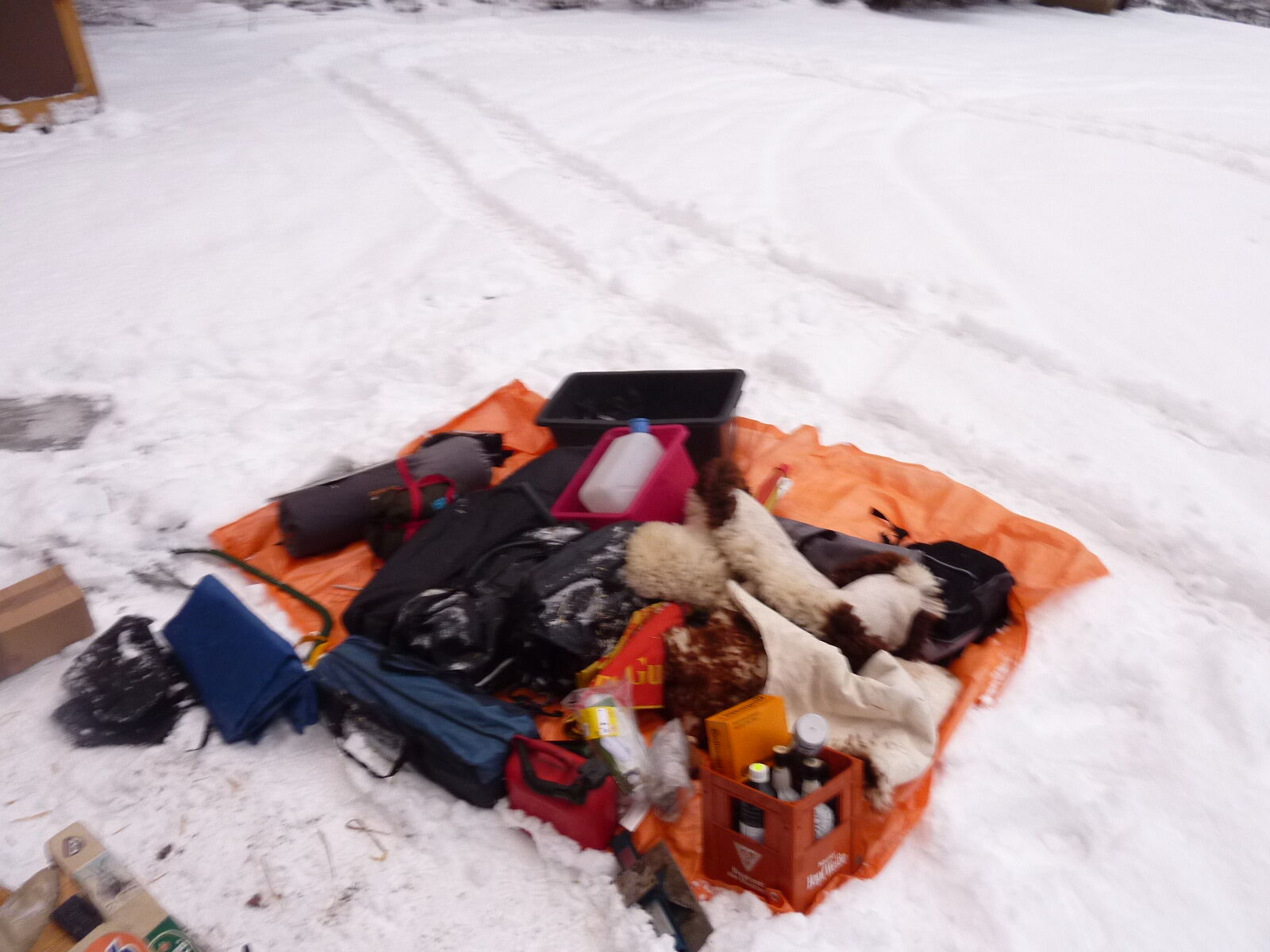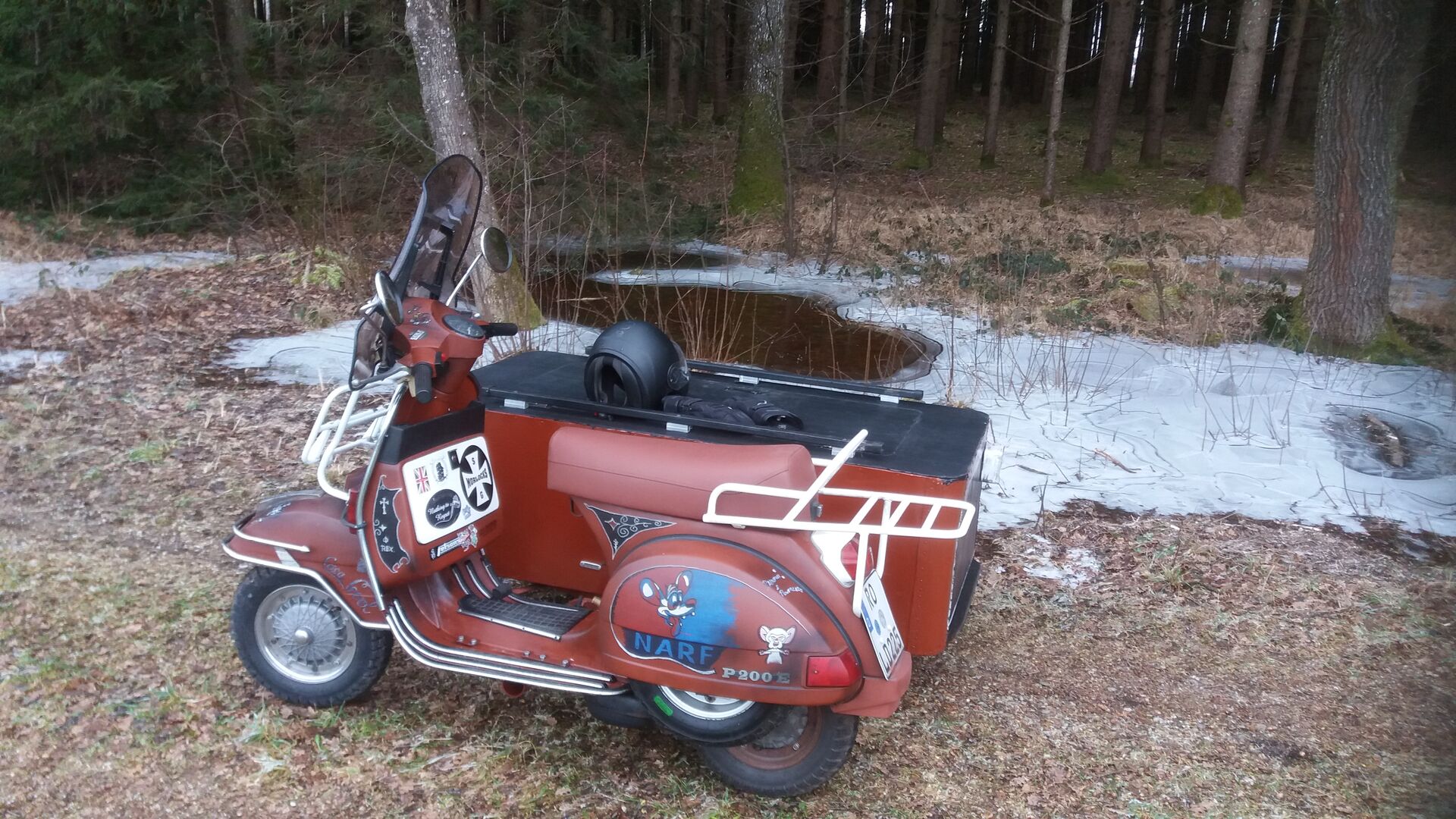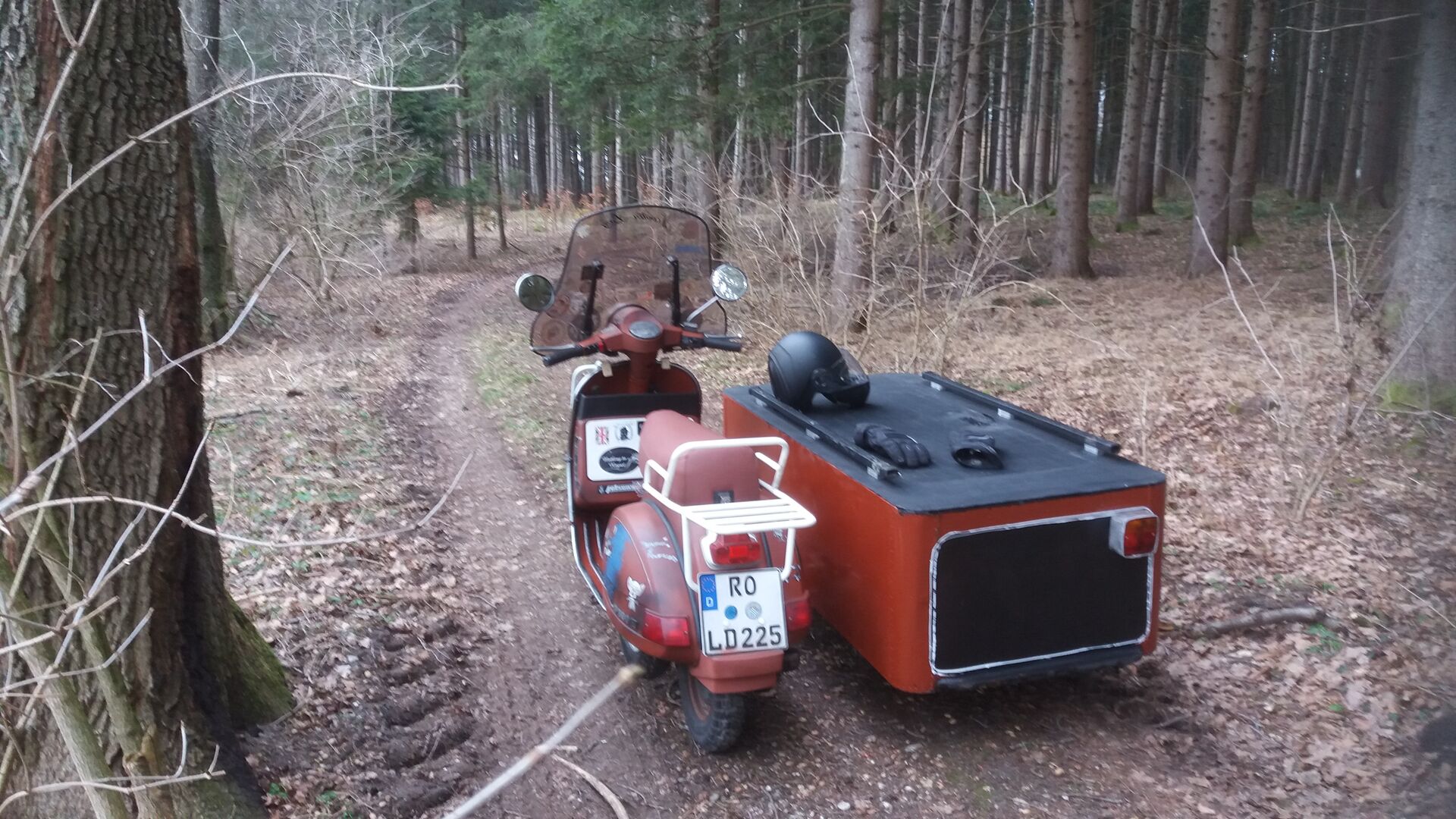 Überlegen.... Berg runter schwung nehmen rollen lassen.. schleift wirkliuch was... ca 4km zurück... okay..nen halben Rollt er der Roller.. Hautstrassse Meiden.. da stehn noch Sheriffs.. Bewaffnet...ab durch den Wald...dank Bodenfrost geht das schieben ganz gut.. bin leicht augepowert