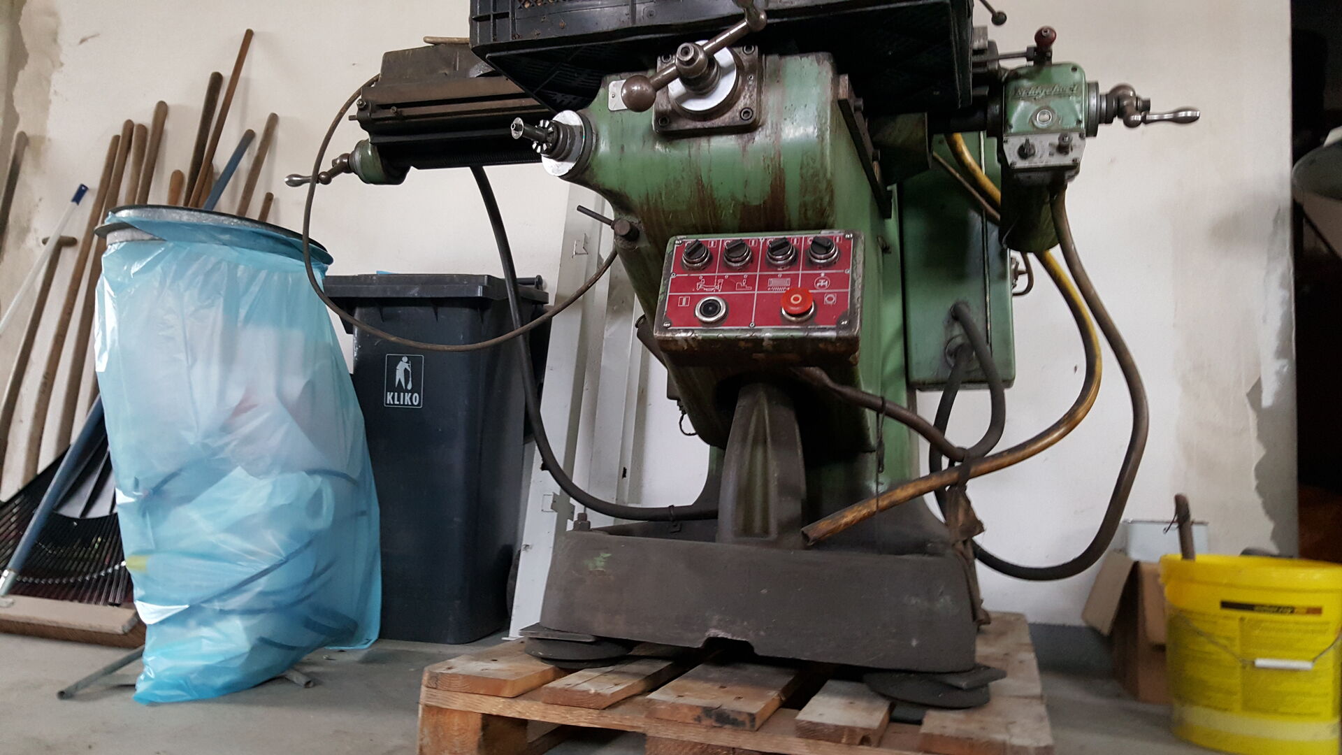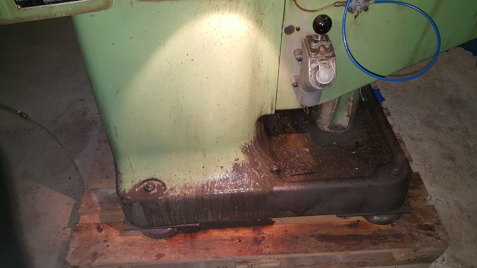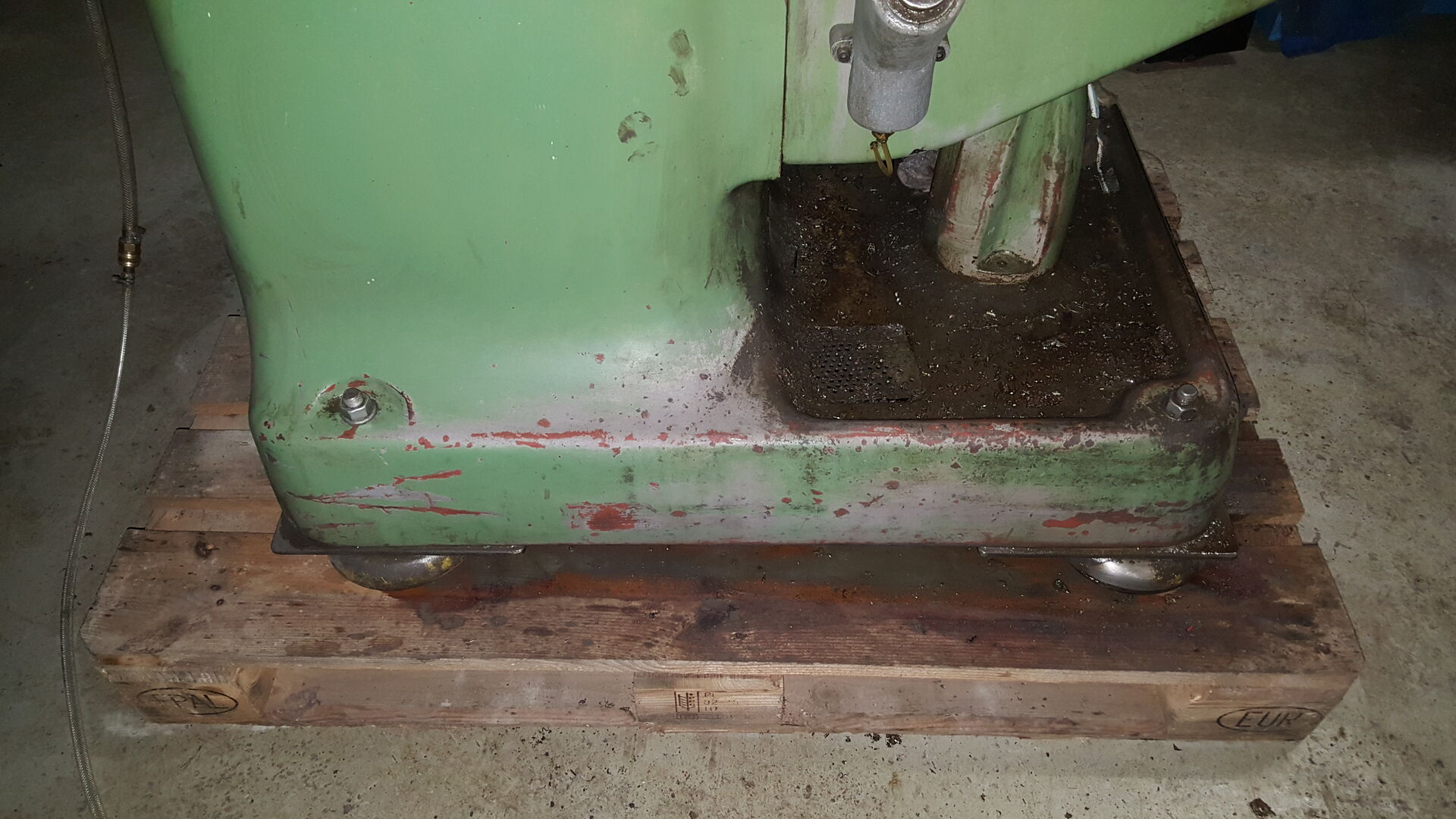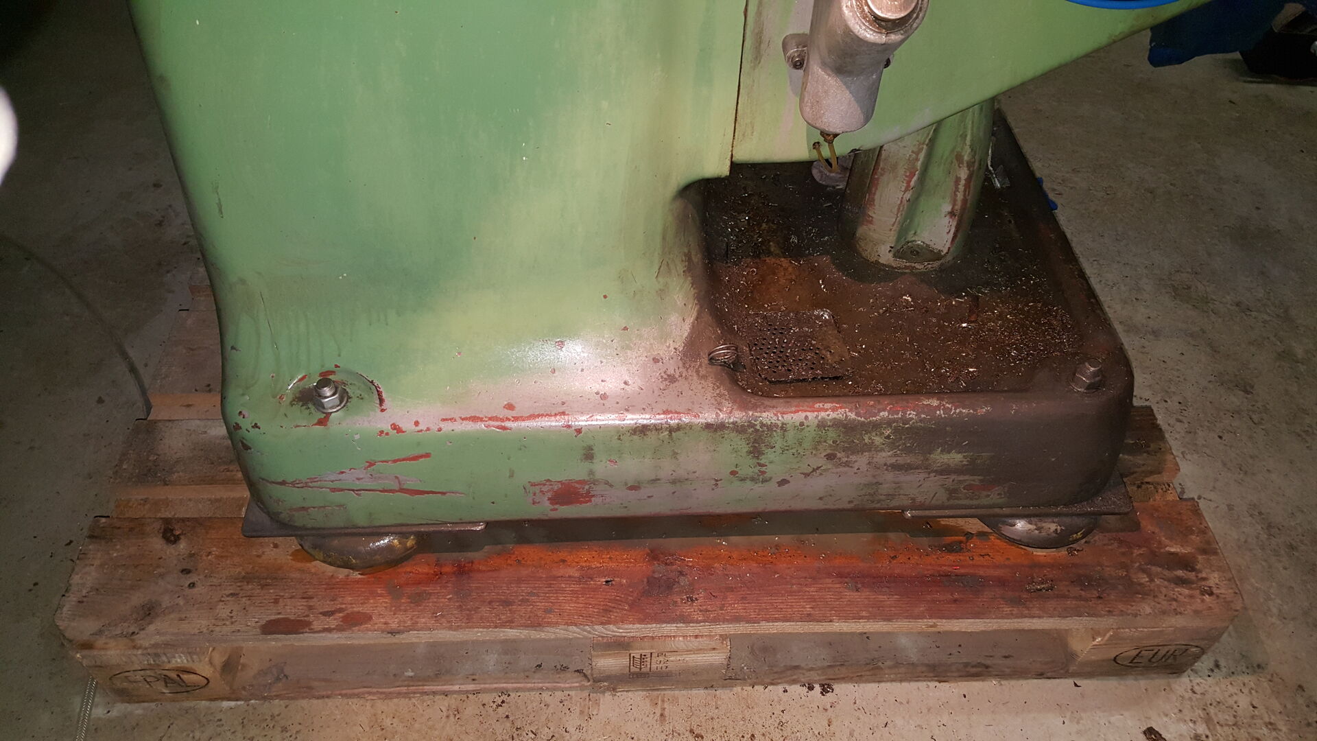 nichts desto trotz sind wir angekommen mir der Maschine. Auf dem Hof angekommen musste sie dann runter vom Hänger was dann gut geklappt hat mit einem Stapler. Die Maschine wurde direkt auf eine Palette gestellt, damit ich sie noch herum fahren kann für die Wartung. 1 Tonne mit dem Hubwagen zu schieben ist schon ein Akt. Gerade dann wenn man eine Maschine drauf hat die relativ Kopflastig ist und schwangt.