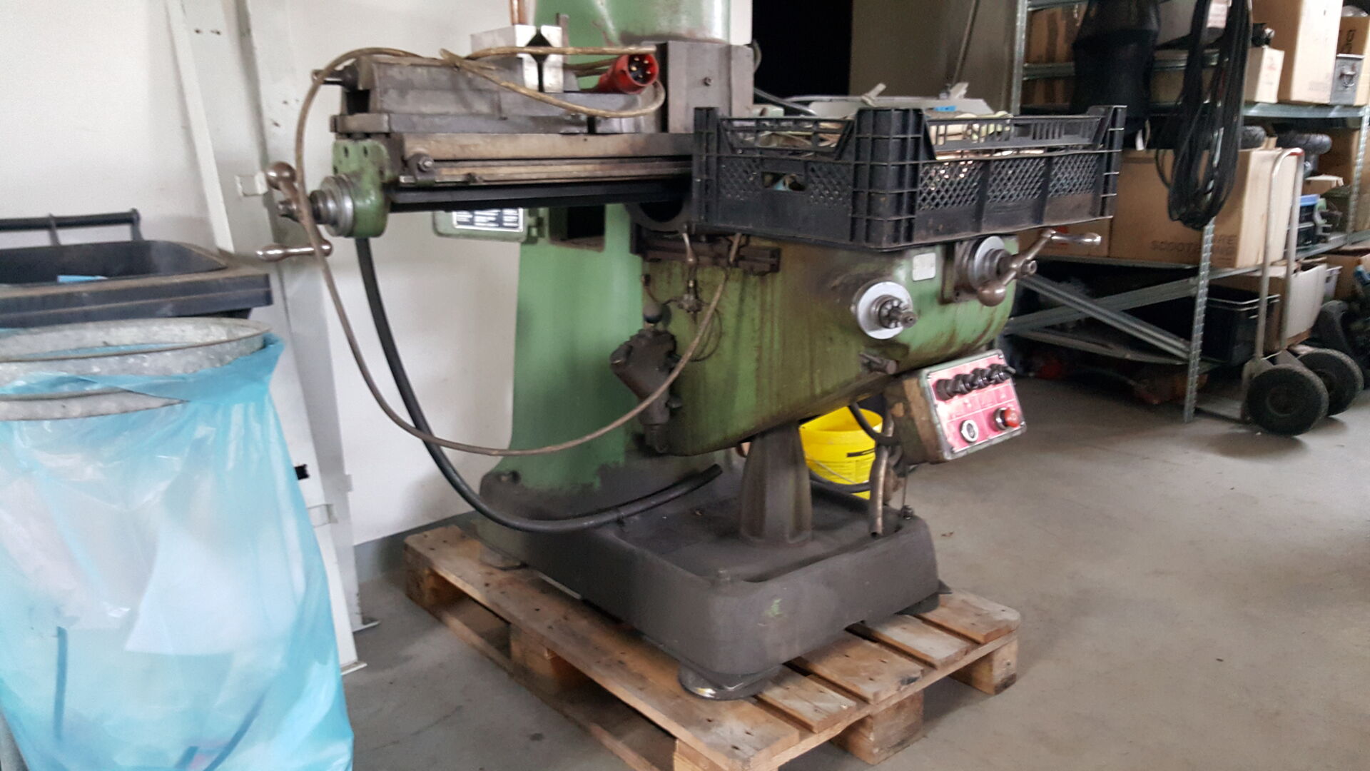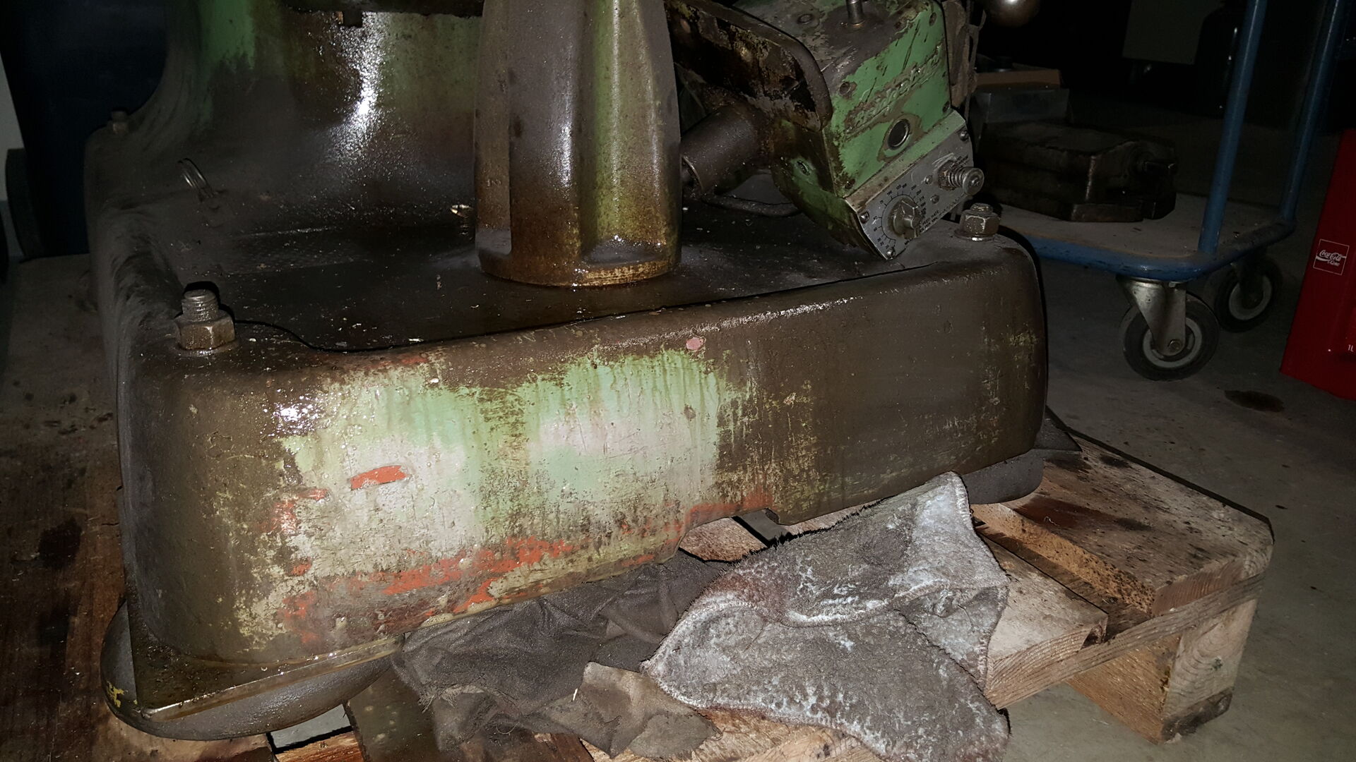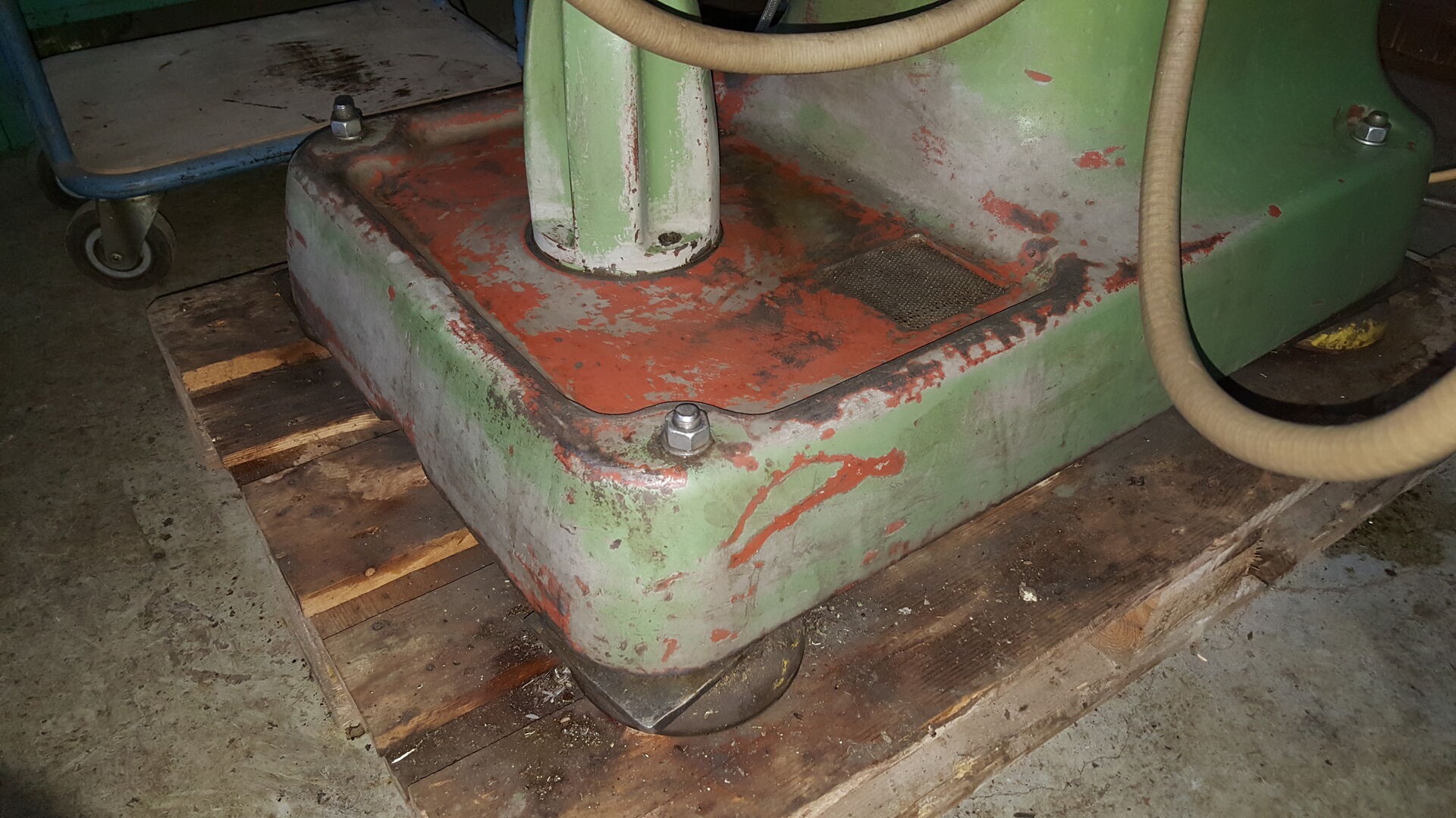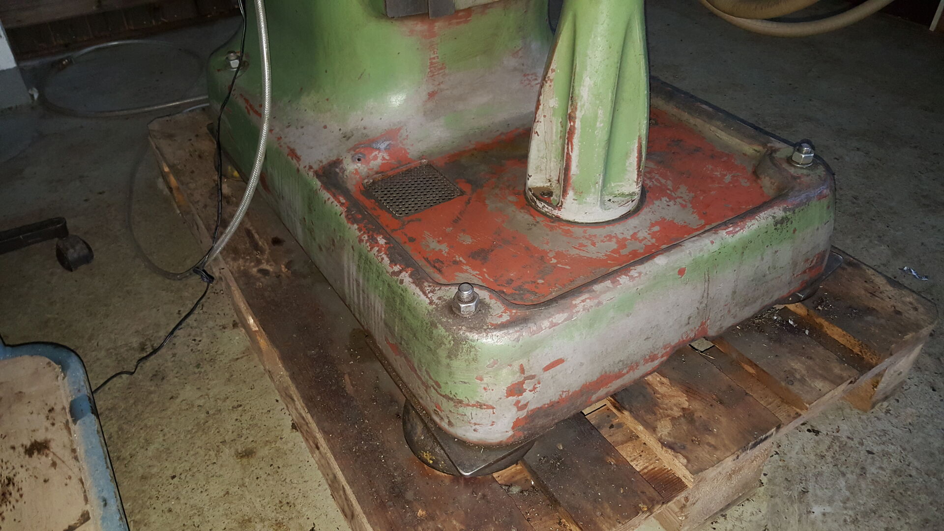 nichts desto trotz sind wir angekommen mir der Maschine. Auf dem Hof angekommen musste sie dann runter vom Hänger was dann gut geklappt hat mit einem Stapler. Die Maschine wurde direkt auf eine Palette gestellt, damit ich sie noch herum fahren kann für die Wartung. 1 Tonne mit dem Hubwagen zu schieben ist schon ein Akt. Gerade dann wenn man eine Maschine drauf hat die relativ Kopflastig ist und schwangt.