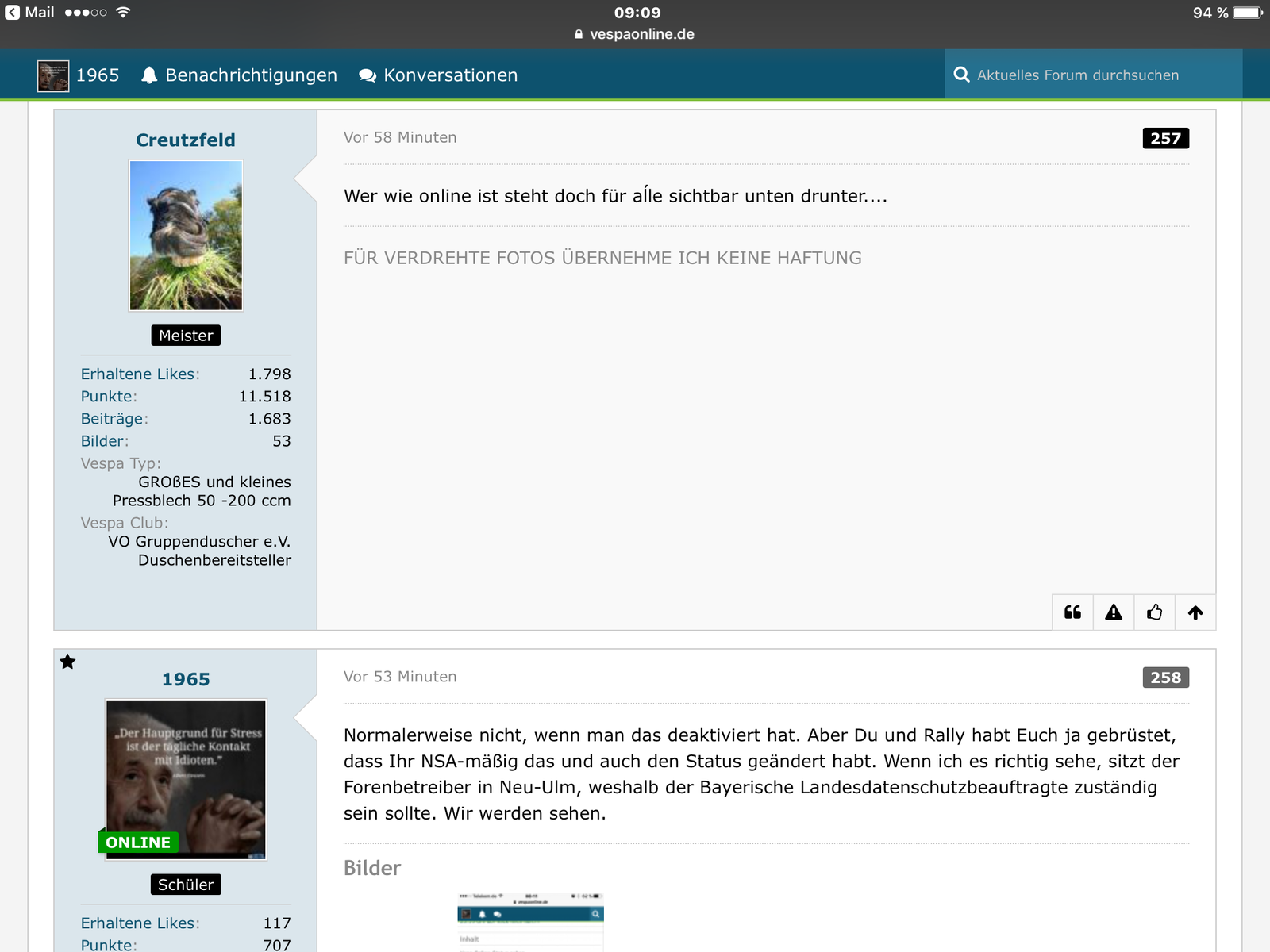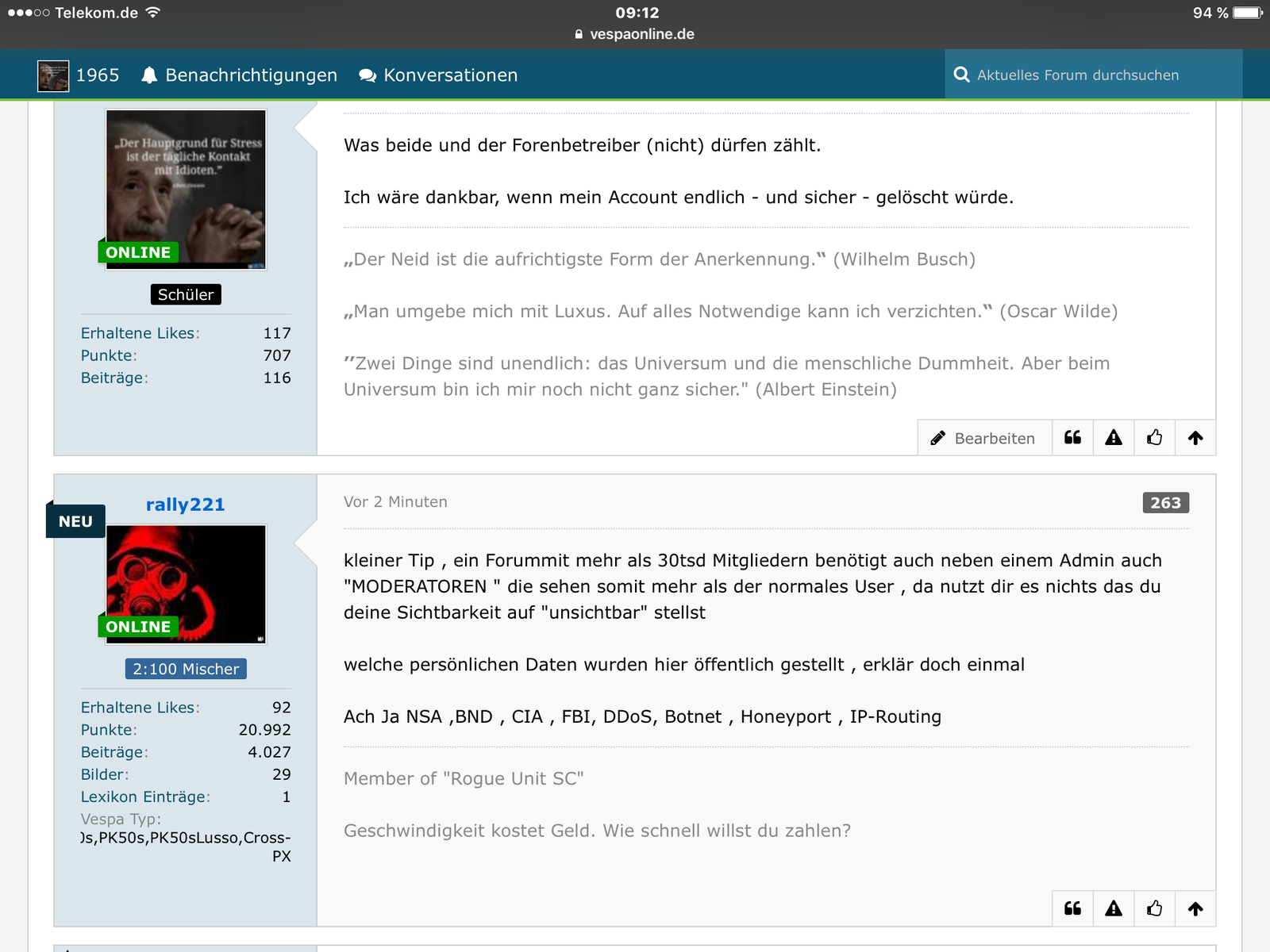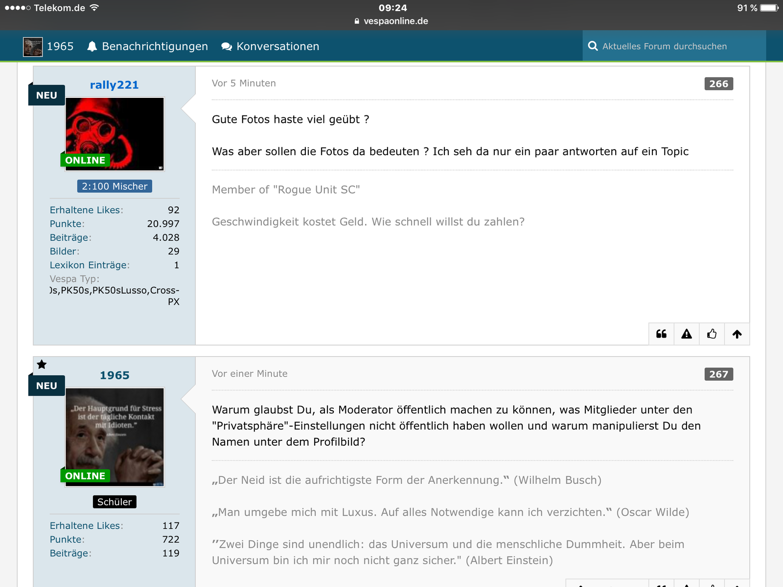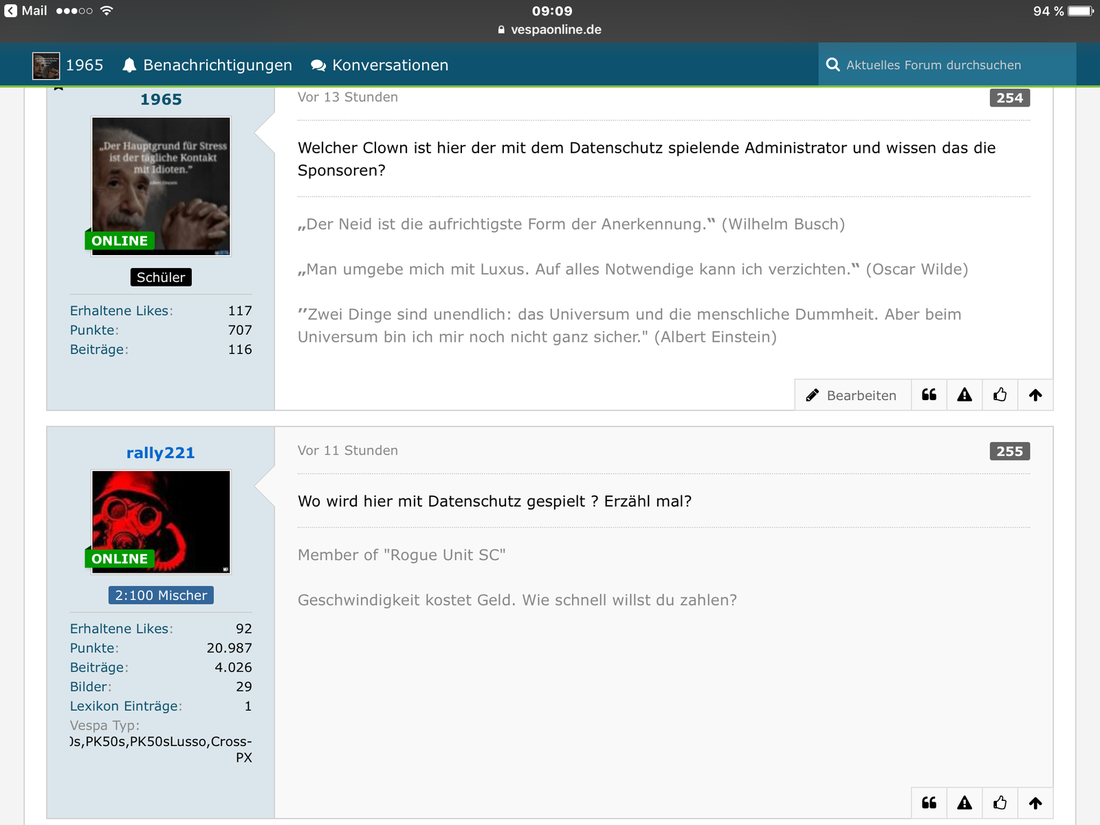 Hiermit hat Rally nach meinem Verständnis - aber wie gesagt, ich lasse das prüfen - dokumentiert, dass er seine Möglichkeiten als Moderator missbraucht und von dem Forenbetreiber nicht sorgfältig dafür ausgewählt wurde. Hier kann (und darf?) ein Moderator anscheinend ungestört öffentlich machen, was nach den Einstellungen zur Privatsphäre nicht öffentlich sein darf. Und nicht nur das, er kann (und darf?) auch beleidigende Namen unter das Profilbild setzen und brüstet sich damit auch noch. Bemerkenswert.
