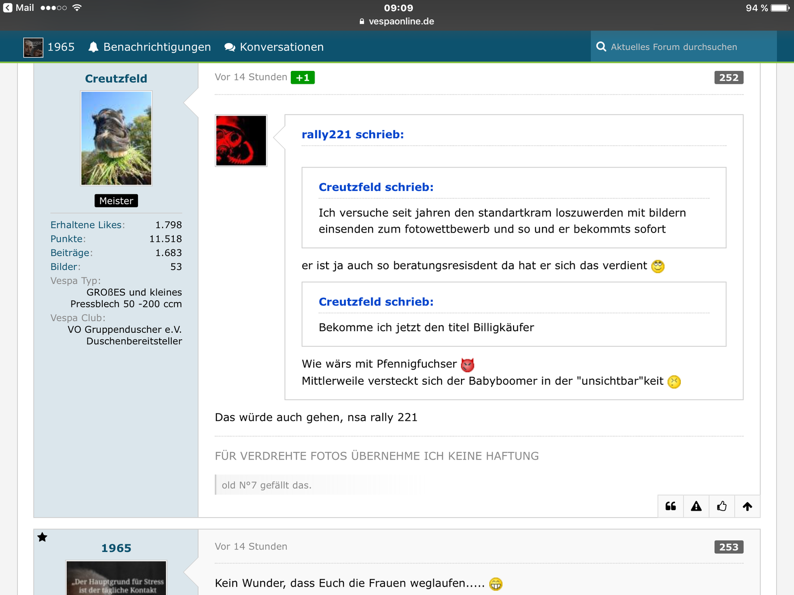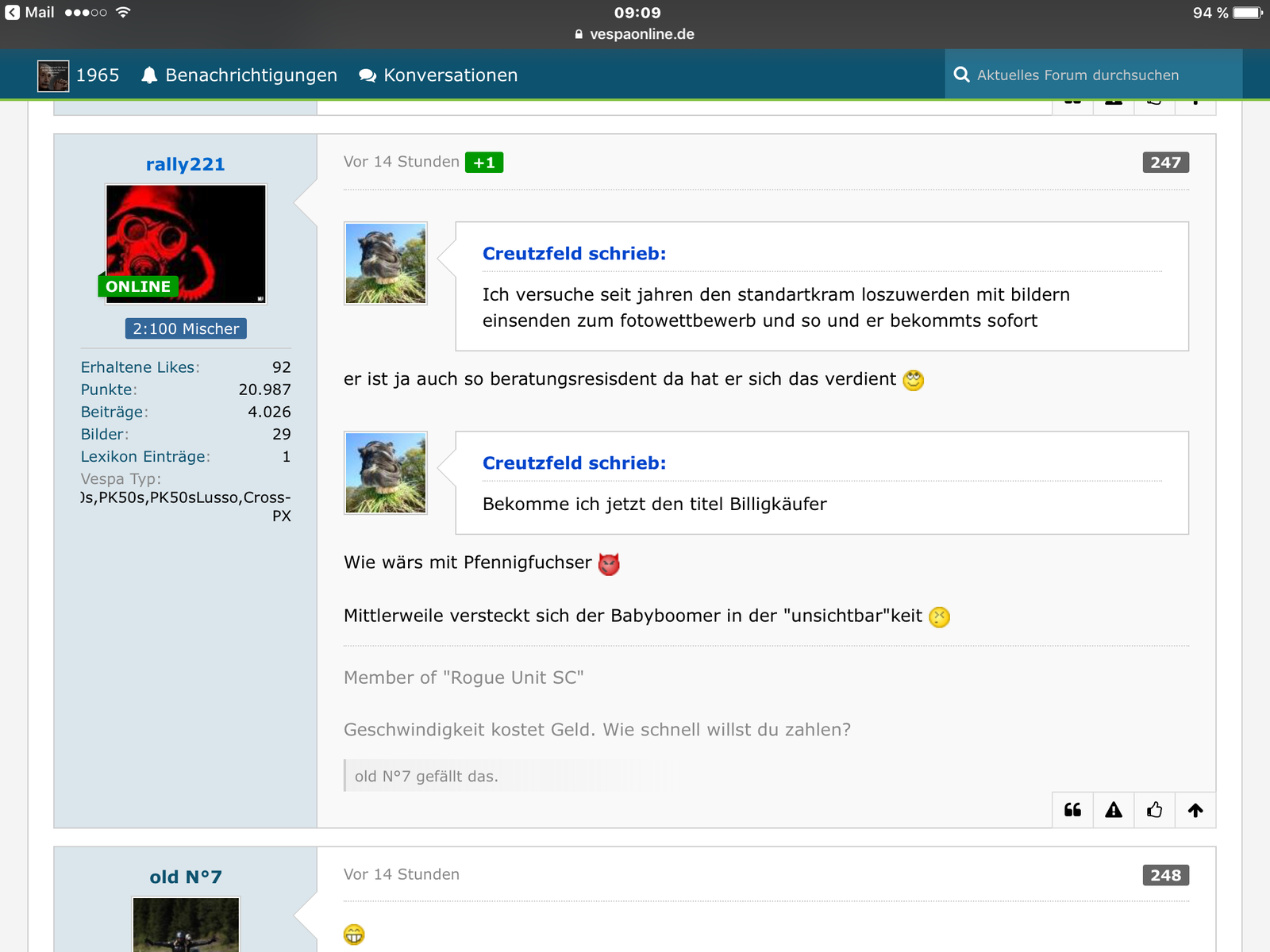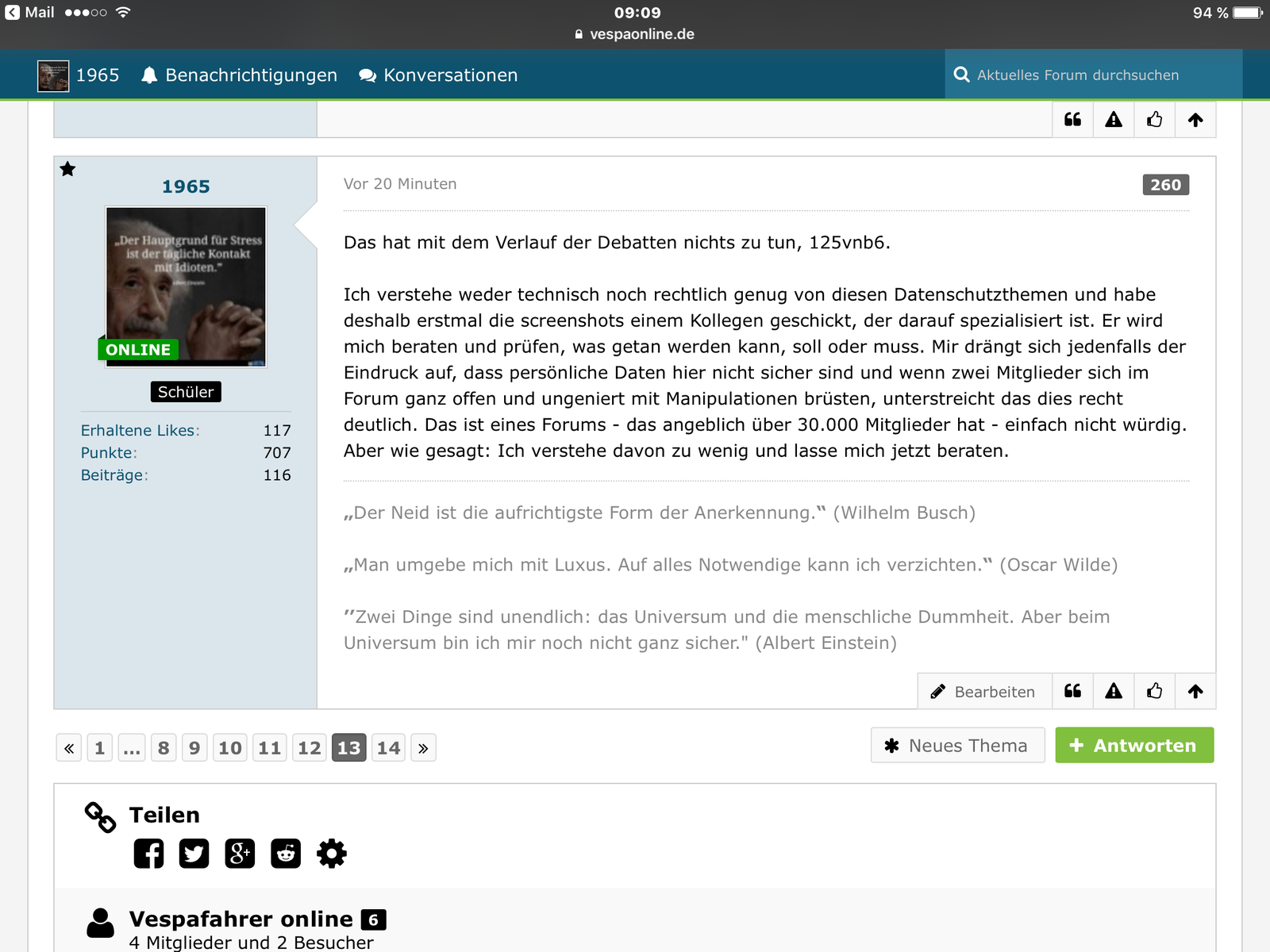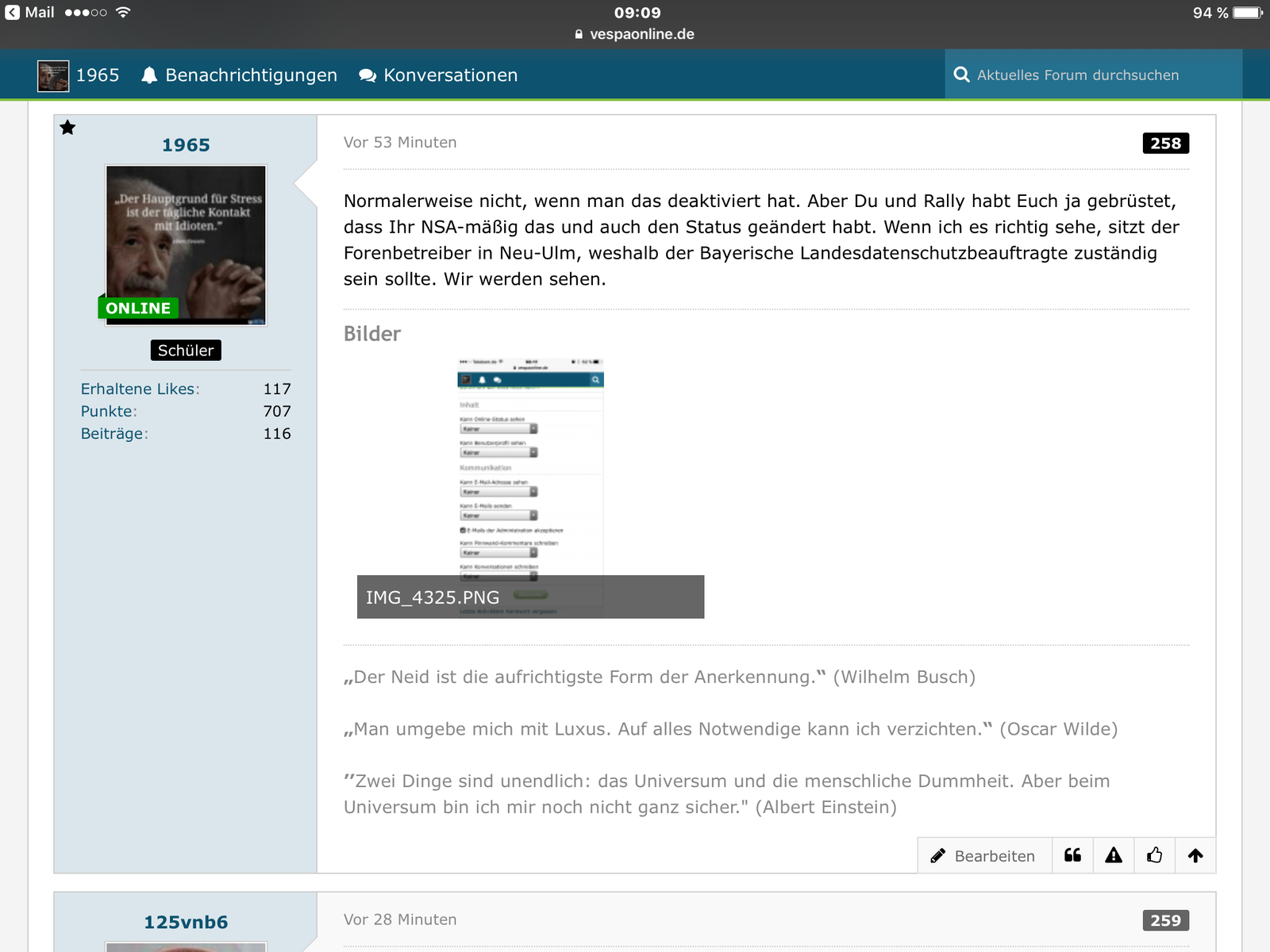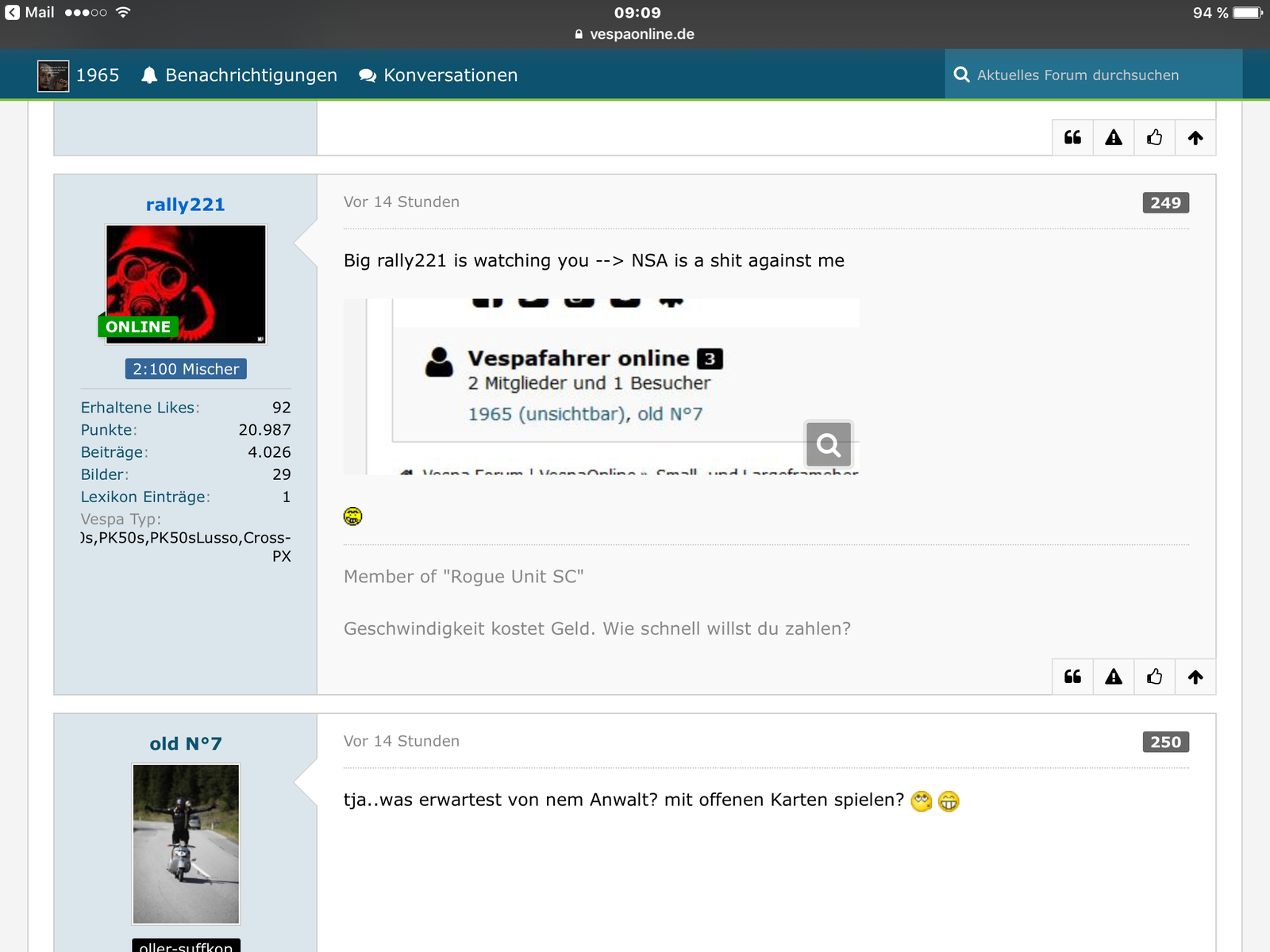 Hiermit hat Rally nach meinem Verständnis - aber wie gesagt, ich lasse das prüfen - dokumentiert, dass er seine Möglichkeiten als Moderator missbraucht und von dem Forenbetreiber nicht sorgfältig dafür ausgewählt wurde. Hier kann (und darf?) ein Moderator anscheinend ungestört öffentlich machen, was nach den Einstellungen zur Privatsphäre nicht öffentlich sein darf. Und nicht nur das, er kann (und darf?) auch beleidigende Namen unter das Profilbild setzen und brüstet sich damit auch noch. Bemerkenswert.