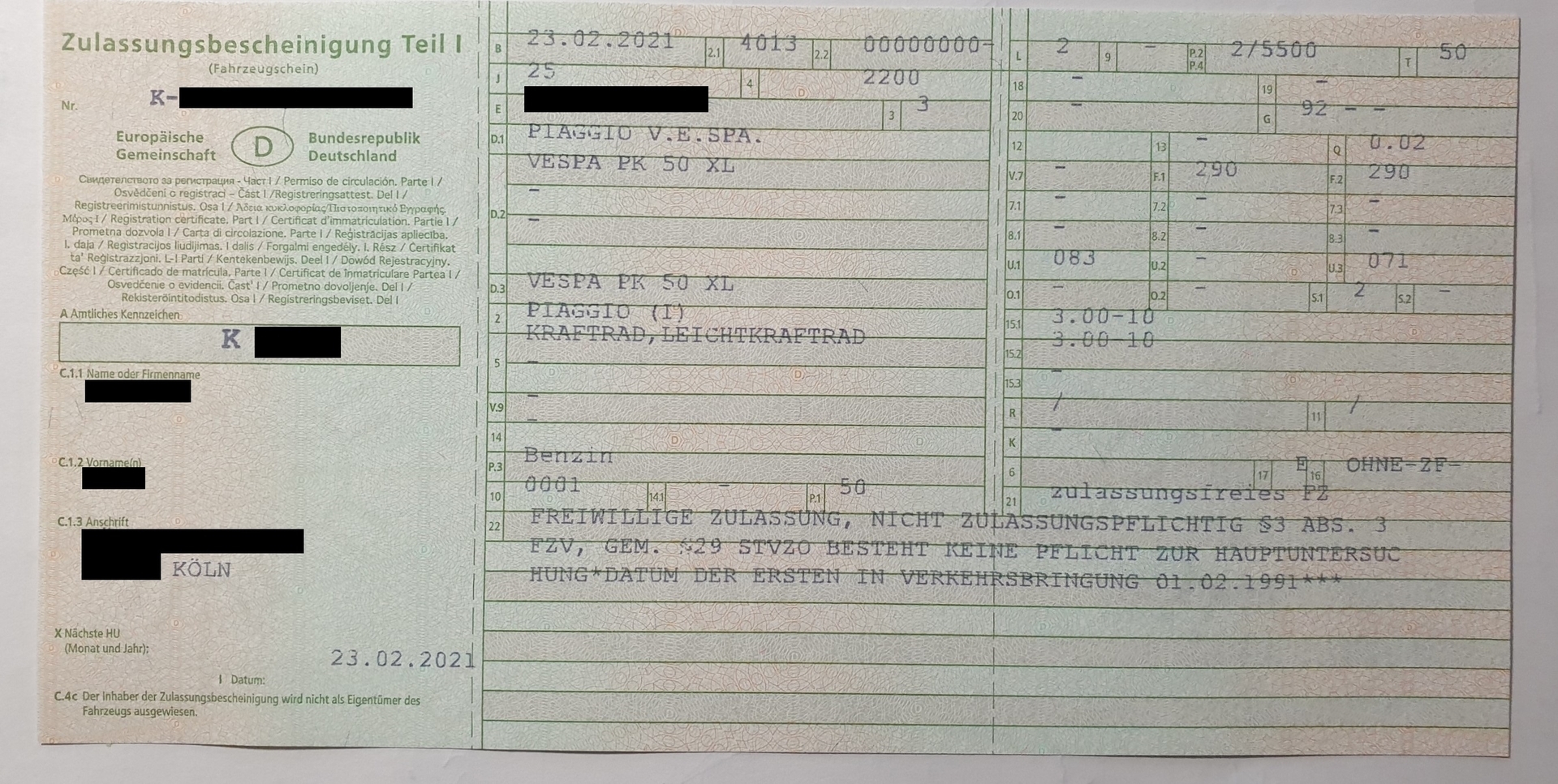 Der Roller steht nun als Leichtkraftrad in den Papieren (wenn auch mit 50 ccm und 50km/h), ich darf mit meiner Fahrerlaubnis Klasse 3 aber nur Kleinkrafträder fahren :-/