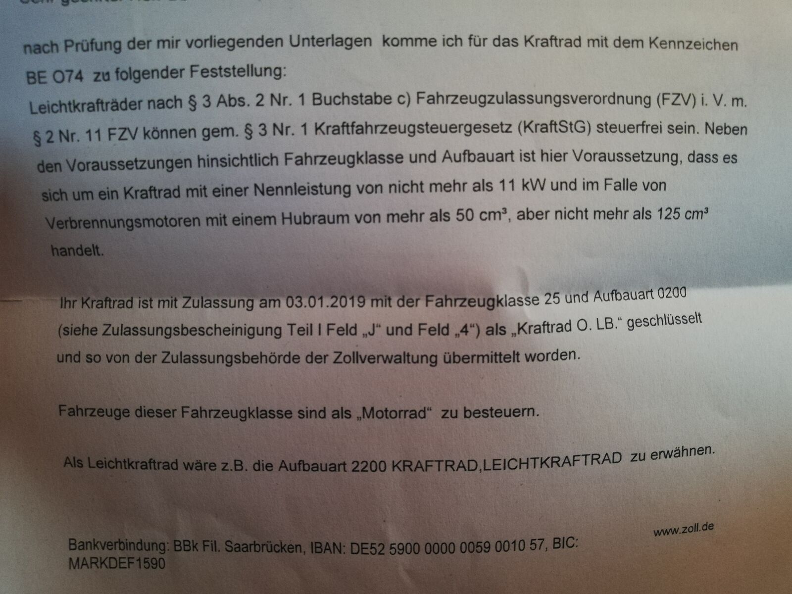 Habe mir gestern Abend die Papiere nochmal genau angeschaut. Laut Schlüsselnummer wäre es ein Kraftrad. Unten im Text steht aber Bestandsschutz als Kleinkraftrad. Heute morgen war ich ja eh bei der Zulassungsstelle. Die haben mir gesagt das die Schlüsselnummer so vorgegeben ist. Deswegen der Text unten im Anhang. Können sie auch nicht ändern. Dann beim Zoll angerufen. Die sehen die unteren Texte nicht sagte mir die Dame. Aber auf jeden Fall Einspruch einlegen. Und den Sachverhalt beschreiben. Dann würde das geändert werden und so hinterlegt werden. Dann läufts automatisch. Das Problem ist aber bekannt. Aber leider nicht zu ändern meinte sie.