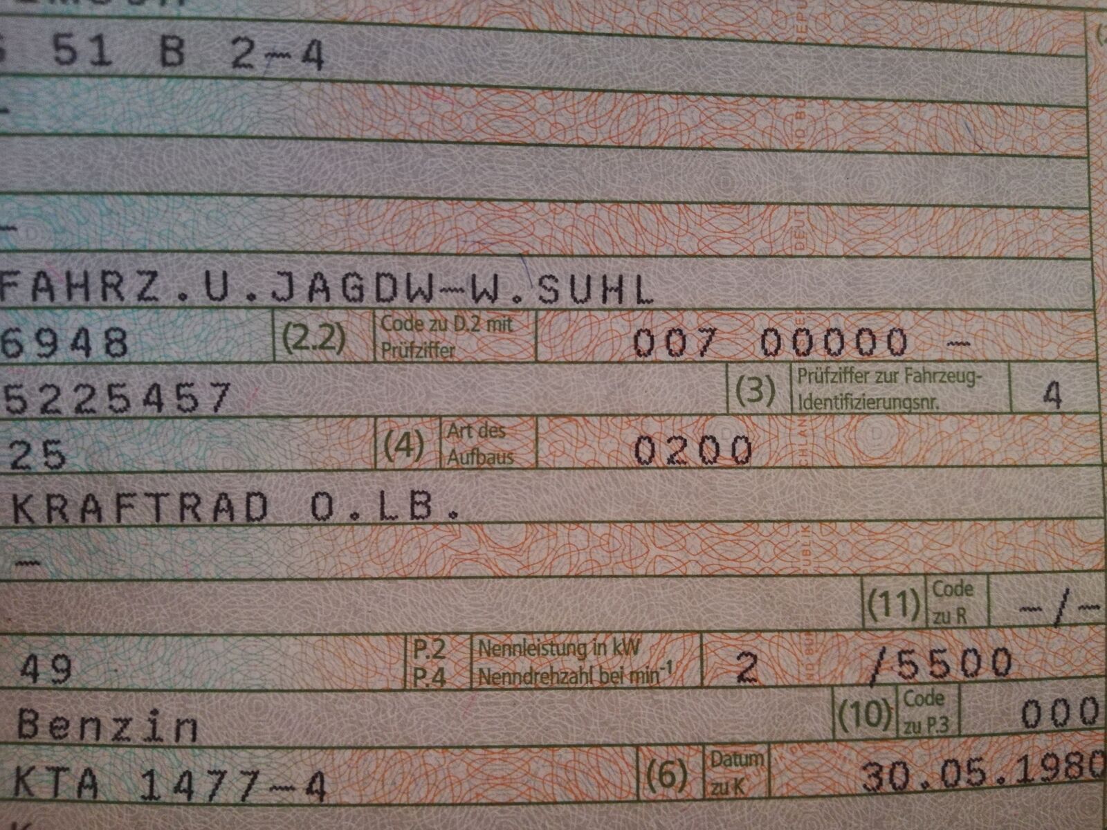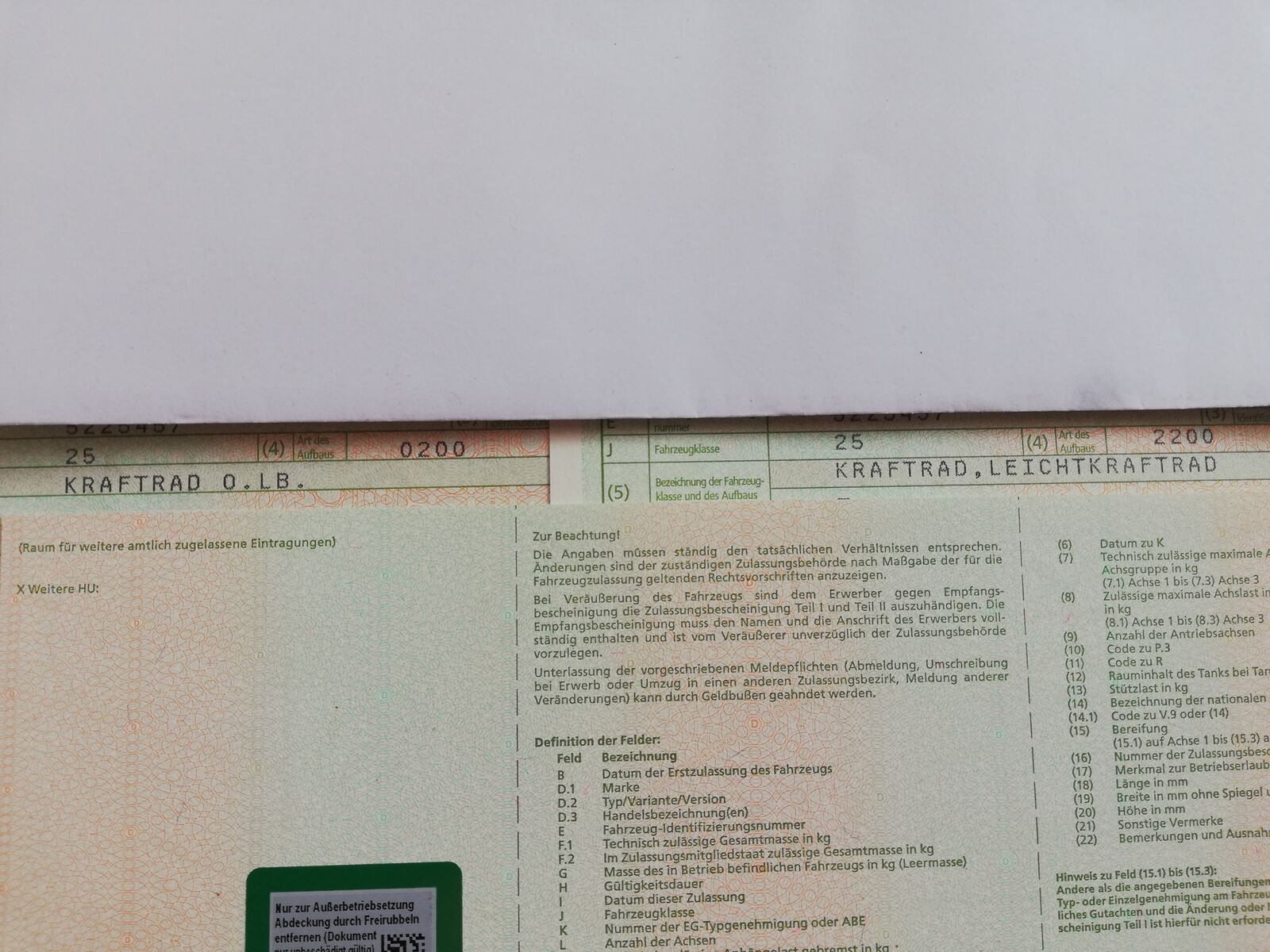Nach ner halben Std telefonieren mit ihrem Cheffe hat sie die Aufbauart von 0200 auf 2200 geändert. Jetzt isses ein Leichtkraftrad.