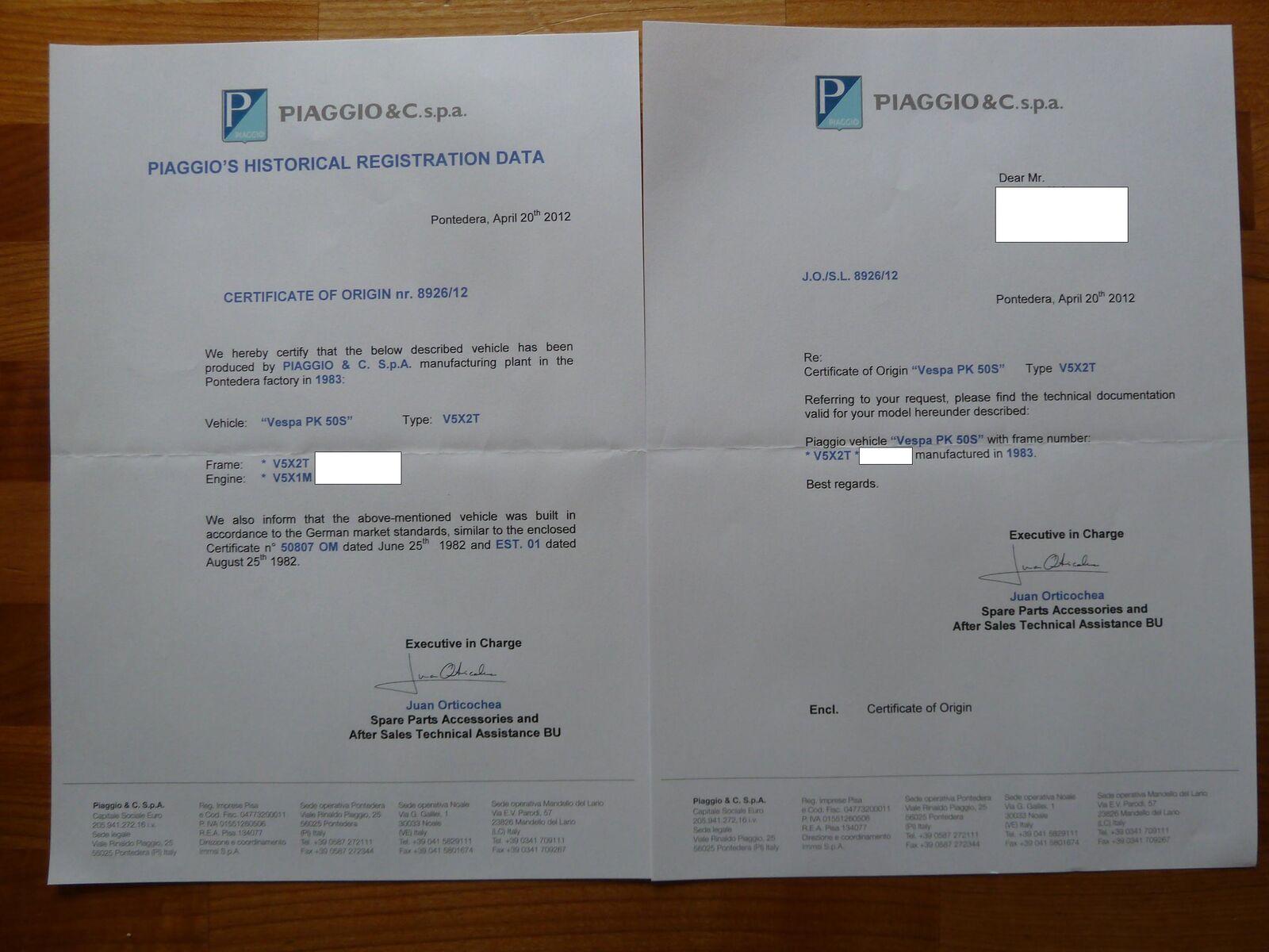 Auf unserer Internetseite gehen Sie bitte zu: Kundenservice > Dokumente anfordern > technische Freigabe. Geben Sie in den entsprechenden Feldern Ihre Fahrgestellnummer, die Nummer des neuen Motors (im Textfeld) und Ihre Postadresse an. Sobald der genannte Betrag von Ihnen überwiesen wurde, erhalten Sie die Unterlagen direkt aus Italien. Die Bankdaten entnehmen Sie bitte der Bestätigungsmail von Piaggio.