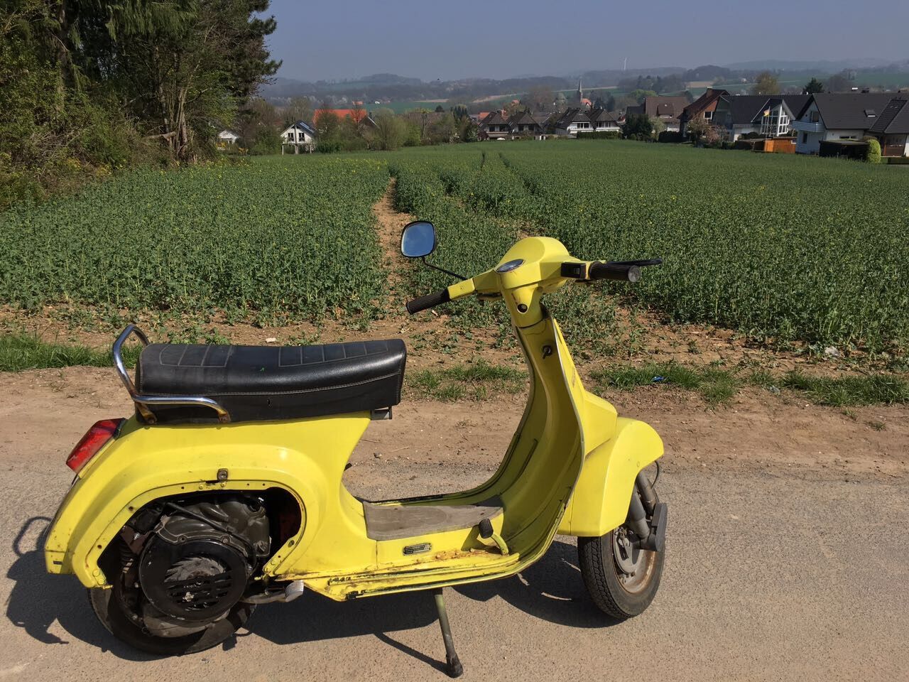 Da die Vespa 4 Jahre bei dem Vorbesitzer stand, habe ich ihr erstmal neues Öl und neuen Sprit draufgemacht und danach mit dem Original Setup alles getestet. Sie sprang nicht auf Anhieb an aber dann irgendwann nach ewigem Schieben die Straße hoch und runter schon. Ich dachte mir dann, du willst eh das Setup ändern, vielleicht beseitigest du dadurch schon den Fehlerteufel.