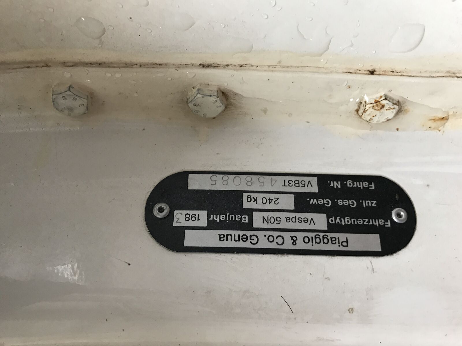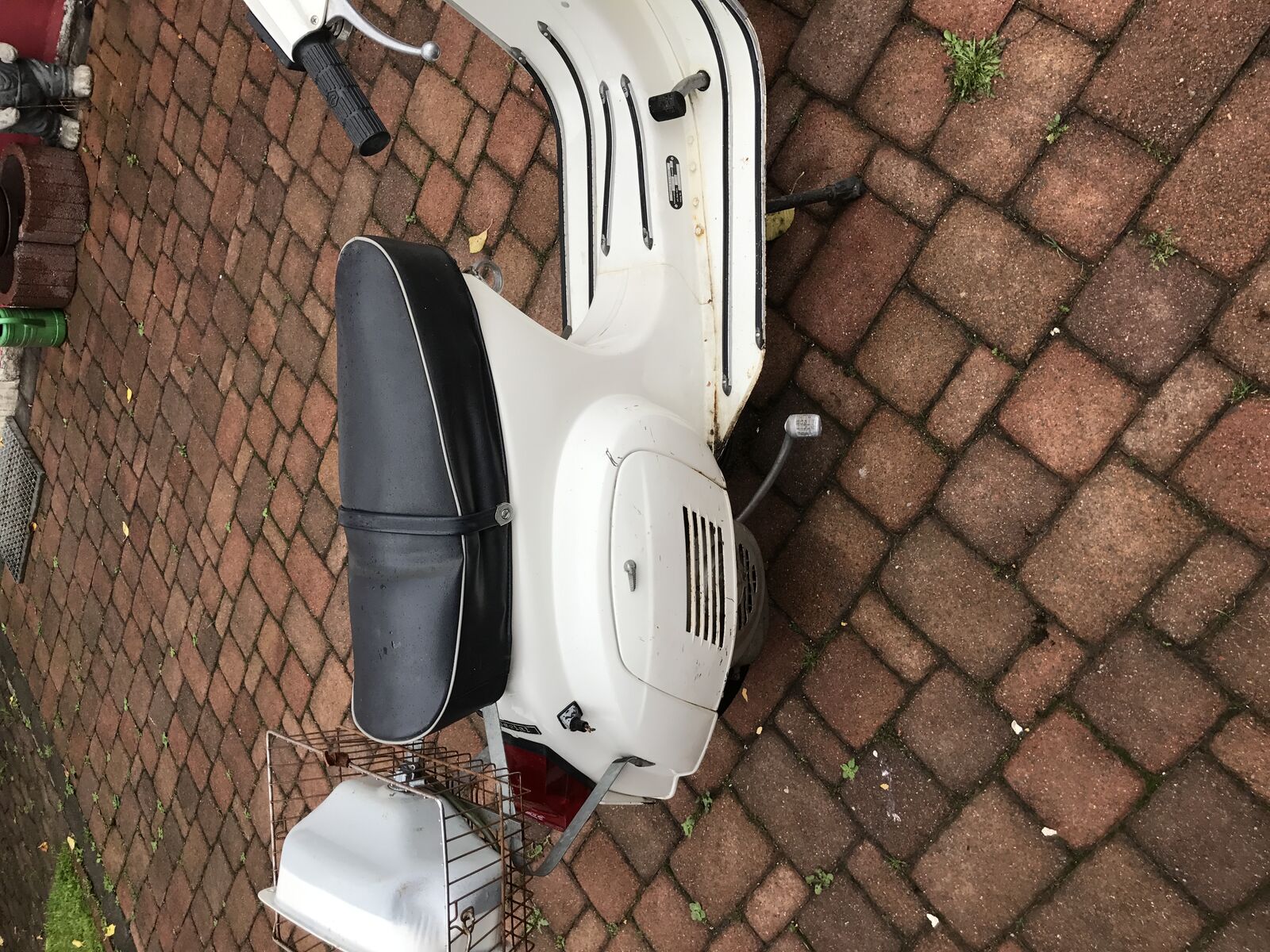 Die Vespa ist weiß, der Tank ist ausgebaut und verrostet, der Motor lässt sich durchdrehen, die Kickstarterwelle/Hebel rutscht durch und greift erst im unteren Bereich und bleibt dann unten hängen. Drei Blinker fehlen und die Seilzüge sind ziemlich schwergängig. Die Vespa stand trocken, hat hier und da ein bisschen Rost, ist im Innenraum aber trocken und ohne Rost.